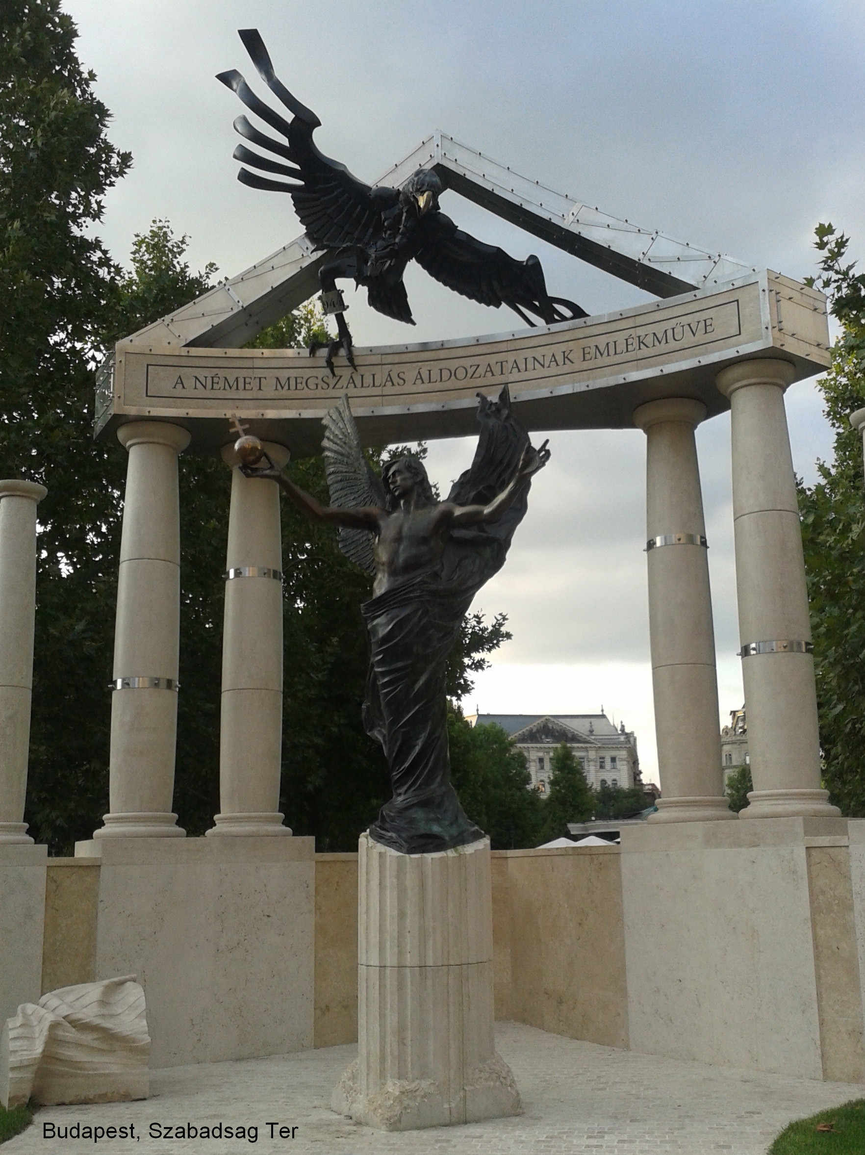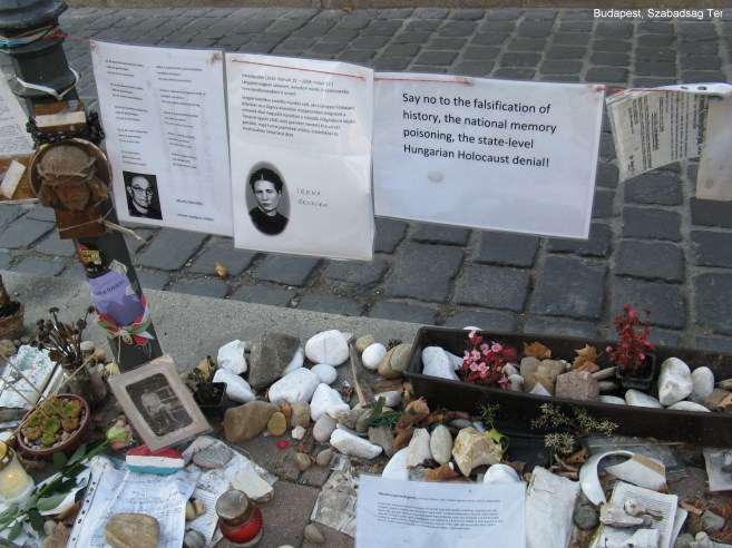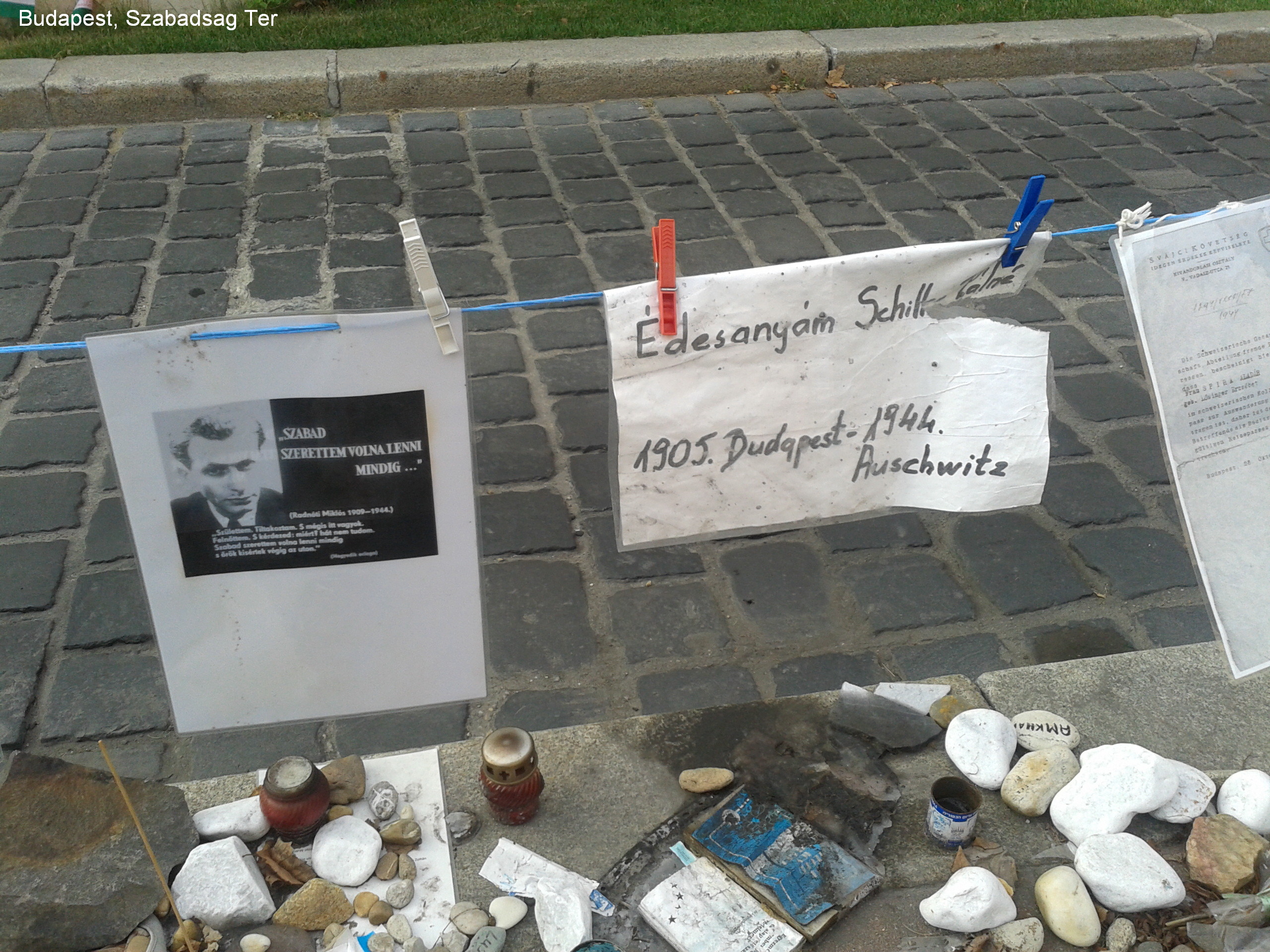 Ci sono anche molti messaggi scritti appesi ad una cordicella, ma purtroppo tutti in ungherese. All’inizio della fila, però, c’è un unico foglio scritto in inglese, un A4 all’interno di una busta di plastica, che spiega la storia del monumento e il perché di tutto questo. Lo leggo, e inizio a capire: gli oggetti non fanno parte del monumento, ma sono stati portati dalla gente di Budapest. Si tratta di un’azione di protesta pacifica contro il monumento e quello che rappresenta. Sì, perché l’Arcangelo Gabriele rappresenta l’Ungheria in una sorta di atto di dono, o di sottomissione, comunque in una posa da vittima innocente dell’aggressione dell’aquila, che rappresenta ovviamente la Germania. E le cose non andarono proprio così. Il regime ungherese dell’epoca, quello delle croci frecciate dell’Ammiraglio Miklos Horthy, faceva parte dell’Asse, era un fedele alleato della Germania hitleriana. In una delle foto si vede proprio lui, Miklos Horthy, in macchina insieme a Hitler, probabilmente durante una visita in Ungheria. L’occupazione militare nazista fu decisa d’accordo con il regime ungherese nel tentativo di frenare l’avanzata sovietica, e anche perché Horthy nel frattempo aveva tentato di negoziare una pace separata con gli Alleati. Quel regime fu quindi corresponsabile di tutti gli orrori della guerra, in particolare della deportazione nei campi di sterminio di quasi 500.000 ungheresi, per la maggior parte ebrei ma anche rom, omosessuali, prigionieri politici.
