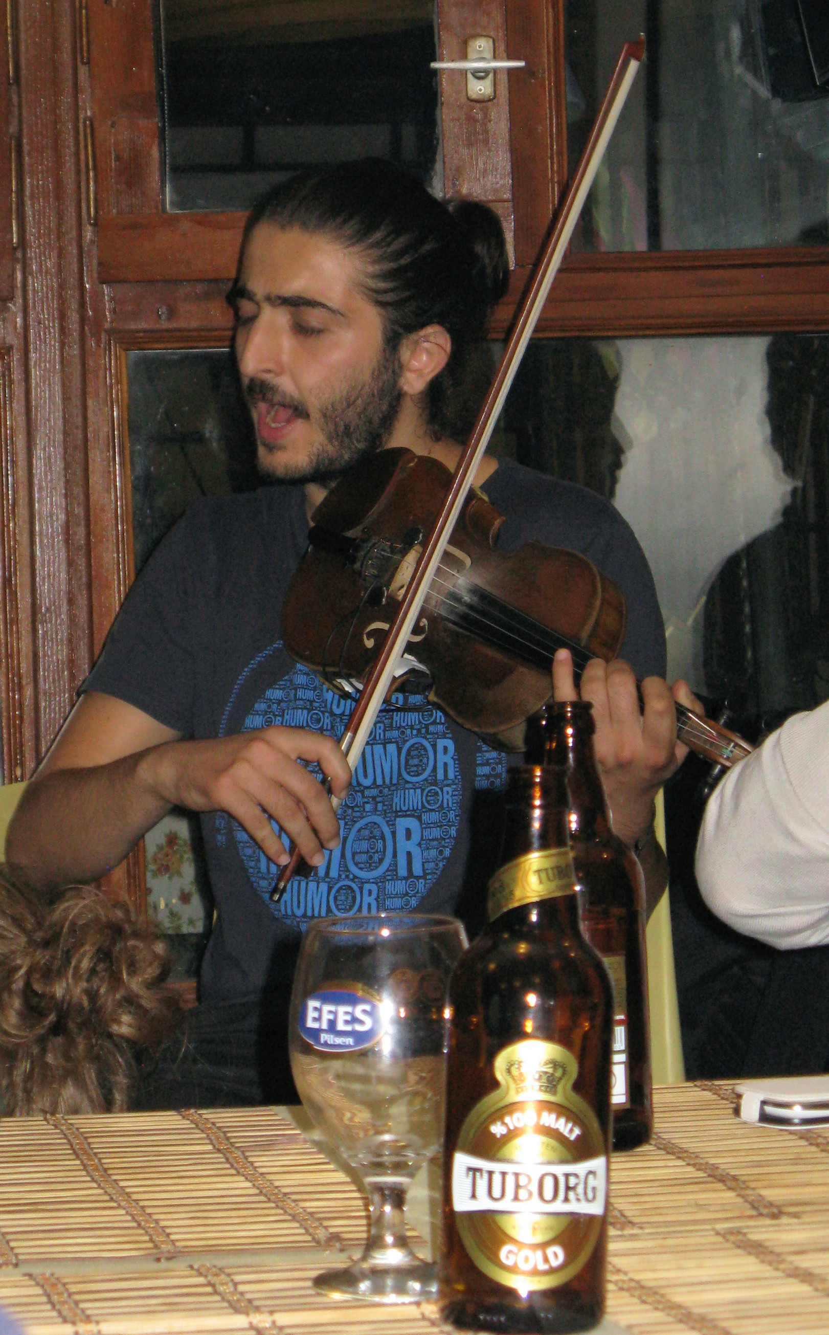 E arriva il momento del concerto. Michelangelo suona il contrabbasso. Mübin Dünen, curdo, canta e suona il santur, un antico strumento a corde persiano, antenato del pianoforte, dove i martelletti per percuotere le corde si usano a mano e non sono azionati dai tasti. Poi ci sono la chitarra, il violino, che non può mancare, e uno strumento a percussione simile al cajon. Il genere pesca a piene mani dalla tradizione popolare turca e curda (senza disdegnare influenze rom), ma la arricchisce di nuovi suoni.