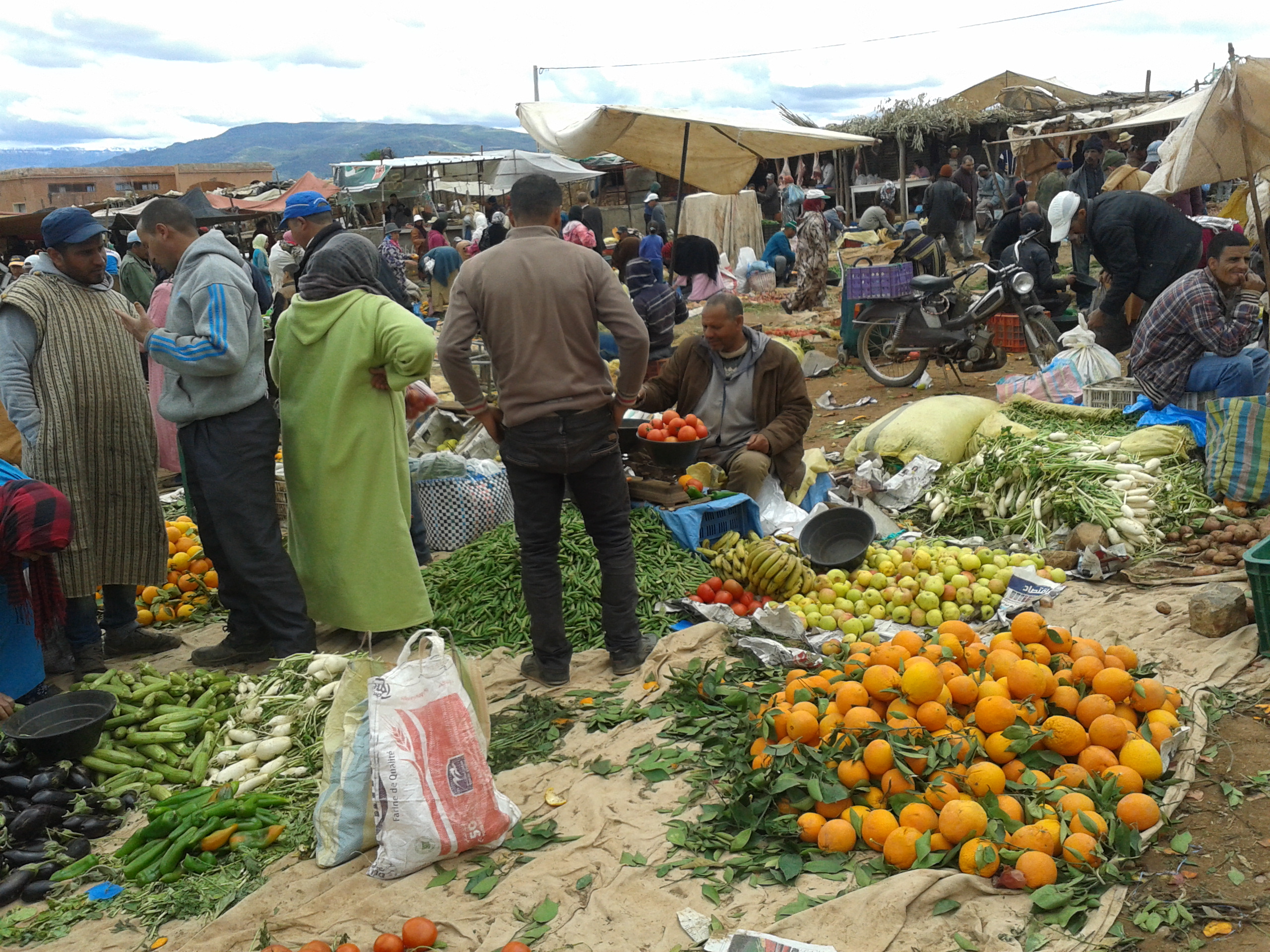 Pranziamo a Demnate, compriamo le medicine per la tosse di Abdel Ghafour e poi, tornando, decidiamo di fermarci al souk di Tanant, anche perché Salah deve fare un po’ di spesa. È un souk molto grande ed estremamente popolare, che non ha nulla a che vedere con quelli ormai un po’ turistici che si vedono nelle grandi città. Questo è totalmente autentico, anche perché per quanto posso vedere sono l’unico straniero. Si vedono scene della serie “Ho visto cose che voi umani…”, come una decina di galline vive ammassate in un carretto, o due agnellini vivi e disperatamente belanti spinti a forza nel bagagliaio di una macchina. Diciamo che non è un posto che farebbe la gioia degli animalisti, ma qui le preoccupazioni sono altre.