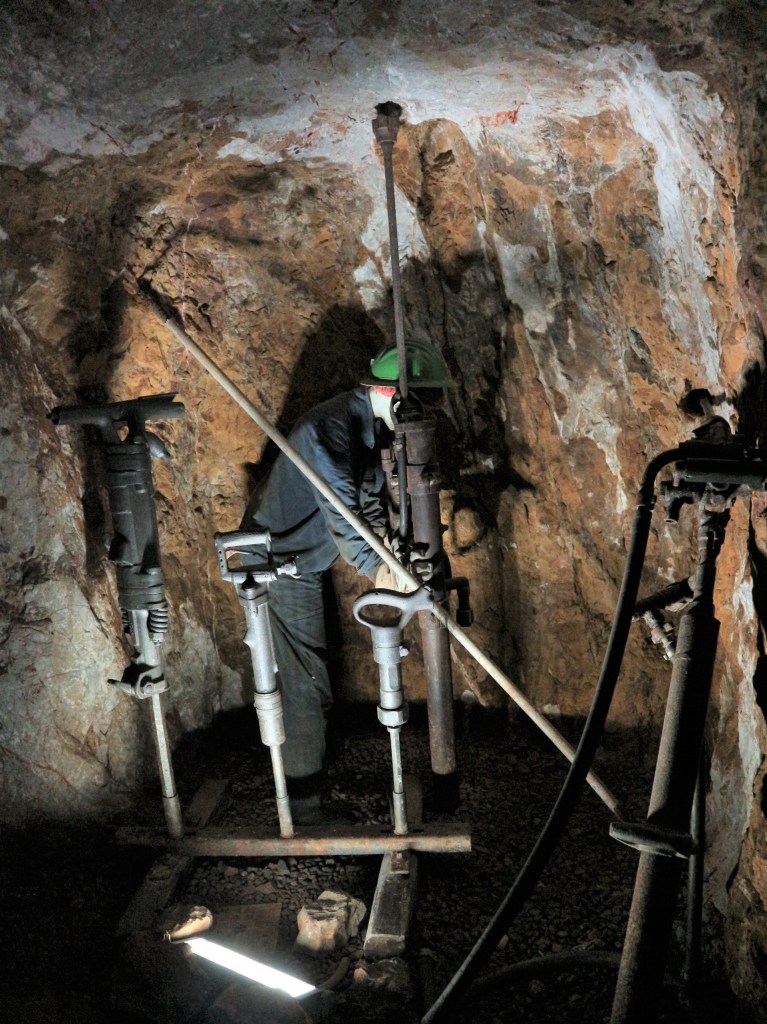 Anche qui la lampada a carburo era la fedele compagna dei minatori che non solo faceva luce ma, con il cambio di colore della fiamma verso il celeste, segnalava anche la scarsità di ossigeno. I martelli ad aria compressa che si possono vedere qui sono del modello T21, dove 21 erano i kg di peso dello strumento, che veniva appoggiato a seconda dei casi sulla spalla, sul fianco o sulla gamba. Solo nel 1950 fu introdotto il servosostegno, che rappresentava almeno un aiuto in questo senso. Lavorando a secco, ovviamente si respirava una grande quantità di polveri di silice, con conseguente grande incidenza della silicosi tra i minatori. Per ovviare a questo problema fu introdotto un sistema idraulico. Pensato per i minatori, per agevolarne il lavoro e proteggerne la salute? Non proprio. Fu introdotto perché il surriscaldamento del fioretto che lavorava sulla roccia portava a un consumo molto rapido del fioretto stesso, quindi costi per l’azienda. Come svantaggio, però, l’uso del sistema idraulico comportava dover lavorare con le gambe immerse in acqua per gran parte del tempo; per questo i minatori avevano anche spesso malattie reumatiche. E poi c’era una patologia dal nome davvero strano: la generosi. Si tratta in realtà del nome dato dai minatori a una malattia che si chiama angioneurosi e che porta alla perdita di sensibilità in particolare degli arti superiori, dovuta alla rottura di legamenti e al consumo delle cartilagini causato dalle vibrazioni a cui i lavoratori erano costantemente esposti. Un nome troppo difficile per persone con un livello di scolarità basso o nullo, che quindi lo avevano “semplificato” in “generosi”. Ancora oggi, se si chiede agli anziani di qui che conoscono la vita di miniera, si ricordano sempre di uno zio che “teniat sa generosi” (aveva la generosi).