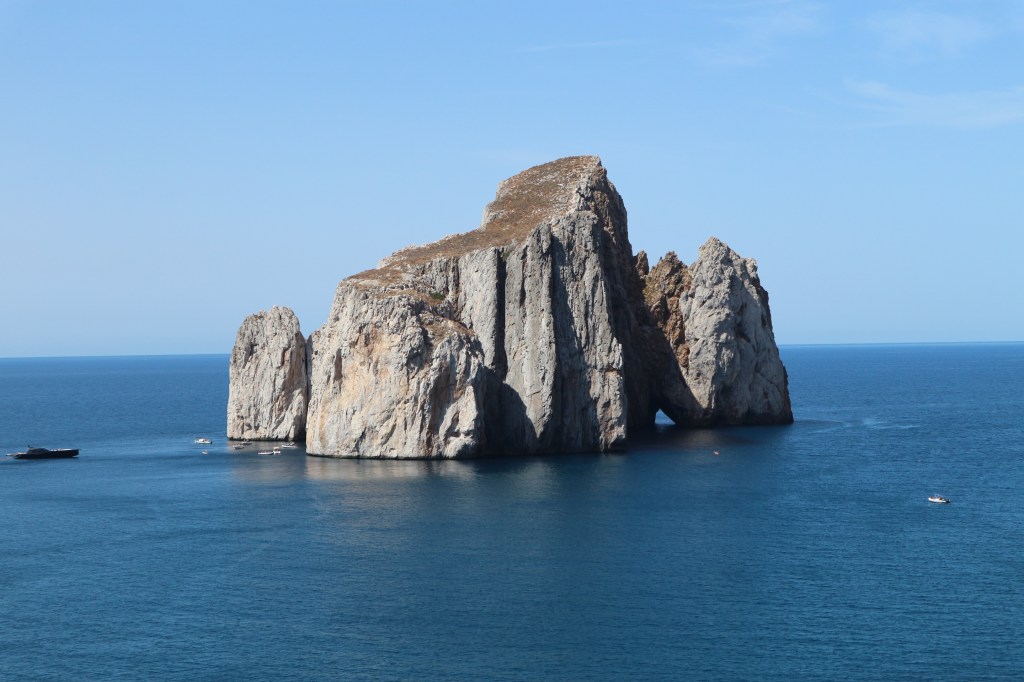 Uscendo dalla galleria, ci troviamo di fronte l’incredibile spettacolo del Pan di Zucchero, con i suoi 133 m il faraglione più alto del Mediterraneo.