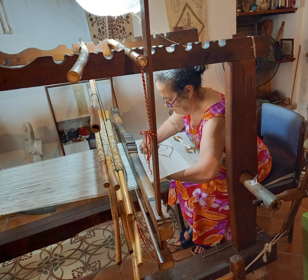 Il bisso è un particolarissimo e antichissimo tessuto, di cui Chiara Vigo si considera l’ultima maestra (anzi lei dice “maestro”) vivente. Abbiamo scoperto poi che la questione è parecchio controversa, perché lei ha avuto negli ultimi anni pesanti screzi con il Comune di Sant’Antioco e perché ci sono altre due donne di Sant’Antioco, le sorelle Pes, che sostengono di essere anche loro maestre dell’arte del bisso almeno quanto Chiara Vigo, che forse è solo più brava a far parlare di sé e ad accreditarsi come unica depositaria di questo prezioso sapere. Io non lo so, onestamente non ho approfondito più di tanto; ve la butto lì, se volete provateci voi a dirimere la questione. Comunque, sembra che la rottura definitiva tra Chiara Vigo e l’allora sindaco sia dovuta a uno sgarbo fatto da lei in occasione di una visita del ministro dei Beni Culturali Franceschini, per il quale si sarebbe rifiutata di aprire appositamente il suo museo. Non so se sia vero ma potrebbe essere, considerato che è noto a tutti a Sant’Antioco il carattere non proprio “malleabile” di Chiara. Di sicuro, anche ascoltandola per una mezz’oretta o poco più, si capisce che ha un’altissima opinione di sé, per così dire. Fatto sta che nel 2016 le è stato tolto l’uso dei locali dello storico palazzo del Monte Granatico, ufficialmente per via dell’impianto elettrico non a norma. Lei, però, ha riaperto un piccolo museo in quella che definisce “la stanza che fu il laboratorio di mia nonna”, a pochi passi dalla Basilica di Sant’Antioco, grazie alle donazioni e senza alcun contributo pubblico.
