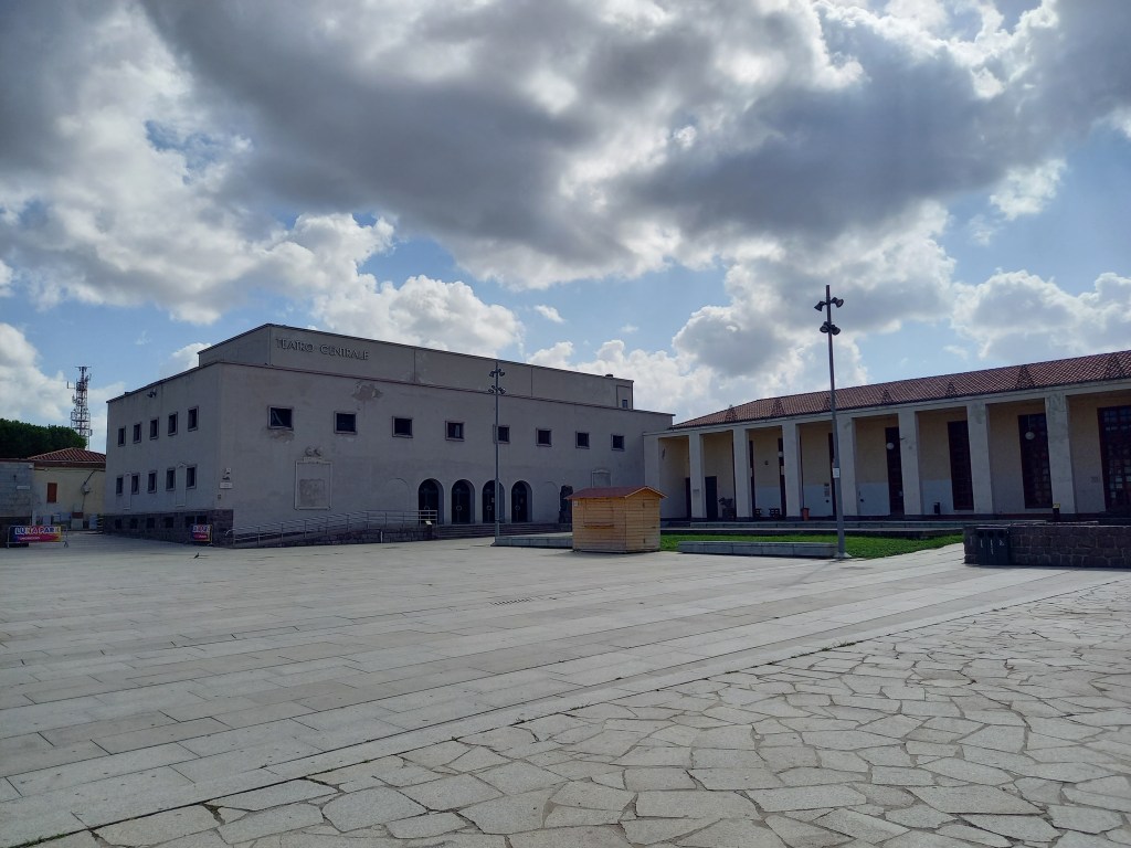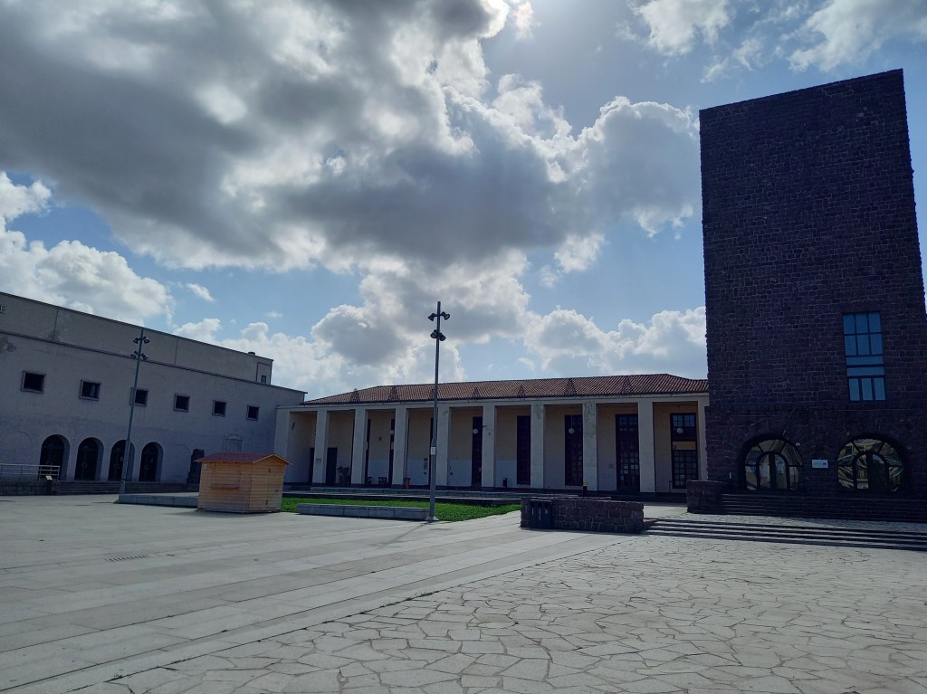 Carbonia, oggi capoluogo della provincia del Sud Sardegna con 26.000 abitanti, è una città costruita intorno alla miniera, con un’impronta tipicamente razionalista, dovuta ovviamente al periodo: la città fu fondata nel 1937 e fortemente voluta dal regime fascista come uno dei suoi fiori all’occhiello. Prima ancora di andare alla miniera, noi ci fermiamo nella centrale piazza Roma, dove questo è di un’evidenza totale. Sulla piazza si affacciano la Torre Civica, il Teatro Centrale, il Dopolavoro Centrale e il Palazzo Municipale (i primi tre sono dello stesso architetto, Gustavo Pulitzer Finali). La Torre Civica, alta 27,5 metri, è il primo edificio della città, dove nelle fondamenta fu deposta la “prima pietra” il 9 giugno 1937 e nota come Torre Littoria durante il regime fascista; da questo edificio Benito Mussolini pronunciò il discorso di inaugurazione della città il 18 dicembre 1938. Nata come casa del fascio, fu utilizzata per vari scopi nel corso degli anni, fu tra le altre cose sede della Pretura sino agli anni settanta. Oggi ospita alcuni uffici comunali.