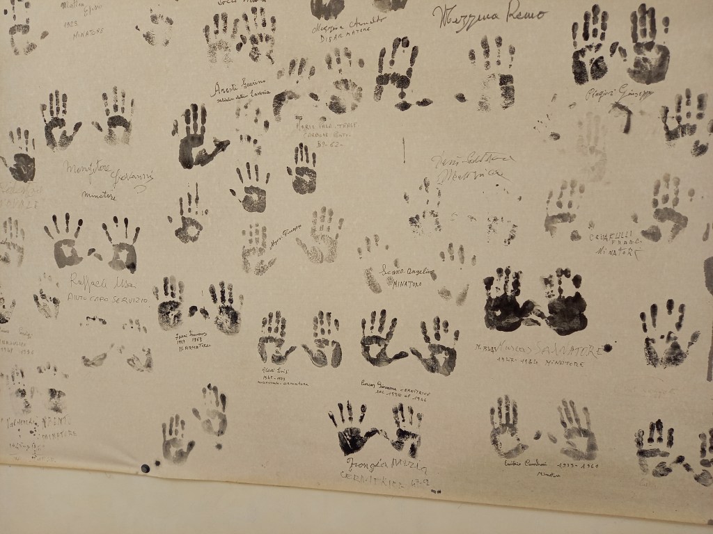 Nell’occasione alcuni ex-minatori della Miniera di Serbariu hanno apposto l’impronta delle mani e la firma su un grande telo bianco. Da allora il telo si trova in uno dei locali delle docce nella lampisteria, pronto ad accogliere altre firme ed impronte degli anziani minatori di Serbariu che si recano a visitare il Museo.