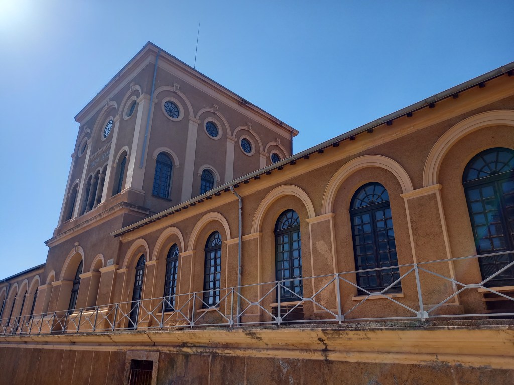 Lasciata Carbonia, ci aspetta l’ultimo pranzo tutti insieme, con l’ultimo piatto di malloreddus,e poi ci dirigiamo all’ultima miniera di questo tour: Monteponi, nel comune di Iglesias. Qui a farci da guida è Michele Pinna di Sulcis Hiking & Bike, esperto di cammini ma anche grande conoscitore della storia di questa miniera. È l’ideale, perché qui non scenderemo sottoterra ma, pur restando… in superficie, ci faremo una bella passeggiata a piedi tra i luoghi più significativi di questo che è anche un parco geominerario.