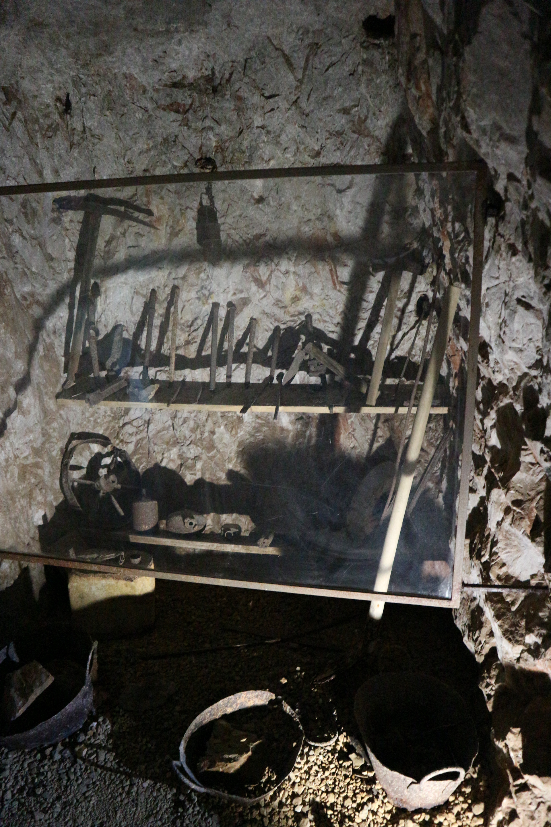 Durante il suggestivo percorso all’interno della galleria, la guida ci racconta la storia della miniera, a partire dalle prime ricerche fatte per valutare le potenzialità estrattive del sito. Si sapeva da tempi lontanissimi (sembra che i primi tentativi primordiali di estrazione risalgano al neolitico) che la Sardegna, e questa zona in particolare, era ricca di minerali, ma per esserne sicuri in qualche modo bisognava provare a sondare la roccia. Come si faceva? Le zone ritenute interessanti venivano portate ad alta temperatura con dei grandi fuochi, e poi altrettanto velocemente si raffreddava la roccia buttando acqua fredda. Lo shock termico spaccava la roccia, permettendo di dare le prime picconate. Anche oggi, in fondo, la procedura non è cambiata di molto. Nel piccolo museo realizzato all’interno della galleria si può vedere un piccone del 1200, di epoca pisana, a testimonianza che già nel medioevo c’era un’attività estrattiva.