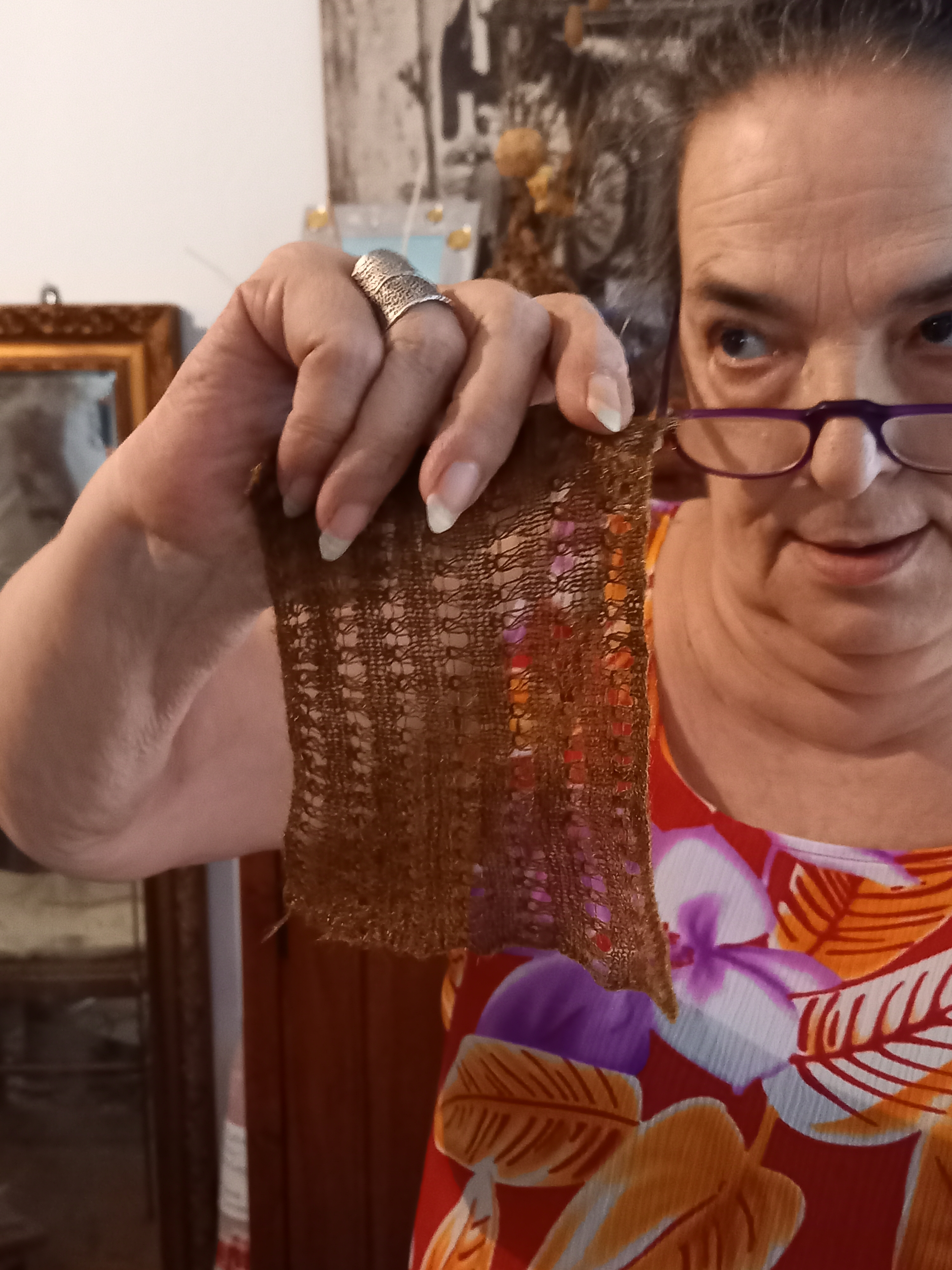 Chiara ha un modo di parlare della sua arte sicuramente capace di affascinare: il suo atteggiamento a tratti diventa quello di una vera sacerdotessa, con toni quasi da profetessa. Poi facilmente divaga, parlando della sua arte parla di tutto, dal Covid-19 (sul quale pare abbia un approccio quanto meno scettico) ai suoi rapporti con il sindaco, altri maggiorenti locali, gli studenti (vanta diverse collaborazioni con università di mezza Europa). In certi momenti si fa anche fatica a seguirla, perché senza preavviso tira fuori citazioni bibliche o sciorina nomi e fatti locali, a noi ignoti, come se dovessimo conoscerli. Probabilmente quello a cui abbiamo assistito è un’esibizione che si ripete da anni, ma che è anche ogni giorno diversa. Lei dà per scontato – credo – che se le persone sono lì abbiano voglia di ascoltarla e siano anche armate di pazienza per poter aspettare che, tra una divagazione e l’altra, lei spieghi la sua arte. È un rituale che, per quanto abbiamo potuto vedere, può durare ore. Noi però tanto tempo in realtà non l’avevamo, per cui abbiamo potuto assistere in pratica solo al “miracolo” che consiste nel vedere il bisso che, dal suo colore naturale, se esposto alla luce diventa splendente come oro. Chiara sostiene che ciò è dovuto a una trasformazione che il tessuto subisce per effetto della sua voce quando lei lavorando canta canzoni antiche, ma – detto tra noi – è più probabile che sia l’effetto del trattamento con alcune sostanze, che sono sicuramente naturali ma che, attraverso un processo chimico, conferiscono al tessuto questa proprietà. Lei si definisce una “alchimista”, che fa cose che la chimica non riesce a fare, ma diciamo che questo fa parte del personaggio. Va presa così com’è.