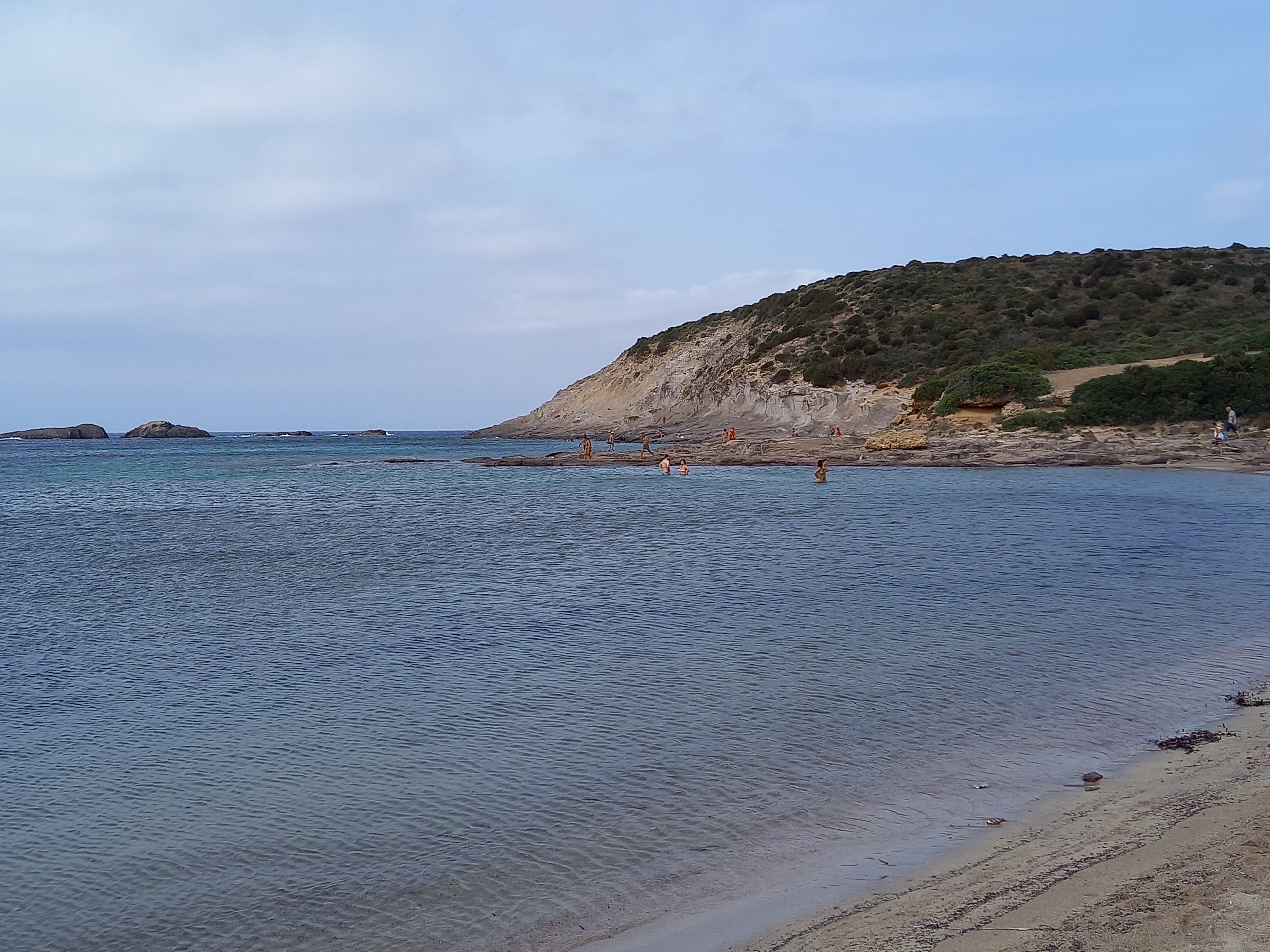 Oggi ho deciso di concedermi anch’io ancora un po’ di spiaggia, perché probabilmente sarà l’ultimo bagno di questa stagione: domani abbiamo in programma le ultime due miniere e poi il rientro a Cagliari, quindi non ci sarà tempo. Si va a Cala Sapone, che è la spiaggia più facilmente raggiungibile, anche con un bus (purtroppo non molto frequente, soprattutto nel pomeriggio), da Sant’Antioco, ma è comunque una spiaggia molto piacevole, anche se col caldo di oggi lo è un po’ meno: è da ieri che soffia lo scirocco, e come sanno da queste parti significa che il caldo può essere micidiale. Oggi, in realtà, soffia meno ma proprio per questo si soffre di più: soprattutto dopo pranzo l’aria è ferma e il sole è rovente. Insomma siamo tutti un po’… sciroccati.