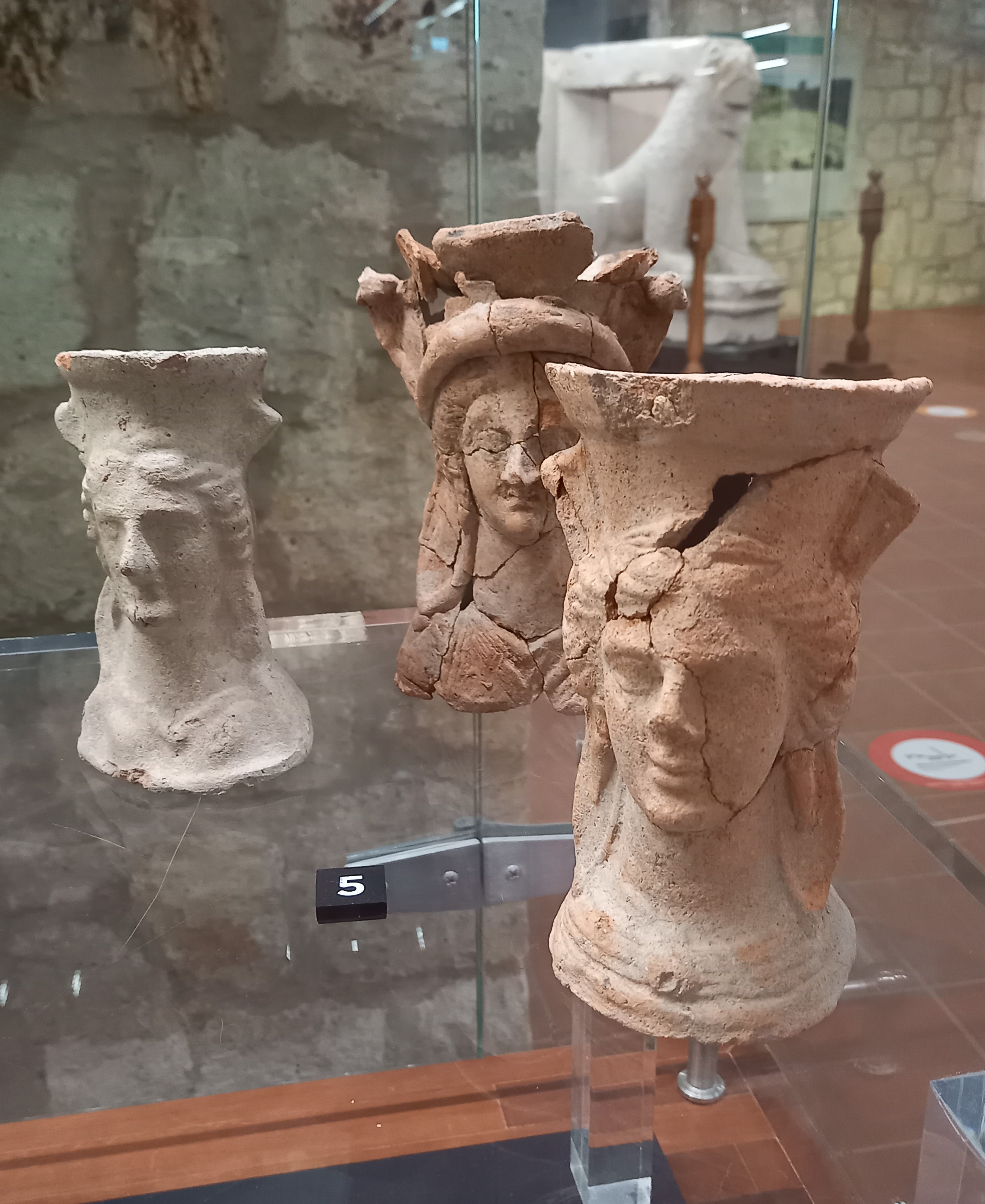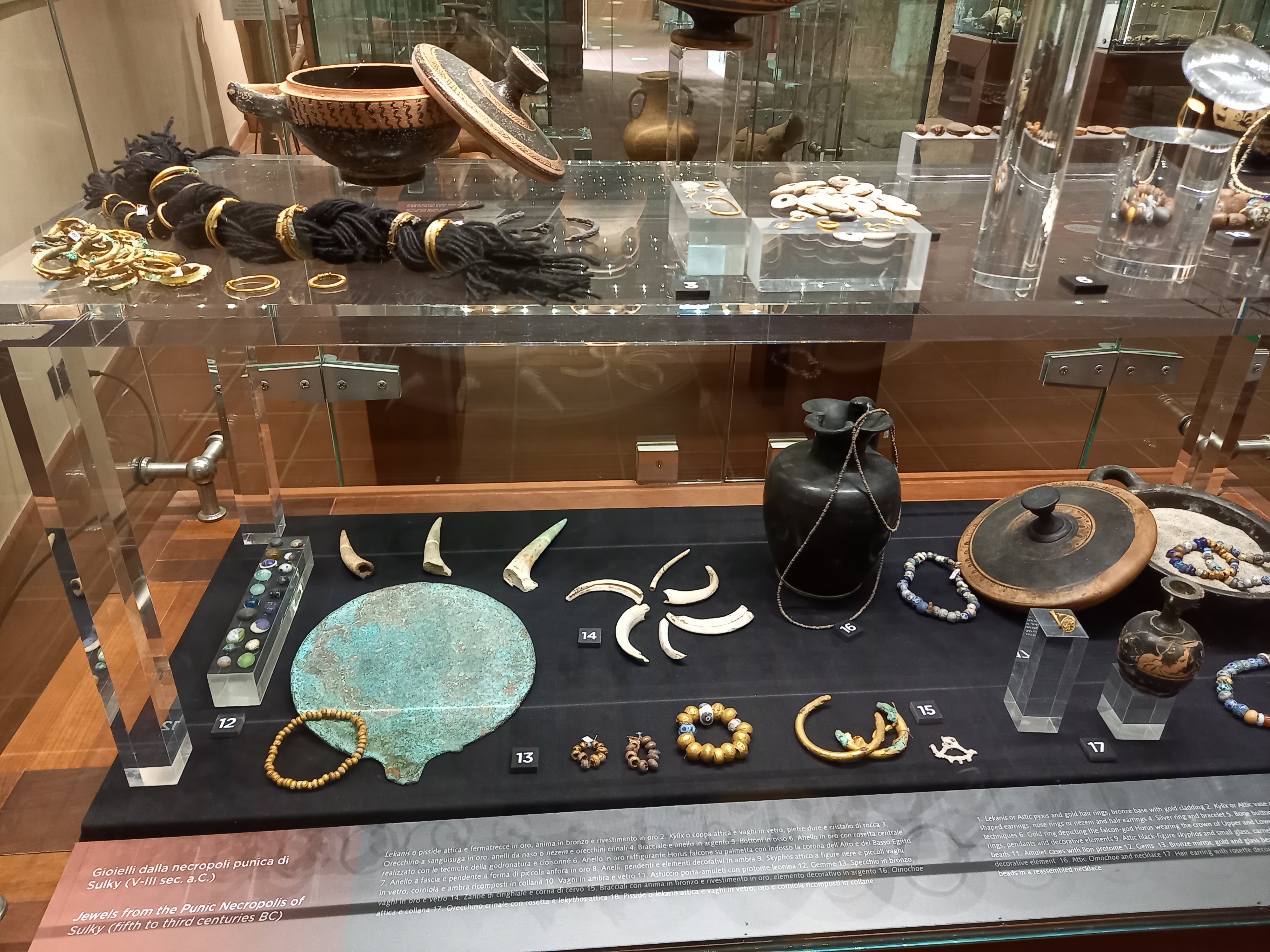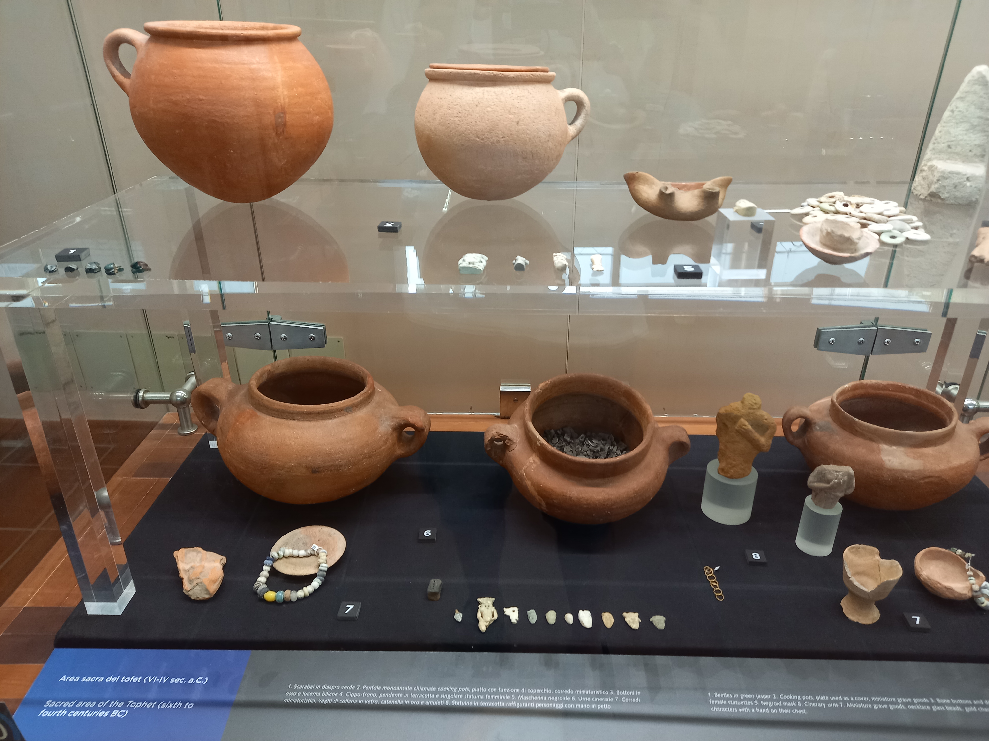 Per la visita al museo si parte dal tofet punico, che fa parte di una più ampia area archeologica che richiederebbe molto più tempo. Il tofet (termine di origine ebraica che compare nell’Antico Testamento) è un’area sepolcrale destinata ad accogliere le sepolture di una particolare categoria di defunti: i bambini nati morti o deceduti in tenera età. Per lungo tempo gli studiosi, condizionati dalle fonti greche e latine, hanno ritenuto che fosse il luogo preposto ai sacrifici cruenti dei primogeniti immolati alla divinità, tanto che il tofet era diventato il simbolo della crudeltà e dell’implicita inferiorità della civiltà fenicio-punica. Solo in anni più recenti, a partire dagli anni ’80 del secolo scorso, si è accertato che in realtà si trattava, sostanzialmente, di propaganda contro quella civiltà. Dalle analisi osteologiche, infatti, è emerso, qui come in altri tofet punici (ad esempio quello di Tharros), che i resti erano riconducibili a feti o bambini deceduti entro i due anni, e privi di qualsiasi segno di morte violenta. Oggi si sa che quei resti, sepolti in pentole di terracotta, facevano parte di un santuario che serviva a invocare la benedizione divina per nuove nascite, che era parte integrante del rituale, in un’epoca in cui la grande mortalità infantile rende irrealistico il sacrificio sistematico di un numero considerevole di vite umane.