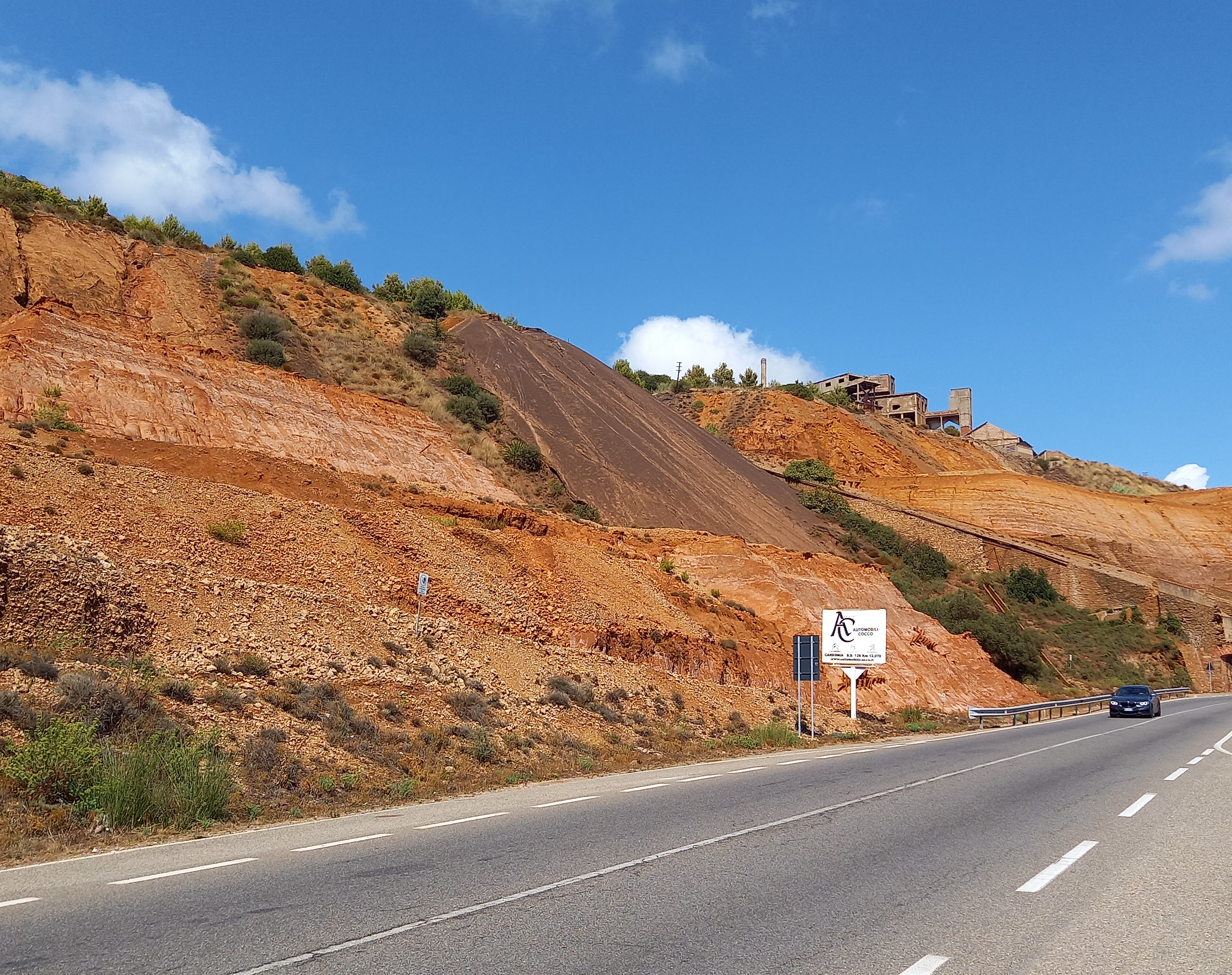 Come e quanto la miniera abbia influenzato il paesaggio di questo territorio lo si capisce già fermandosi per un attimo sul ciglio della strada Statale 126 a guardare gli accumuli di fanghi rossi che da decenni sono diventati lo scenario di questo pezzo di Sardegna. Nei pressi di Iglesias sorgono infatti le imponenti discariche, per certi aspetti monumentali, note con il nome di Fanghi Rossi. Da qui si estendono per un tratto di circa un chilometro; catturano l’attenzione dei passanti per la loro colorazione rosso-arancio nelle giornate soleggiate, virando al rosso cupo nelle giornate umide. La discarica dei fanghi rossi è una testimonianza delle attività metallurgiche degli impianti della miniera di Monteponi. Dobbiamo la loro presenza all’Impianto di Elettrolisi che dal 1926, per circa mezzo secolo, ha recuperato lo zinco con un processo chimico-fisico: la colorazione rossa è legata alla presenza di notevoli quantità di ferro.