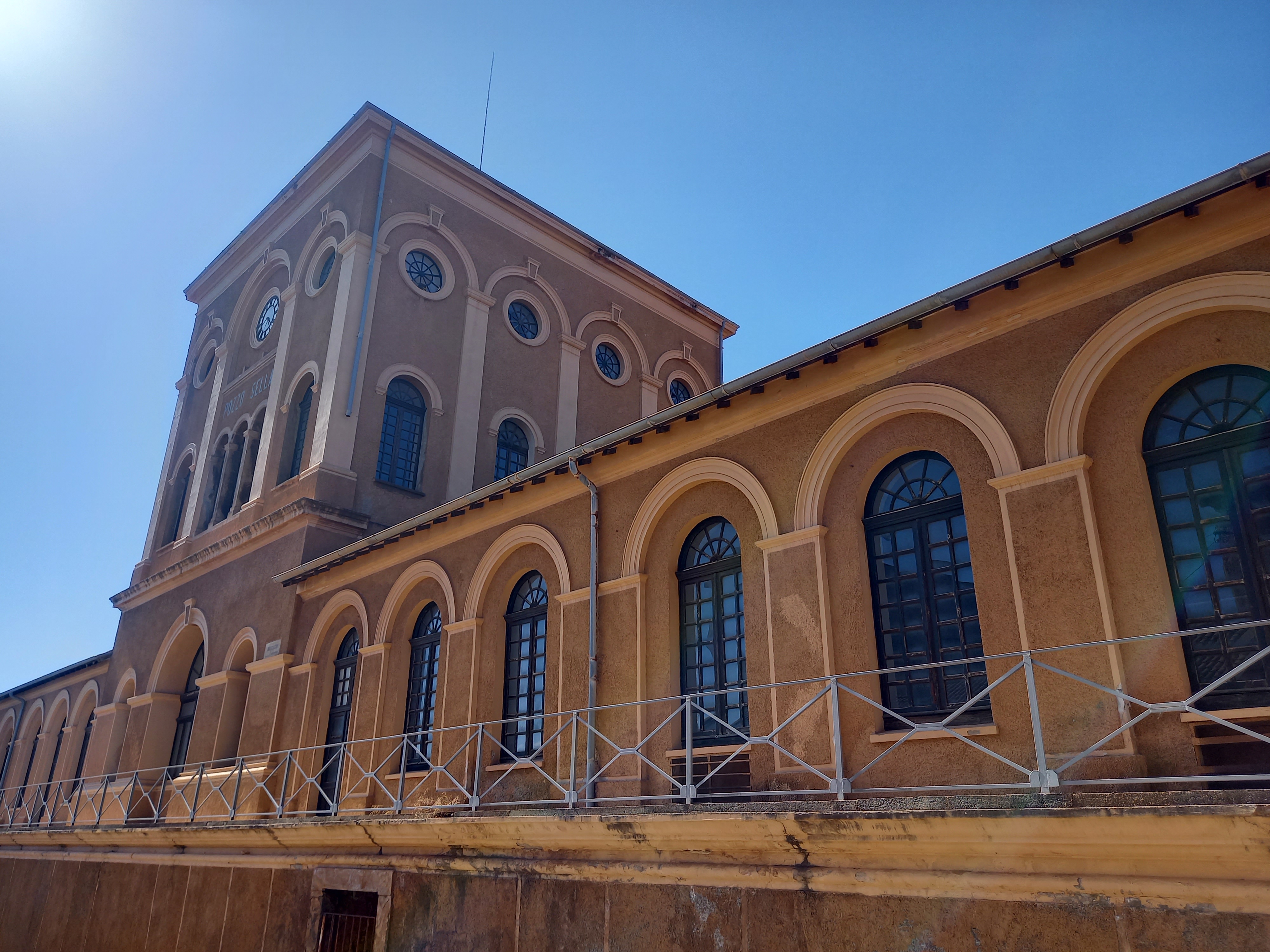 Carbonia, oggi capoluogo della provincia del Sud Sardegna con 26.000 abitanti, è una città costruita intorno alla miniera, con un’impronta tipicamente razionalista, dovuta ovviamente al periodo: la città fu fondata nel 1937 e fortemente voluta dal regime fascista come uno dei suoi fiori all’occhiello. Prima ancora di andare alla miniera, noi ci fermiamo nella centrale piazza Roma, dove questo è di un’evidenza totale. Sulla piazza si affacciano la Torre Civica, il Teatro Centrale, il Dopolavoro Centrale e il Palazzo Municipale (i primi tre sono dello stesso architetto, Gustavo Pulitzer Finali). La Torre Civica, alta 27,5 metri, è il primo edificio della città, dove nelle fondamenta fu deposta la “prima pietra” il 9 giugno 1937 e nota come Torre Littoria durante il regime fascista; da questo edificio Benito Mussolini pronunciò il discorso di inaugurazione della città il 18 dicembre 1938. Nata come casa del fascio, fu utilizzata per vari scopi nel corso degli anni, fu tra le altre cose sede della Pretura sino agli anni settanta. Oggi ospita alcuni uffici comunali.