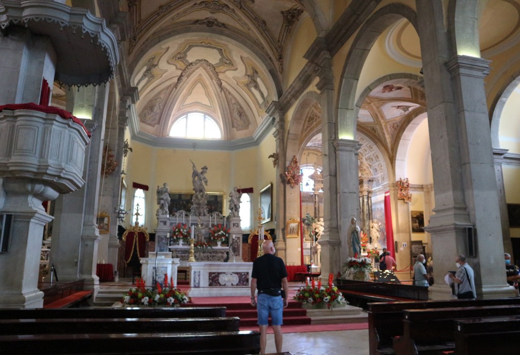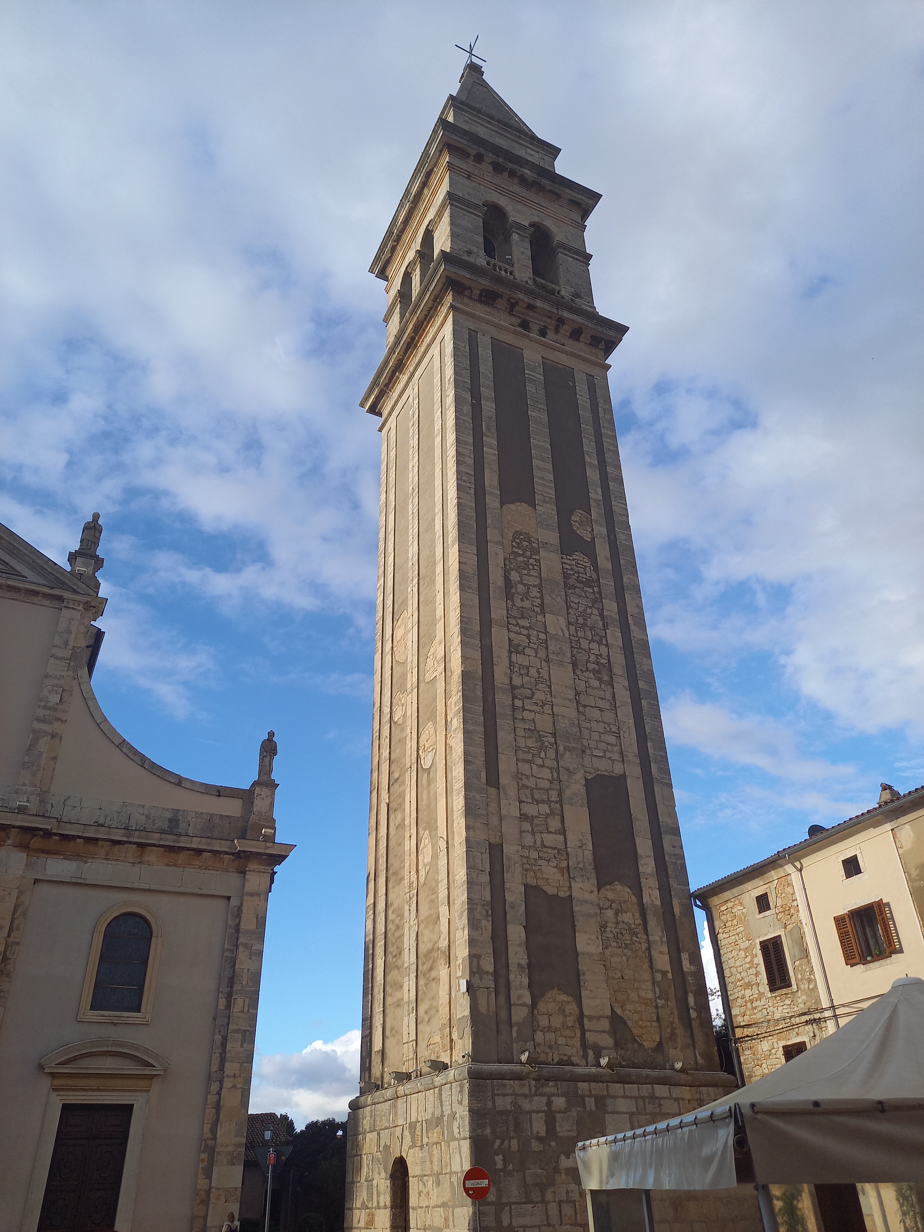 Questa chiesa è il più bell’esempio di barocco istriano del Settecento e la chiesa più grande dell’Istria. “Non fatevi ingannare dai bùmbari che vi diranno che la loro è più grande” – ecco un’altra perla di Marino – “Loro hanno solo il campanile più alto!”. Ma chi saranno mai questi bùmbari? Non posso ancora svelarvelo, per adesso. Questa è solo la prima anticipazione di quello che diventerà un piccolo tormentone della giornata, e di questo viaggio. “Più alto, ma non più bello” – ci tiene a precisare. Questo è proprio un campanile tipico veneziano, che ha lo slancio verticale determinato da delle false lesene, il loggione campanaro posto a due terzi dell’altezza e la cuspide. Tutti i campanili veneziani finiscono con una cuspide, ma questo, pur venezianissimo, ha una sua particolarità che è anche una specie di punto di contatto con Milano: spieghiamo perché. La chiesa è stata rifatta completamente dal 1725 al 1736: allargata, innalzata e rifatta in stile barocco. Prima era una chiesa molto più piccola, del X secolo, con tre cupole che ora sono sparite. Ora c’è questa falsa facciata, che nasce dal fatto che gli architetti si accorsero che, ingrandendo e insieme innalzando di tanto la chiesa, questa sarebbe potuta crollare; allora la abbassarono rispetto al progetto originale, ma così non era molto elegante e perciò fecero un rialzo di circa tre metri che fa sembrare la facciata più alta. Ma, venendo al campanile, questo fu costruito prima, dal 1654 al 1687, e ci lavorarono solo architetti milanesi. A Milano tutti i palazzi più alti del Duomo costruiti in successione (il Pirellone, Palazzo Lombardia e la torre Isozaki) hanno sul loro tetto una piccola Madonnina, perché per tradizione la Madonnina deve stare nel punto più alto di Milano, nulla può superarla. Qui tutto è più piccolo di Milano, ma la statua di Sant’Eufemia che troneggia sul campanile è più grande della Madonnina: 4,70 metri contro 4,10.