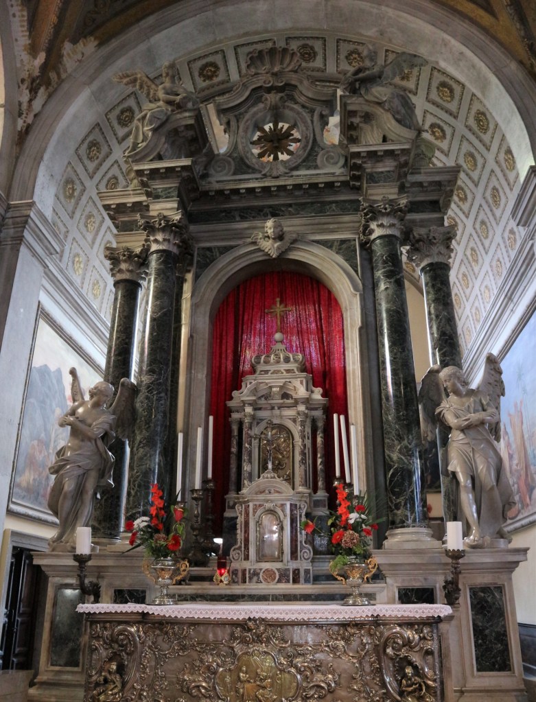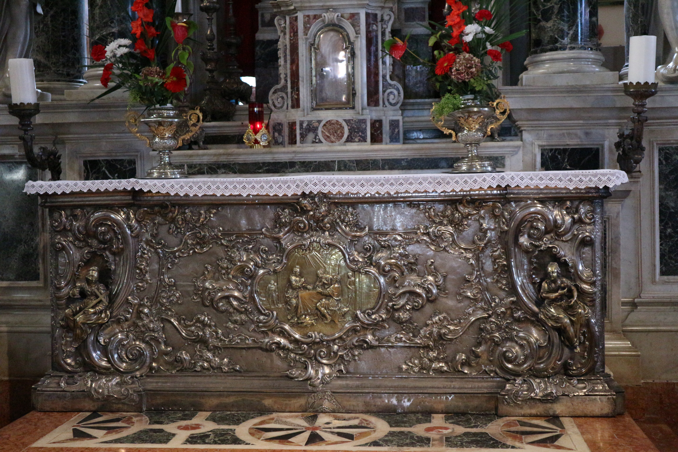 Per quanto riguarda l’interno della chiesa, la sua principale particolarità è quella di avere tre altari a giorno, cioè che non si trovano sulla parete ma si ergono davanti e staccati da essa. Gli altari sono opera del più grande altarista del ‘700, Girolamo Laureato. Le statue di San Marco, San Giorgio e San Rocco sull’altare maggiore sono invece opera di Alvise Tagliapietra, uno dei più grandi scultori veneziani del ‘700. Ci sono anche otto altari laterali con bellissime pale d’altare. L’altare del SS. Sacramento è riccamente rivestito in marmo, particolarmente belle le sue colonnine e gli angeli, splendido il paliotto sbalzato in argento con la scena centrale in oro del 1777 forgiato nelle officine veneziane, un’opera fondamentale dell’argenteria veneta. Il paliotto è una tavola, in questo caso in argento, che copre l’altare per abbellirlo. Questo raffigura il celebre episodio evangelico della cena di Emmaus.