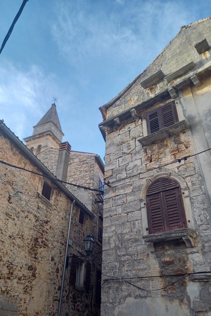Tra una curiosità e l’altra le nostre gambe non hanno ceduto e siamo saliti fino al punto più alto del nucleo storico, dove sorge la chiesa di Sant’Eufemia. Da qui, sulla sommità del colle, lo sguardo si perde nel blu del mare a nord fino allo splendido arcipelago delle Brioni, mentre dal lontano nord-ovest emergono le Prealpi.