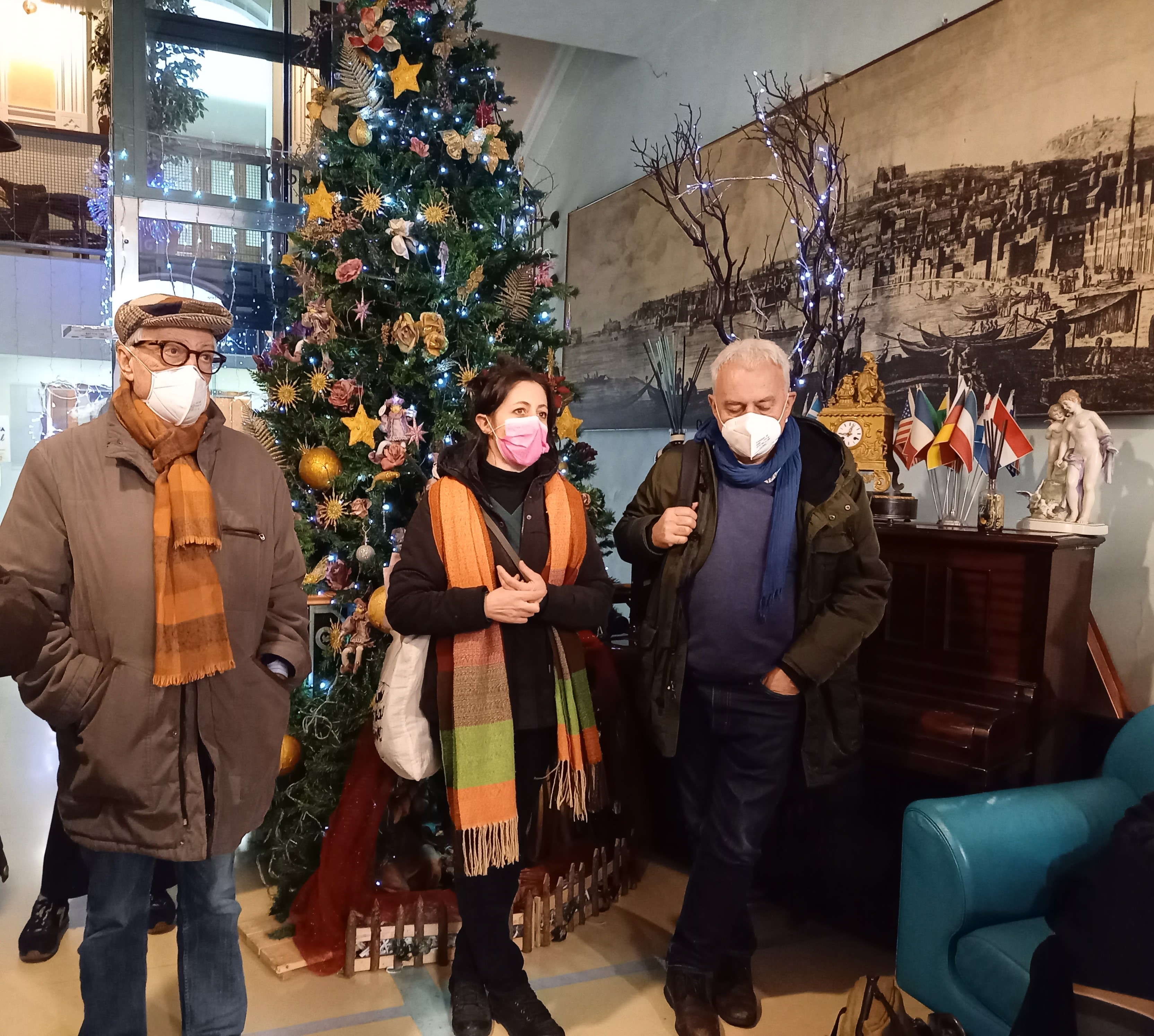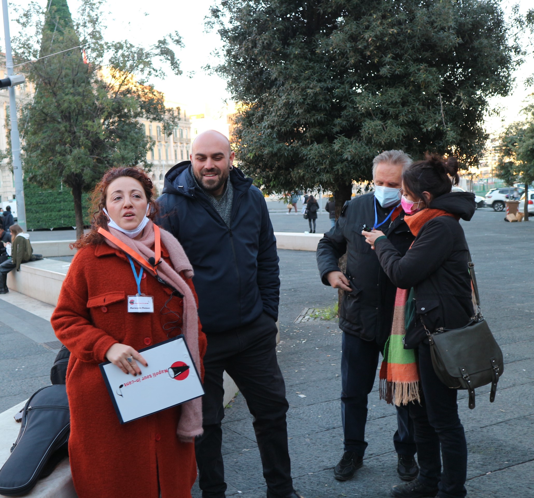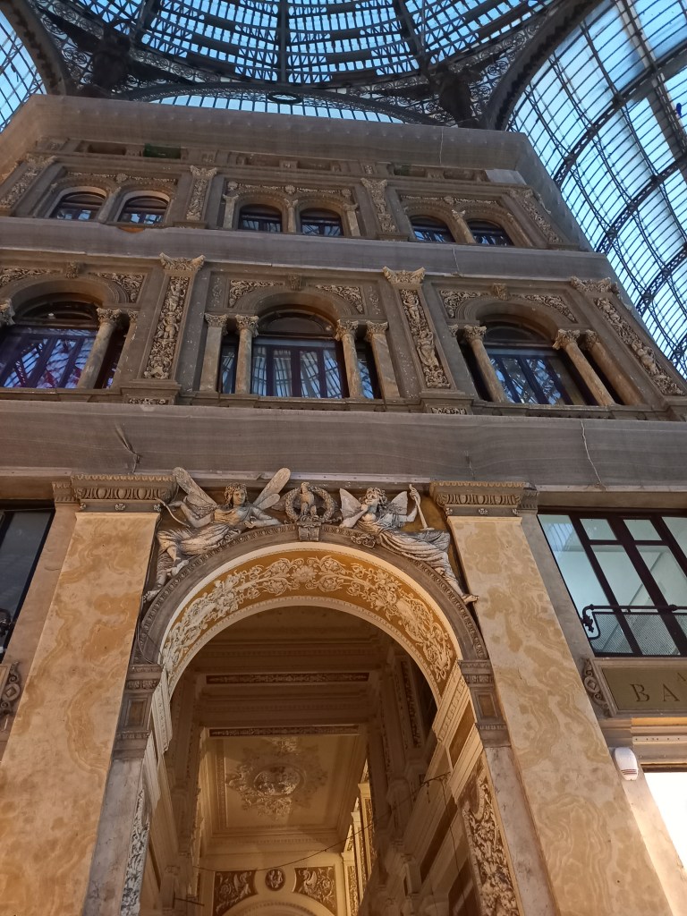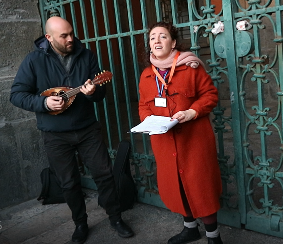 Partiti presto in treno da Milano, ci siamo rifocillati con una pizza salsiccia e friarielli per entrare al più presto nel mood e, conosciuta Stefania, siamo pronti per iniziare un tour il cui titolo è tutto un programma: Napoli tour in-canto. A cantare e a incantarci c’è Mariangela, cantante e musicologa, validamente supportata, alla chitarra o al mandolino, da Vincenzo. Sono loro che nel 2016 si sono inventati queste passeggiate a carattere musicale. Mariangela è la presidente dell’associazione, e le passeggiate sono frutto di una sua ricerca storica e musicologica sui luoghi della città e sulle canzoni che a quei luoghi sono legate.