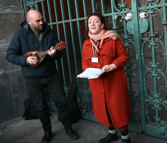 Noi invece siamo in Piazza Municipio, a due passi dal Maschio Angioino, e Mariangela oggi sarà la nostra sirena Partenope, che ci guiderà col suo canto per le vie della città. Parlare di Napoli – dice lei – e non ascoltare il suo canto sarebbe come scoprirla a metà. Il rapporto con la musica è viscerale; e non dimentichiamo che sia il dialetto che la canzone napoletana sono patrimonio immateriale UNESCO. La canzone è talmente emblematica e connessa alla storia della città che, dal 1200 ai giorni nostri, è un bene che continua ad evolversi e a rinnovarsi. Il tour in-canto è basato su performance site-specific, cioè pensate e realizzate per quello specifico luogo. È diverso ascoltare la musica in un teatro, dove si ha comunque con essa un rapporto elitario (si compra un biglietto a volte salato, e spesso serve un certo livello di cultura per potervi accedere), rispetto a creare l’incanto per strada, rendendo la cultura musicale un bene accessibile a tutti, comprese le persone diversamente abili con le quali Napoli tour in-canto lavora (Mariangela è anche musicoterapista) con dei tour pensati per loro.