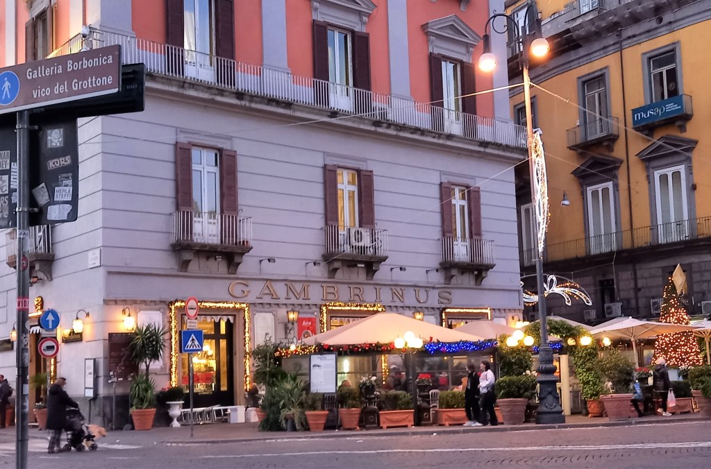 Ci trasferiamo in Piazza Plebiscito, dove ancora oggi, dopo alterne vicende, sorge lo storico Caffè Gambrinus. Il Gambrinus è stato fondato nel 1860 e ha raggiunto il suo apice all’inizio del ‘900 con la Belle Epoque. Fu anche un Cafè Chantant, dove all’epoca si svolgevano spettacoli. Era anche fornitore della Casa Reale ma poi, nel 1938, fu chiuso. La motivazione ufficiale era che fosse un ritrovo di antifascisti, ma si disse anche che la moglie del questore, che abitava sopra il caffè, non sopportasse il troppo vociare la sera. Fatto sta che il Gambrinus fu sostituito dal Banco di Napoli fino agli anni ’50, quando fu riaperto dalla stessa famiglia che lo gestisce ancora oggi. Si dice che anche il caffè sospeso, la tipica abitudine napoletana di lasciare un caffè pagato per chi non se lo può permettere, sia nata al Gambrinus.
