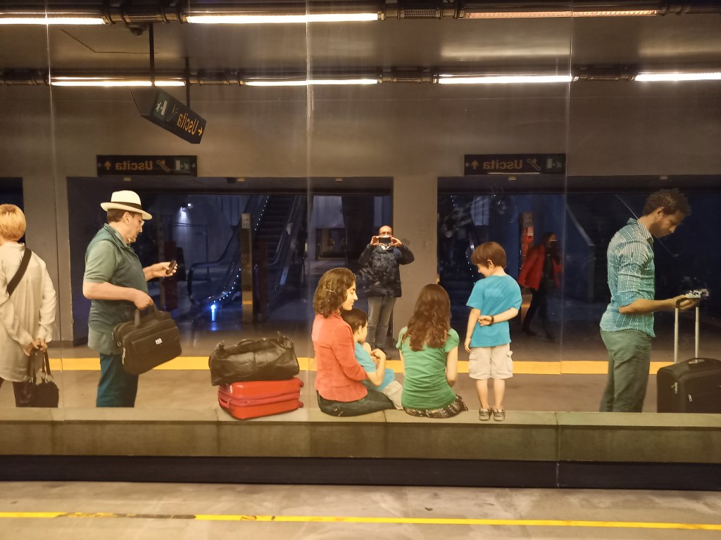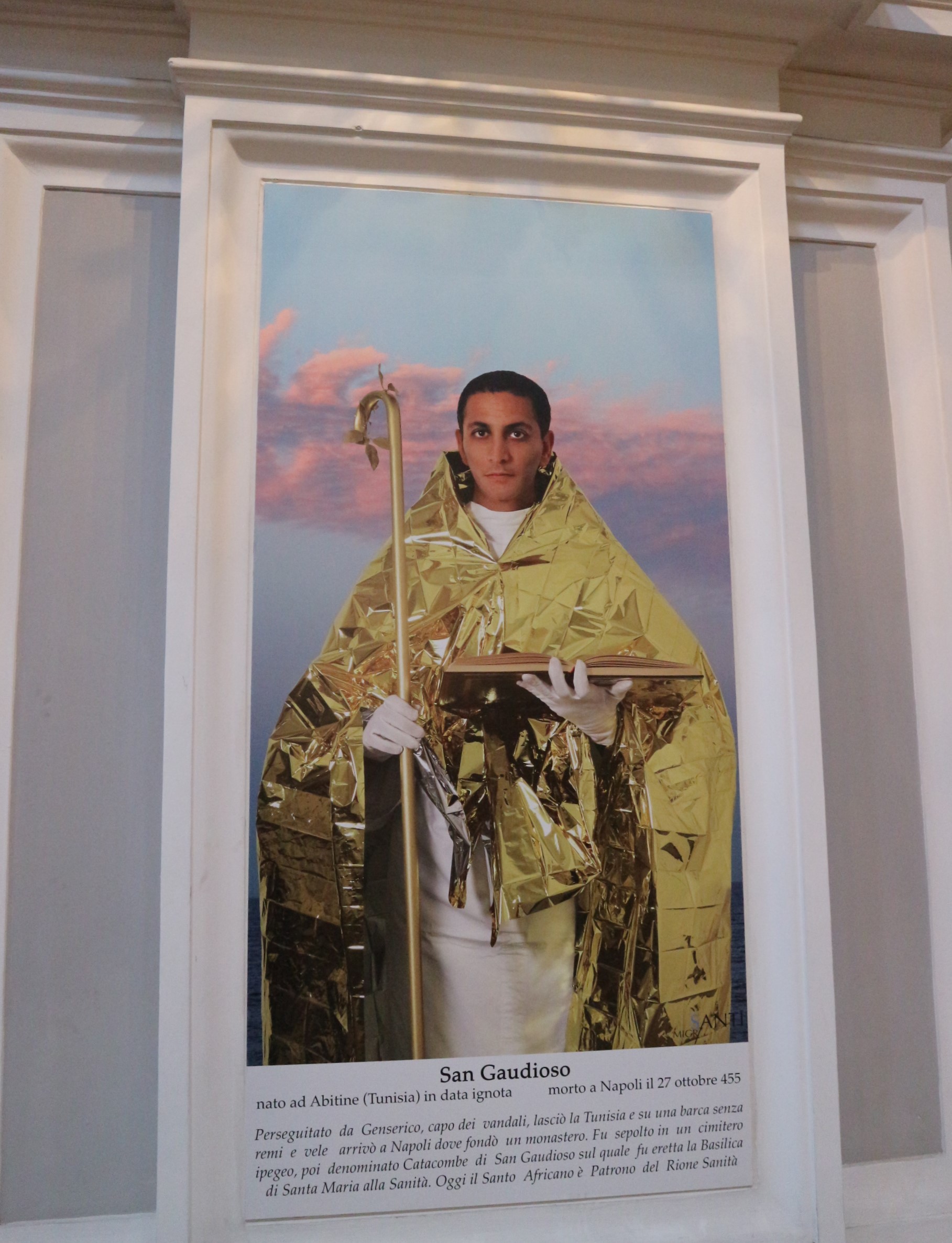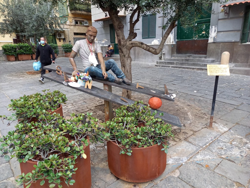 Il rione Sanità oggi è di fatto centro storico, ma in passato era considerato “fuori le mura”. Per arrivarci, dal nostro albergo nei pressi della Stazione Centrale, prendiamo la metro dalla vicina stazione Garibaldi. È l’occasione per scoprire che, se Toledo è la più bella, anche questa stazione della metro di Napoli ospita opere d’arte, niente meno che di Michelangelo Pistoletto. Le due installazioni dal titolo “Stazione”, collocate appena prima delle ultime rampe di scale verso i treni, sono costituite da pannelli in acciaio specchiante sui quali sono serigrafate, a grandezza naturale, fotografie di passeggeri in attesa o in cammino. Le immagini statiche dell’arte e le mutevoli immagini riflesse dalla realtà si mescolano incessantemente nell’opera, che diventa così, come ha spiegato l’autore, “una porta che mette in comunicazione arte e vita”.