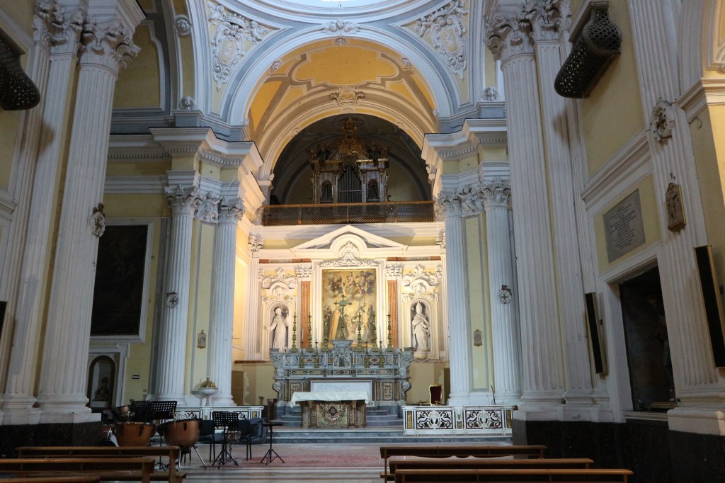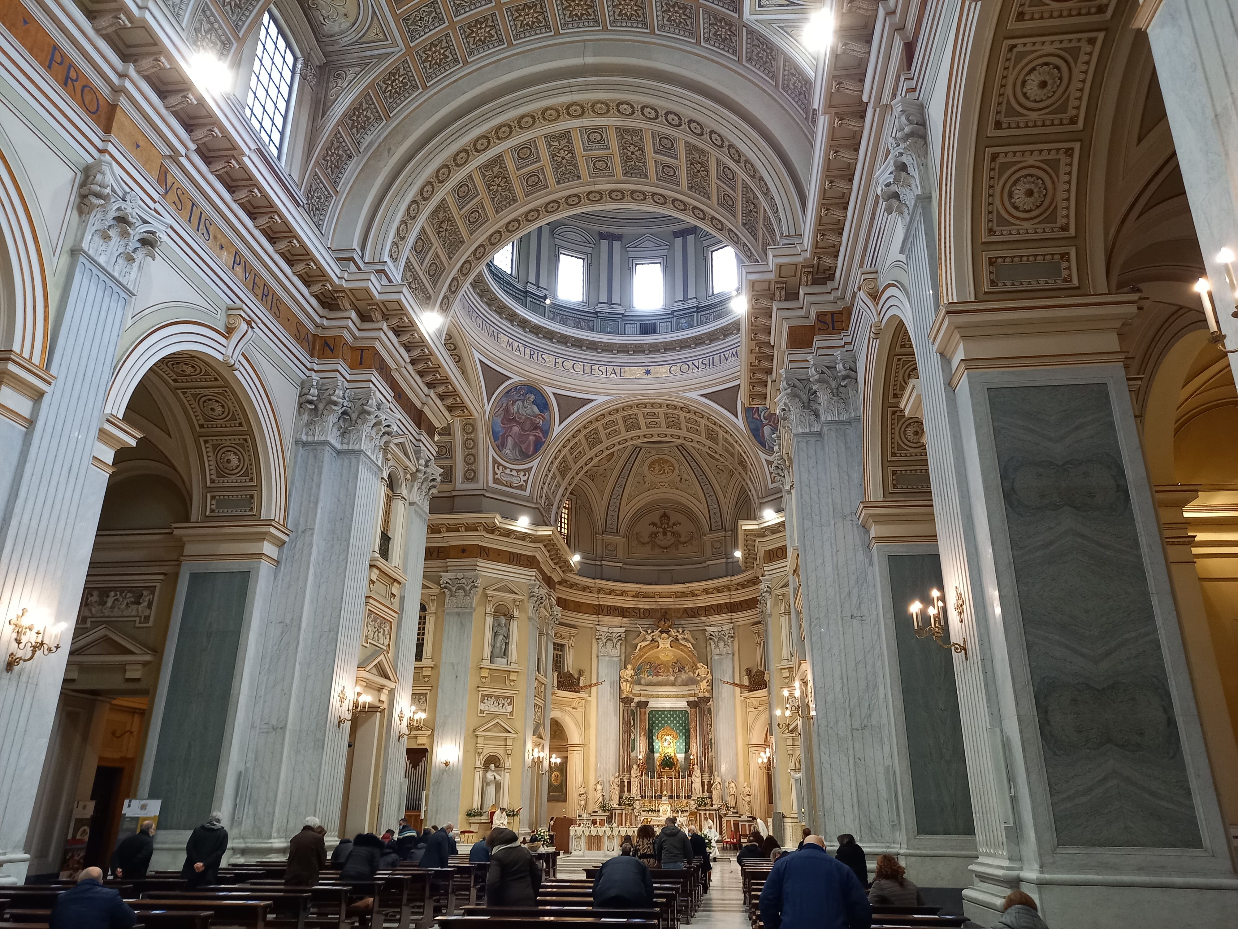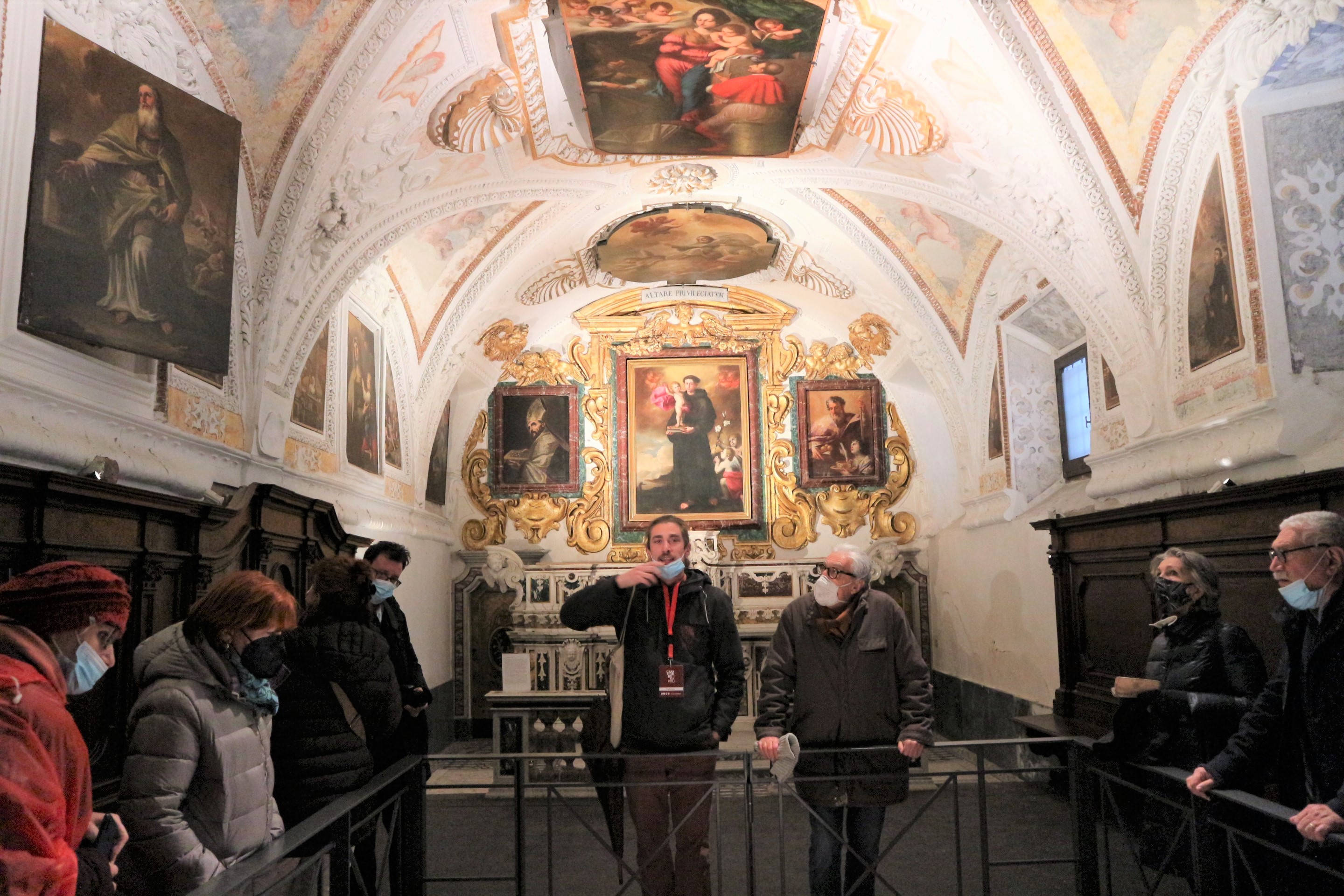 Entriamo nella Basilica di Santa Maria alla Sanità (conosciuta anche come chiesa di San Vincenzo alla Sanità), dove è in corso la messa per la festa dell’Immacolata tra canti ad altissimo volume, ma Fabrizio imperterrito prova a farsi sentire e a spiegare la storia di questa chiesa.