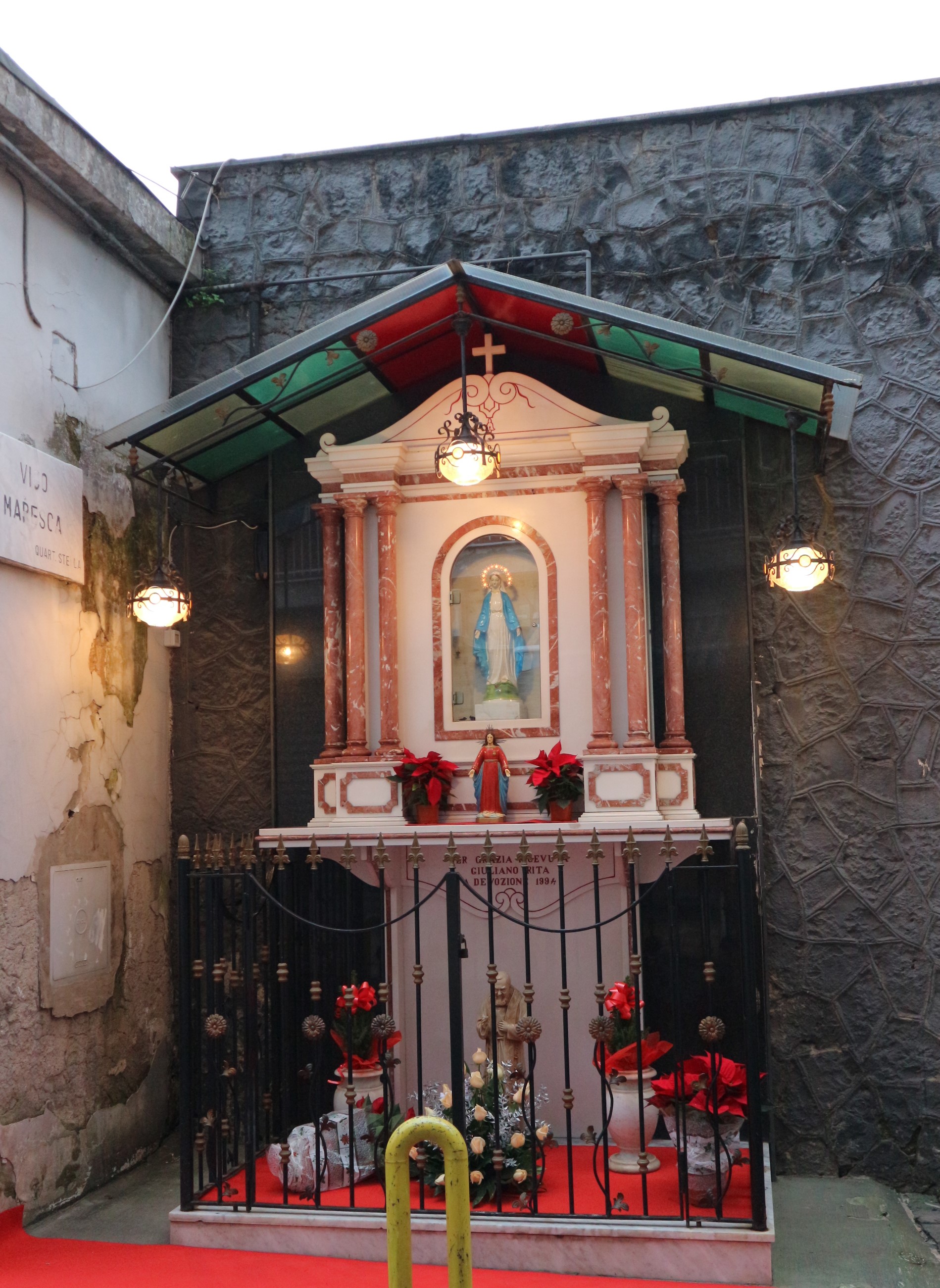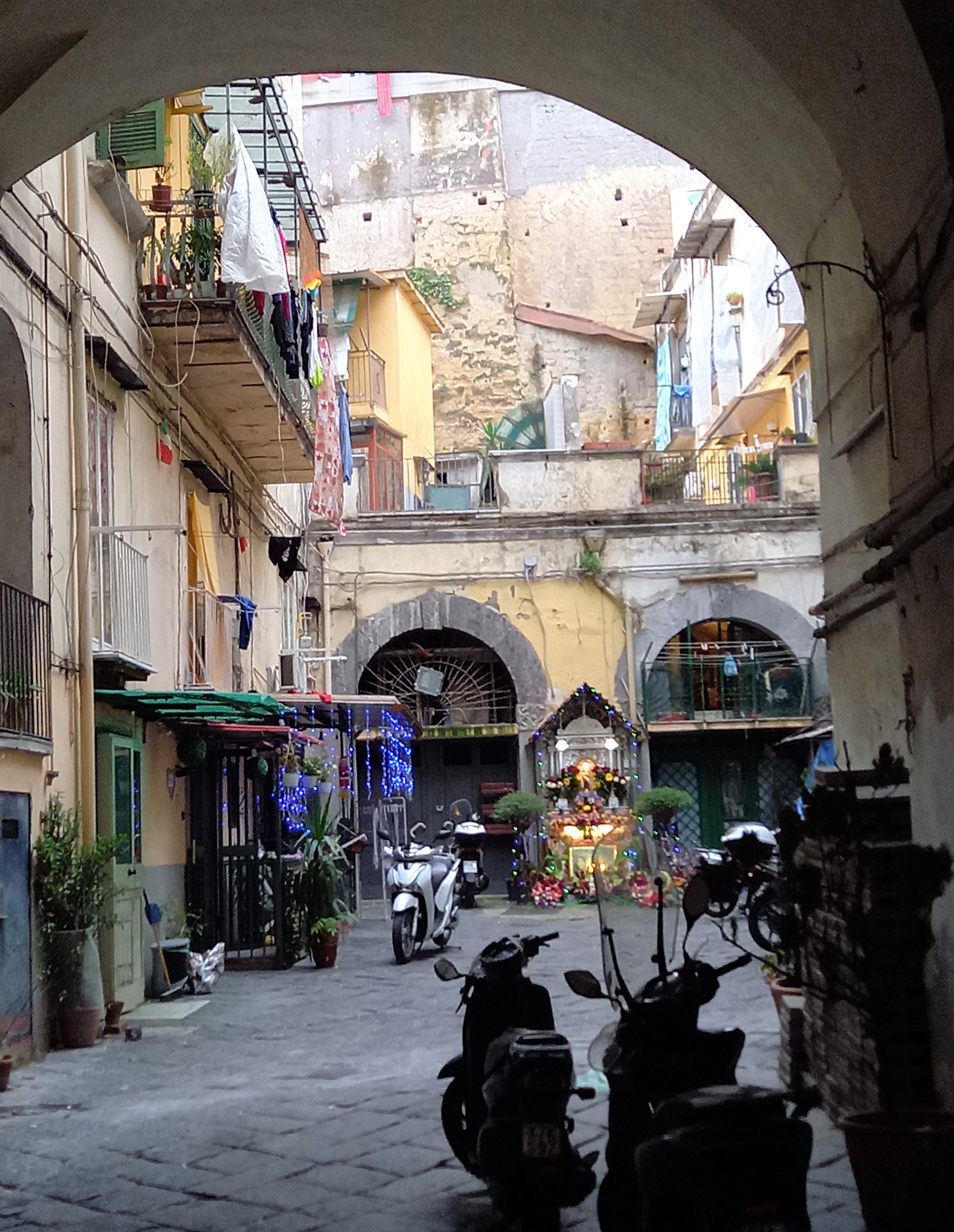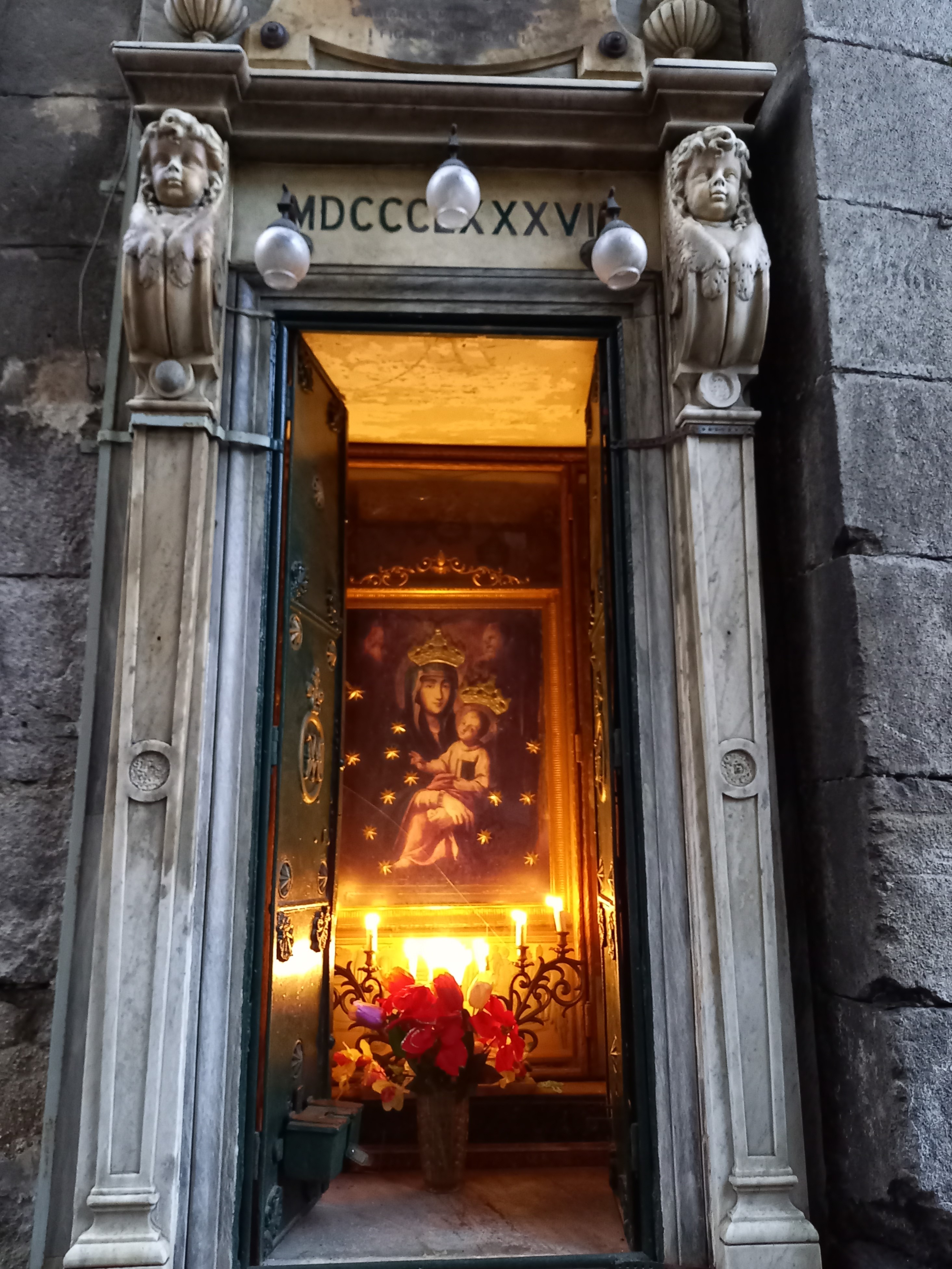 Usciamo mentre sta passando un colorato corteo di babbi natale ed elfi musicisti; mentre loro suonano Jingle bells e Last Christmas, ci avviamo verso l’ultimo tratto del nostro percorso nel rione Sanità, quello tra le sue architetture monumentali.