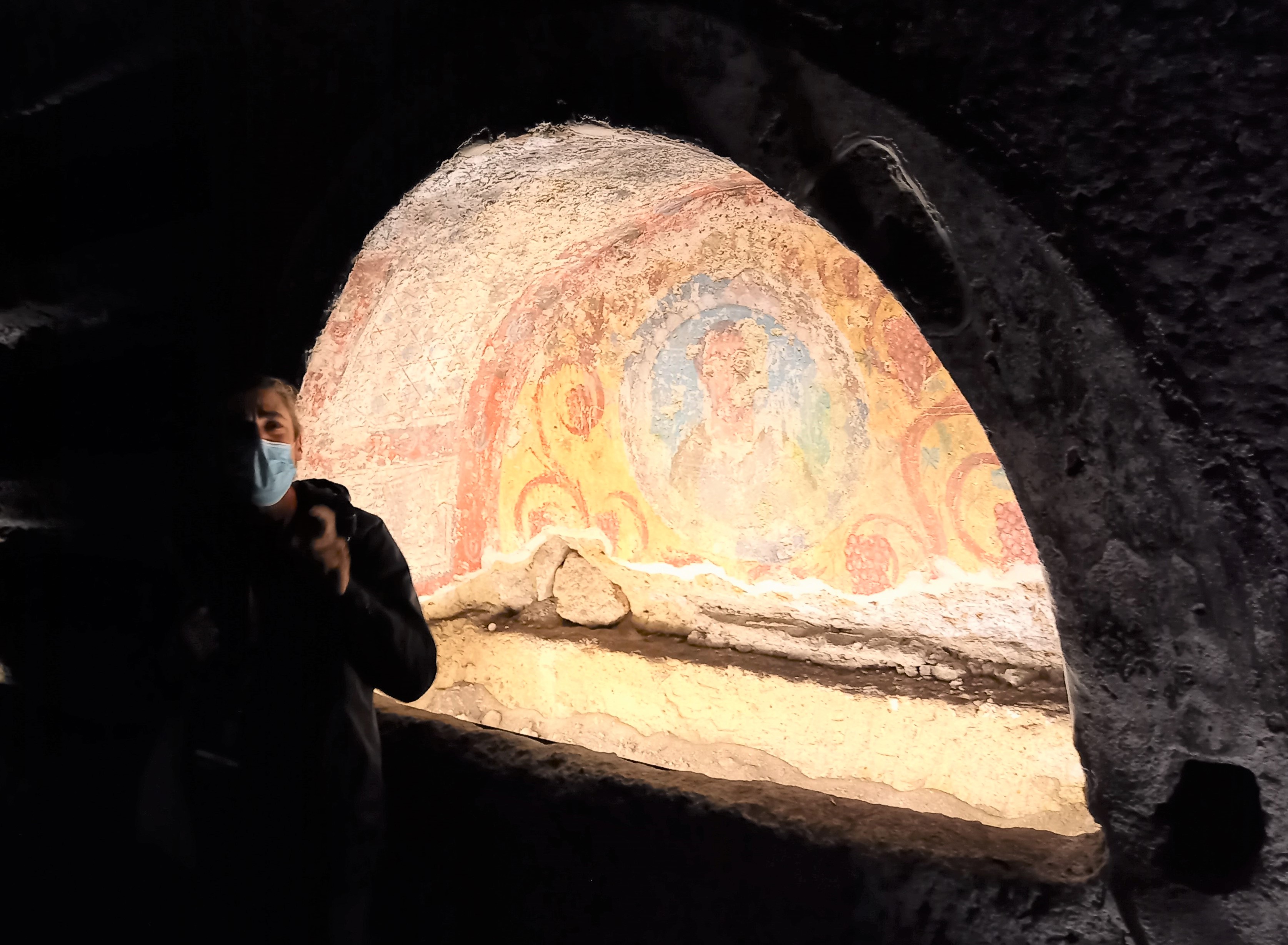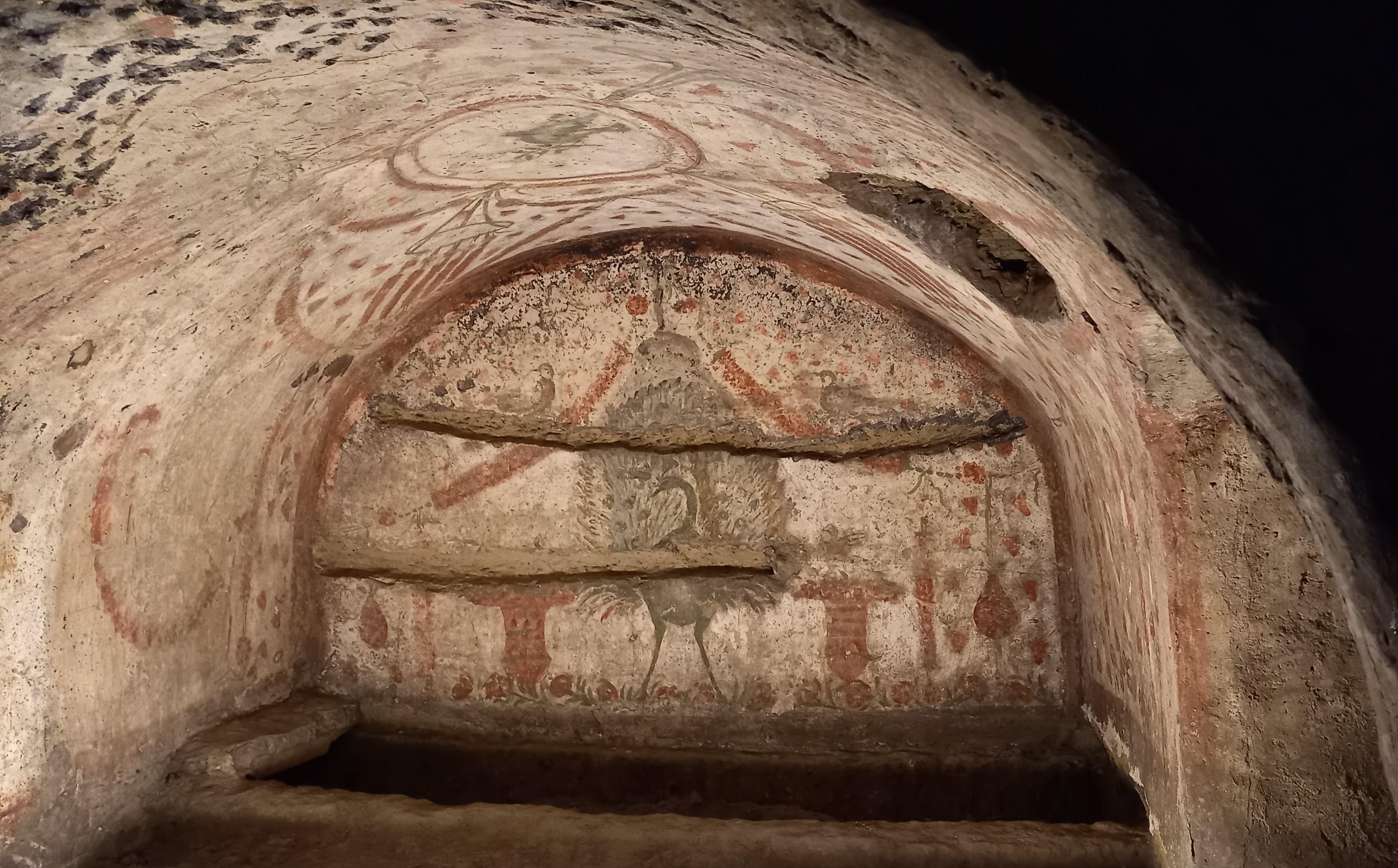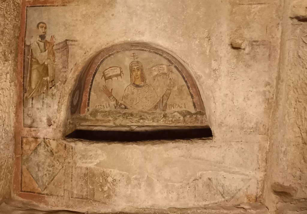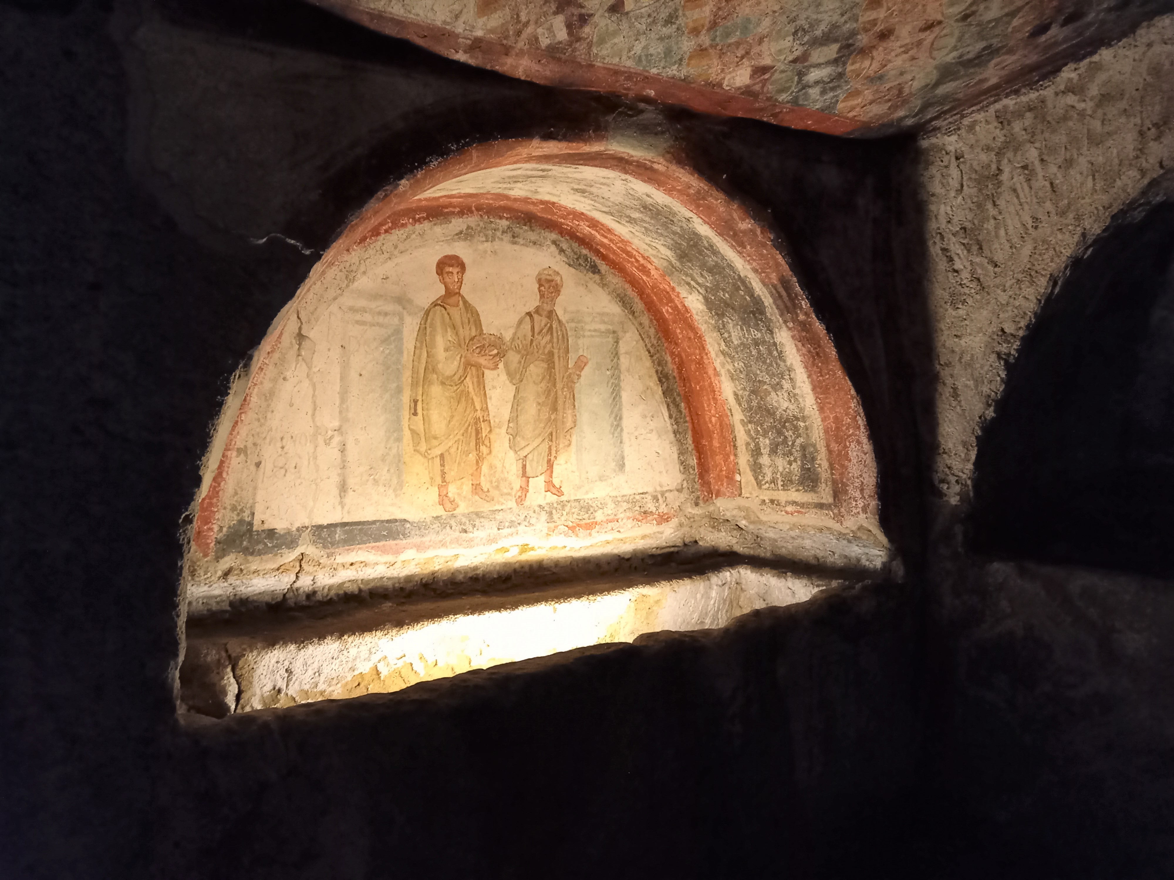 Sul piano storico, la prima cosa da dire sulle catacombe è che va smentita una storica “fake news” o leggenda, se preferite: i cristiani non si nascondevano qui per pregare, semplicemente seppellivano qui i loro morti. Quello che si vede, infatti, scendendo nel sottosuolo è una necropoli: Tombe a fossa, dove i defunti venivano sepolti uno sopra l’altro, loculi e un terzo tipo di tomba chiamato arcosolium. Tipico delle catacombe romane, l’arcosolium era costituito da un sarcofago o da una tomba chiusa da lastre di marmo o in muratura ed inserita in una nicchia sormontata da un arco a tutto sesto, in genere scavata nel tufo della parete. La sepoltura occupava interamente la parte inferiore della nicchia, e lo spazio che si veniva a creare sotto l’arco, la lunetta, veniva spesso decorato con pitture. Ne possiamo vedere qui molti esempi, alcuni davvero ben conservati.