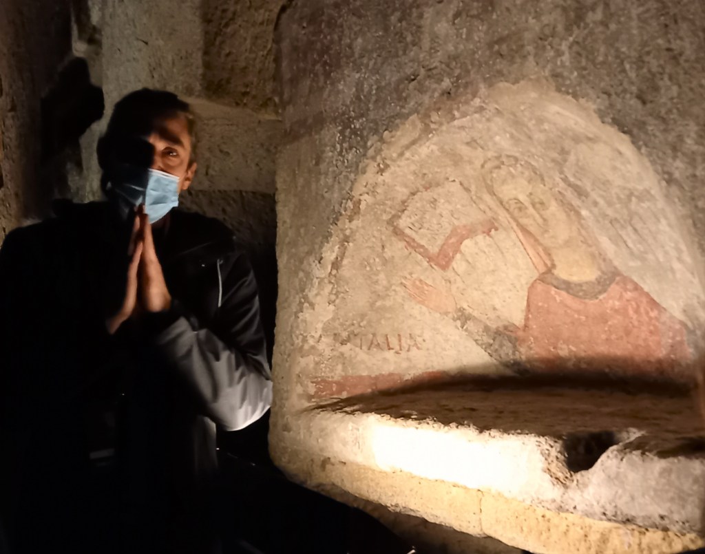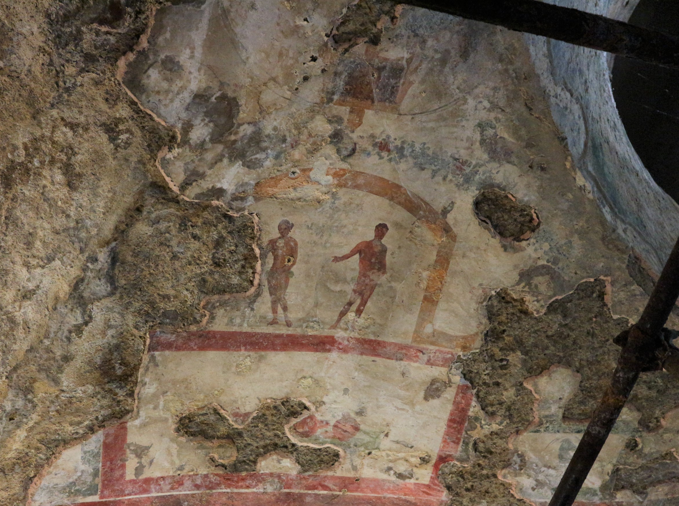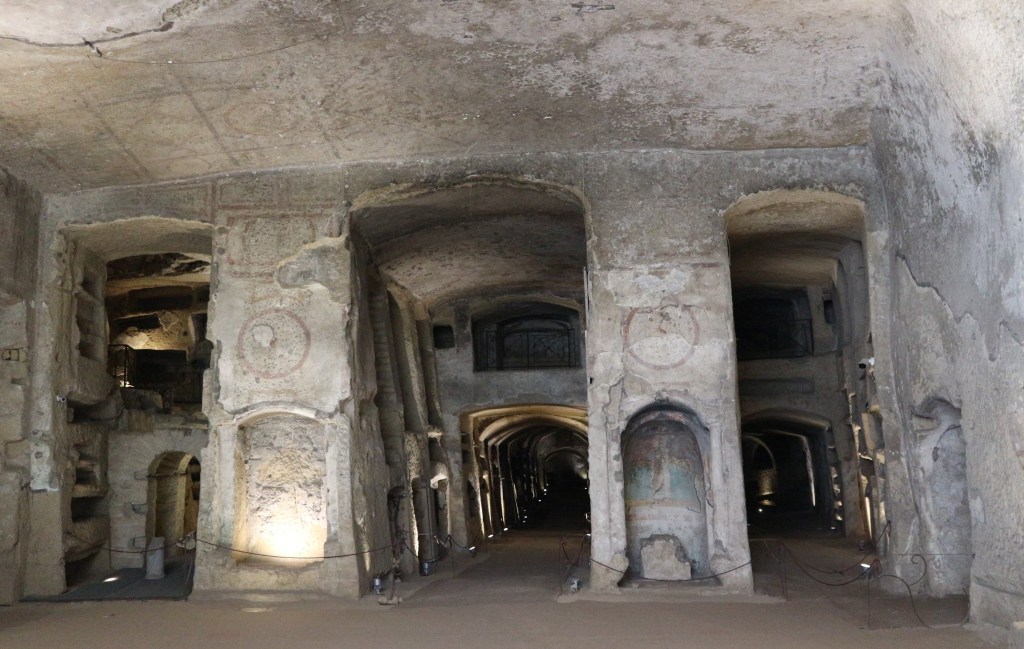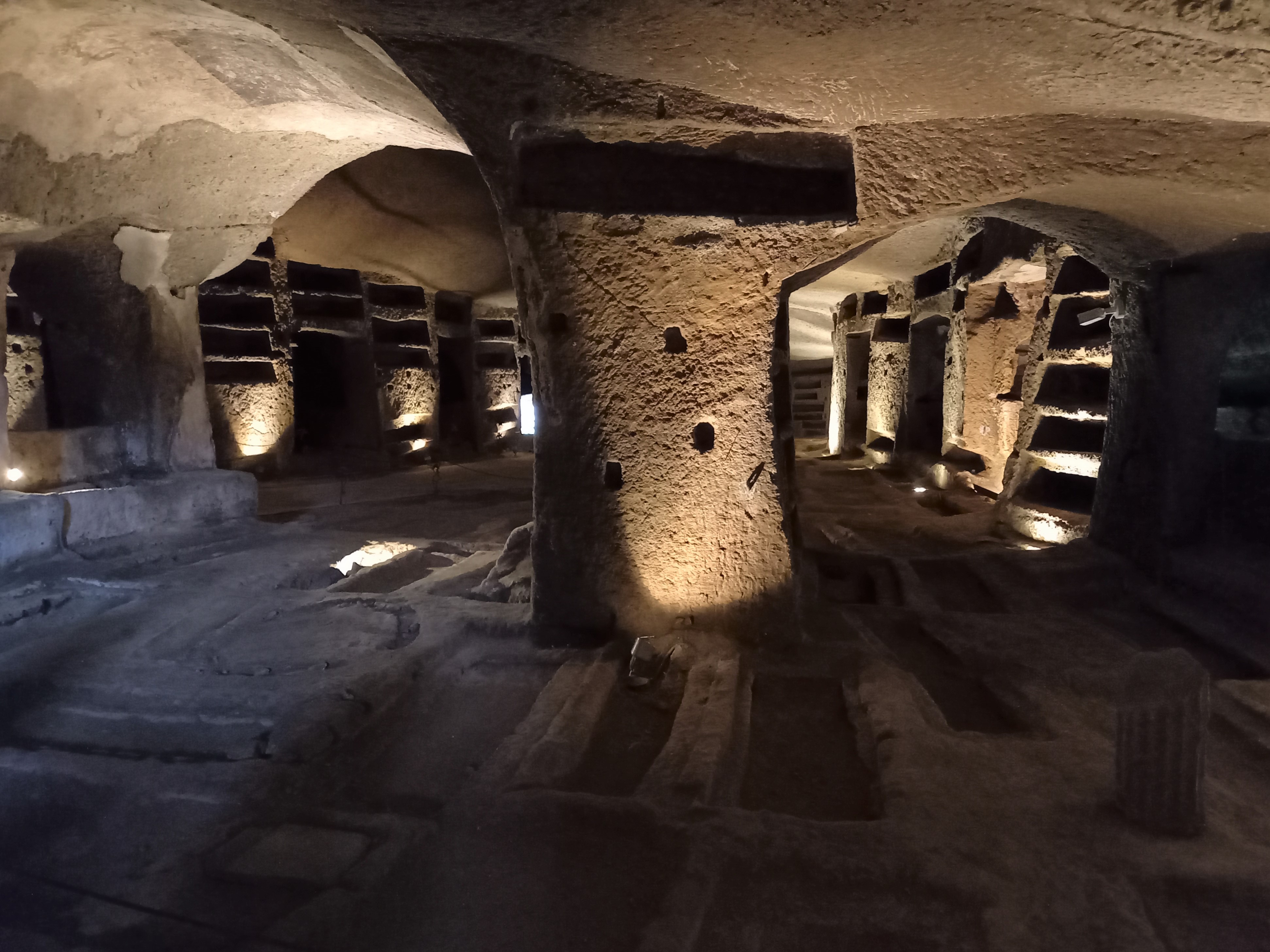 Sul piano storico, la prima cosa da dire sulle catacombe è che va smentita una storica “fake news” o leggenda, se preferite: i cristiani non si nascondevano qui per pregare, semplicemente seppellivano qui i loro morti. Quello che si vede, infatti, scendendo nel sottosuolo è una necropoli: Tombe a fossa, dove i defunti venivano sepolti uno sopra l’altro, loculi e un terzo tipo di tomba chiamato arcosolium. Tipico delle catacombe romane, l’arcosolium era costituito da un sarcofago o da una tomba chiusa da lastre di marmo o in muratura ed inserita in una nicchia sormontata da un arco a tutto sesto, in genere scavata nel tufo della parete. La sepoltura occupava interamente la parte inferiore della nicchia, e lo spazio che si veniva a creare sotto l’arco, la lunetta, veniva spesso decorato con pitture. Ne possiamo vedere qui molti esempi, alcuni davvero ben conservati.