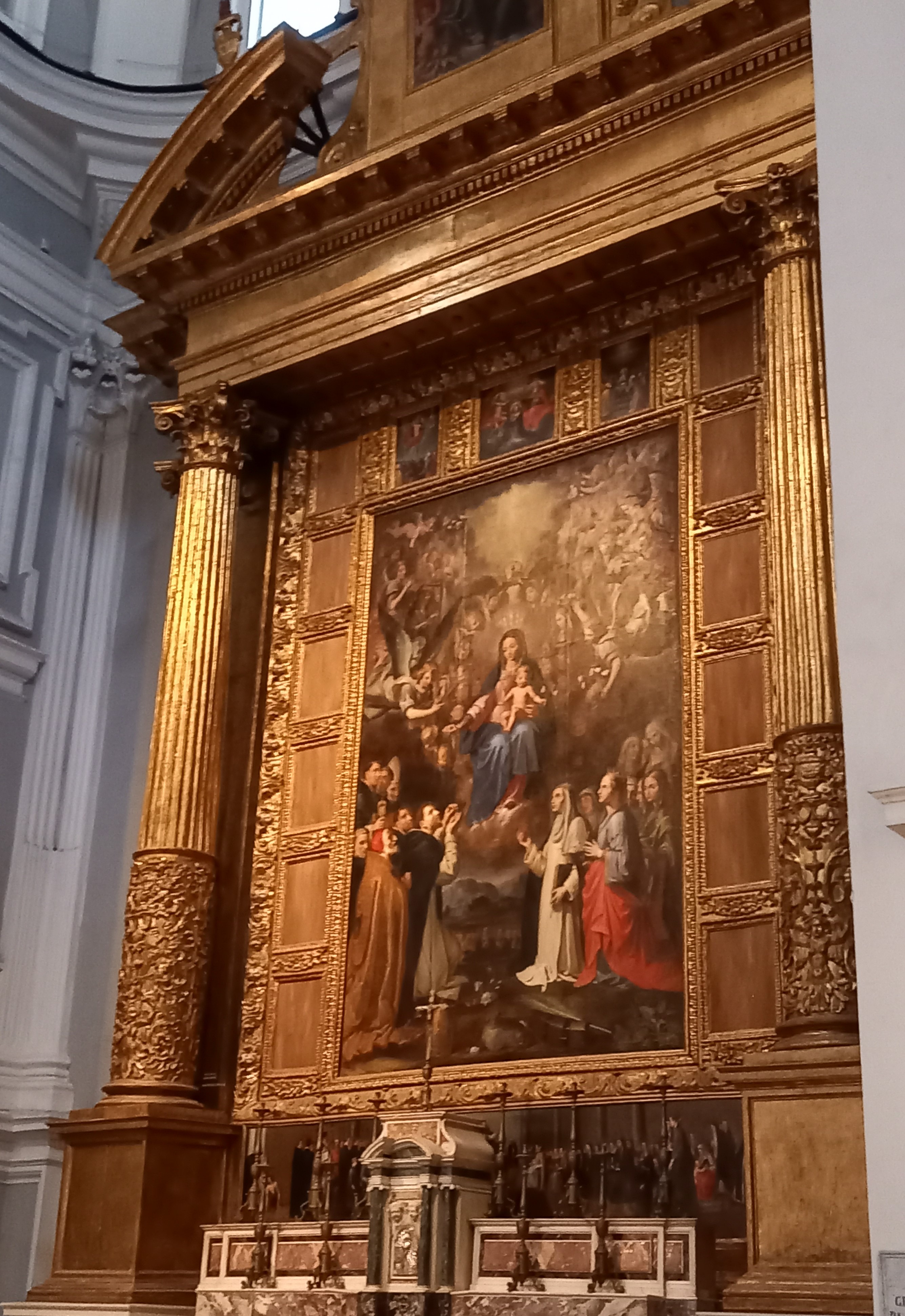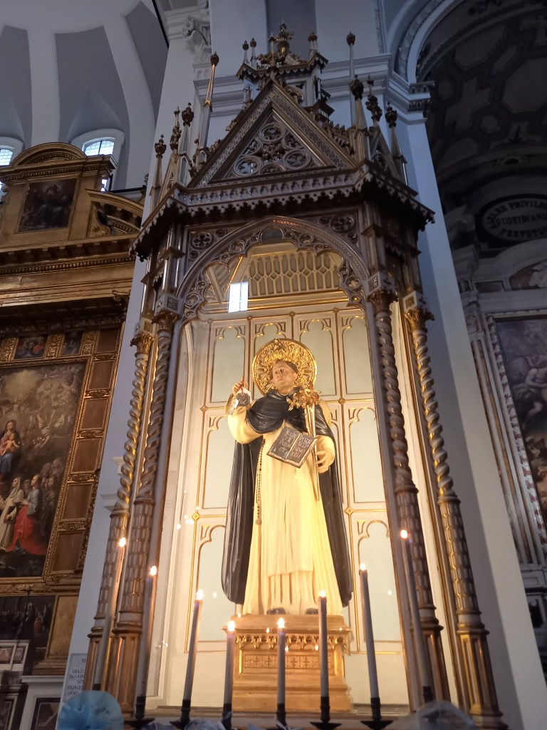 Ci sono cinque navate, come nelle chiese più maestose di Roma, e dodici cupole, oltre a quella centrale che è la tredicesima. Dodici, nella cabala cristiana, corrisponde a molte cose, dai dodici apostoli alle dodici tribù di Israele alle dodici stelle della Madonna. I domenicani sono un ordine di predicatori e di sommi teologi. A Napoli, oltre alla chiesa di San Domenico Maggiore che è una delle più importanti del centro storico, c’è stata la scuola di filosofia e teologia dove hanno studiato San Tommaso d’Aquino, Giordano Bruno, Tommaso Campanella. Oltre a essere predicatori, sono anche inquisitori; i domenicani che vengono qui sono i domenicani controriformati. San Carlo Borromeo cercava di cambiare la chiesa anche nella sua struttura: prima le chiese avevano l’iconostasi che copriva l’altare e lo separava dai fedeli, mentre nelle chiese della controriforma l’altare si deve vedere e il popolo deve essere partecipe. Non solo: nelle chiese della controriforma San Carlo Borromeo fa mettere i santi, e qui i domenicani fanno il loro “marketing” sugli altari laterali, dove ci sono solo santi domenicani. Nel centro storico di Napoli ci sono l’obelisco di San Domenico e l’obelisco del Gesù: anche lì si faceva a gara a chi ce l’ha più lungo – scherza Fabrizio – perché sono simboli di potere. A questa chiesa lavoreranno i più grandi artisti del ‘600: Pacecco De Rosa, Luca Giordano che si trova in tutte le chiese di Napoli, ma soprattutto è stata trovata una commessa di centocinquanta ducati a un certo Michelangelo Merisi, altrimenti detto il Caravaggio. I domenicani avevano già voluto il loro Caravaggio a San Domenico Maggiore (ora si trova a Capodimonte) con la Flagellazione di Cristo; qui i domenicani volevano una pala del nome di Gesù, perché con la controriforma si comincia a parlare di devozione al nome di Gesù e al nome di Maria. Questa commessa non sarà mai realizzata, probabilmente a causa della morte del Caravaggio nel 1610. I domenicani erano un’industria, avevano biblioteche e farmacie, perché dovevano mantenere la chiesa, il monastero e tutto quello che c’era intorno. E, se ci si fa caso, i colori della chiesa sono il bianco e il grigio, gli stessi del saio dei domenicani, perché loro fanno teologia con le immagini. Non sono come i benedettini e i certosini che hanno come motto “ora et labora”, loro sono soprattutto predicatori.