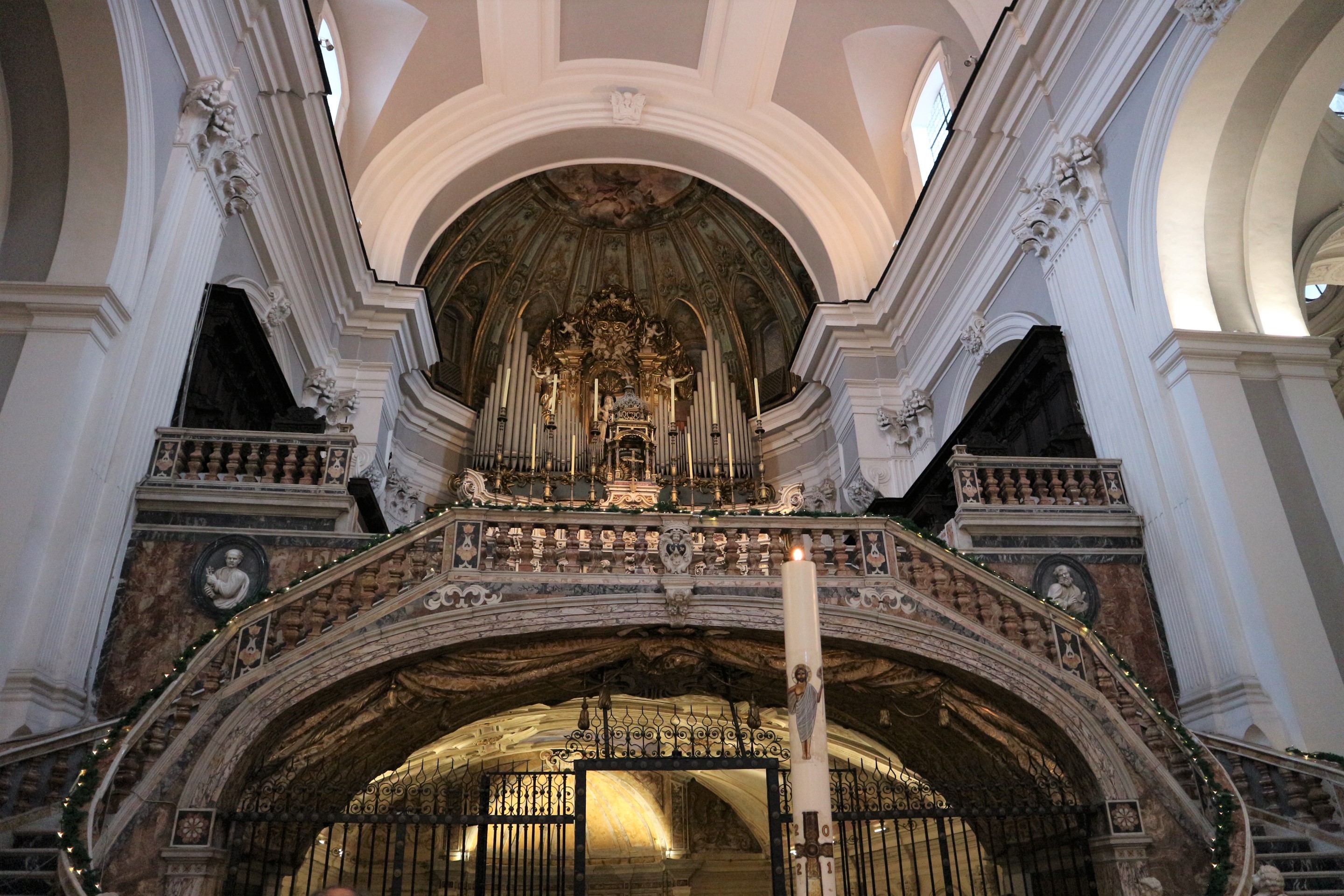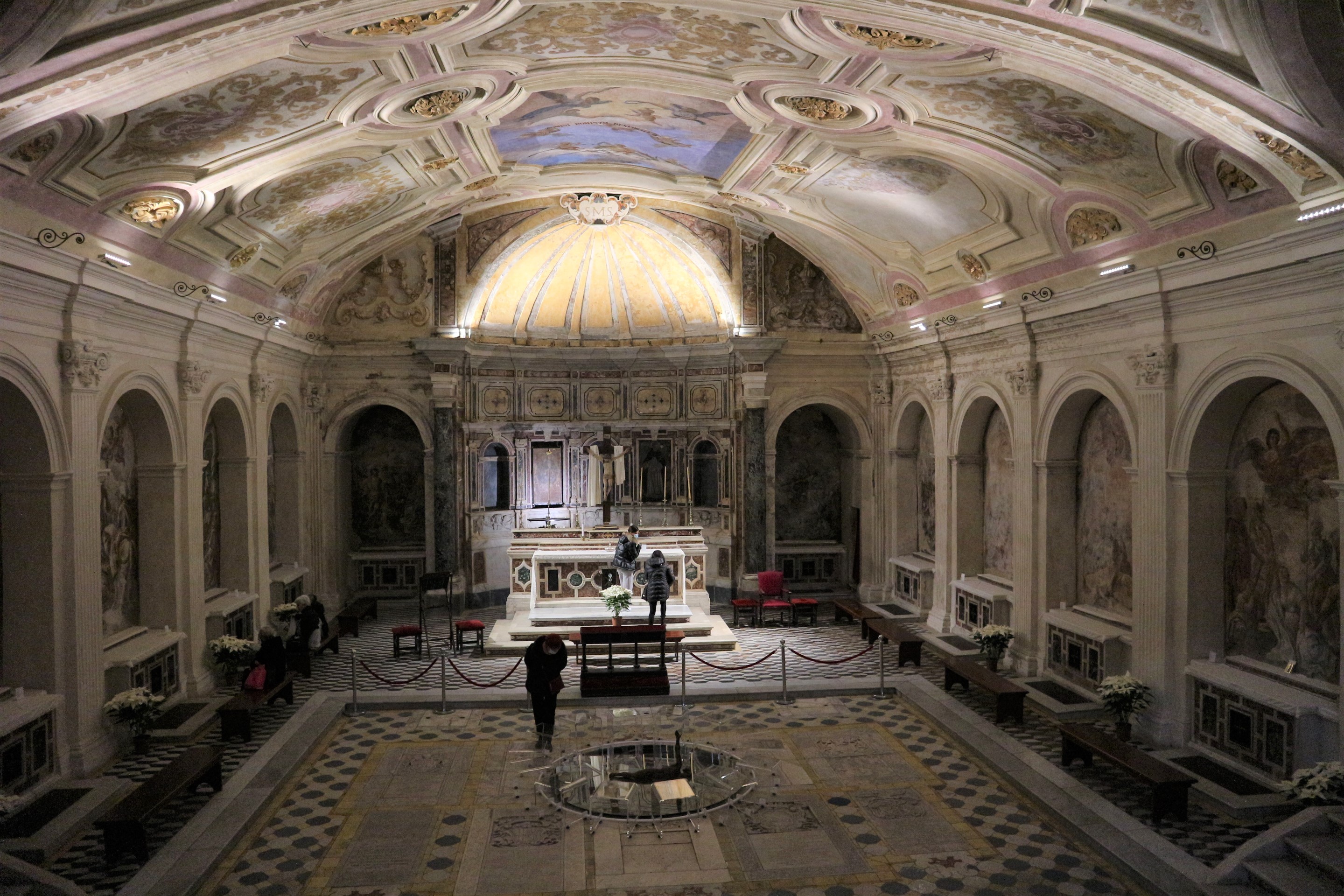 Al di sotto del presbiterio si sviluppa la cripta, già antica basilica paleocristiana, il cui ingresso si trova prima delle rampe a tenaglia che portano al presbiterio sopraelevato e dalla quale si accede poi alle catacombe di San Gaudioso. Anche questa zona è piena di simboli, dal giglio simbolo di purezza e nobiltà alla palma che simboleggia il martirio e il trionfo sulla morte, e ancora una volta il melograno. Sul pavimento marmoreo c’è una croce che rappresenta la forma della chiesa, con gli stemmi nobiliari delle famiglie che “ci hanno messo i soldi”, tra cui i San Severino di Bisignano.