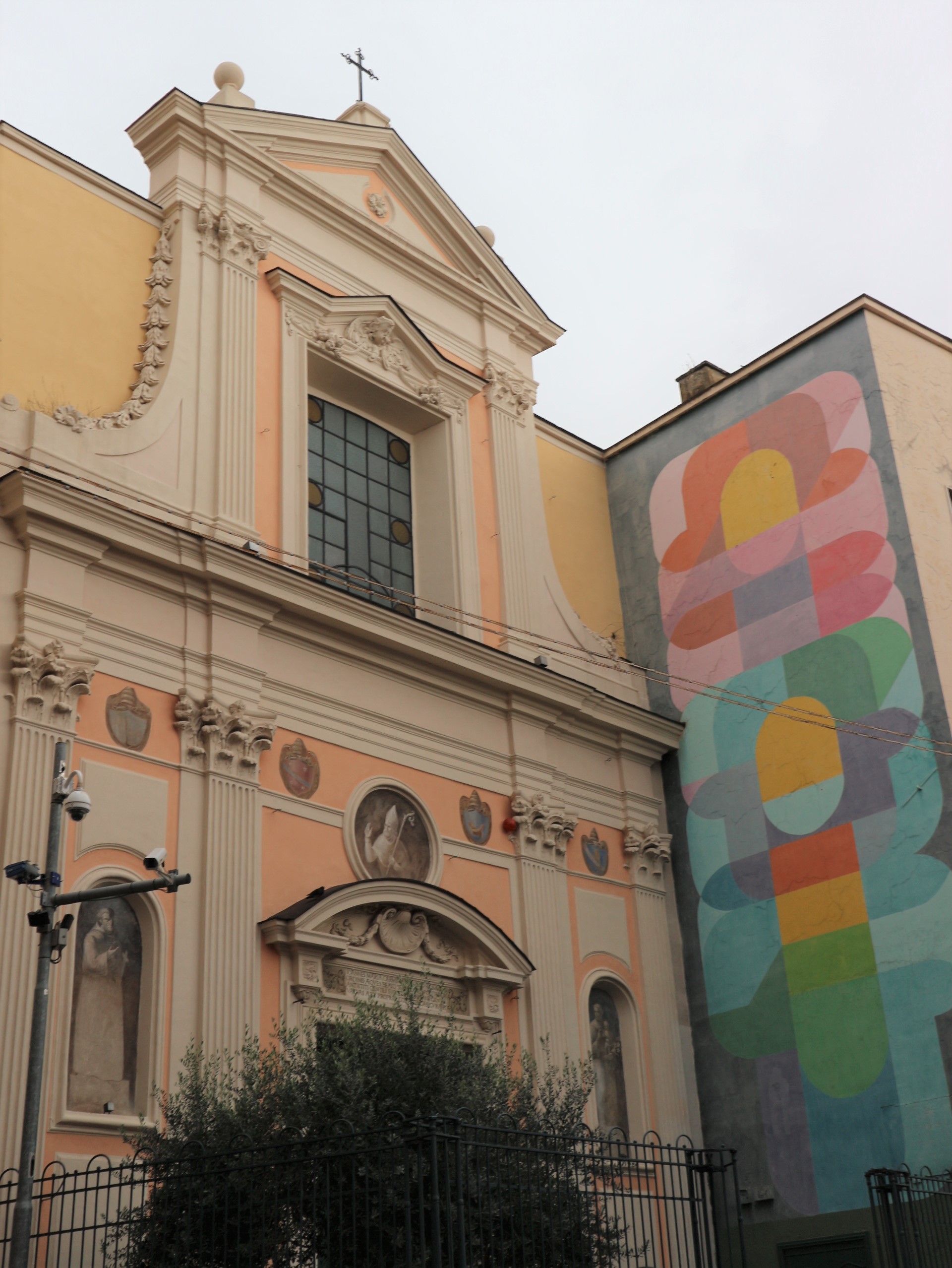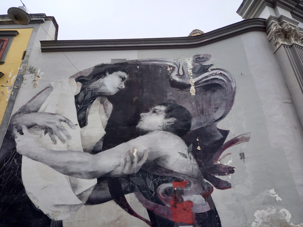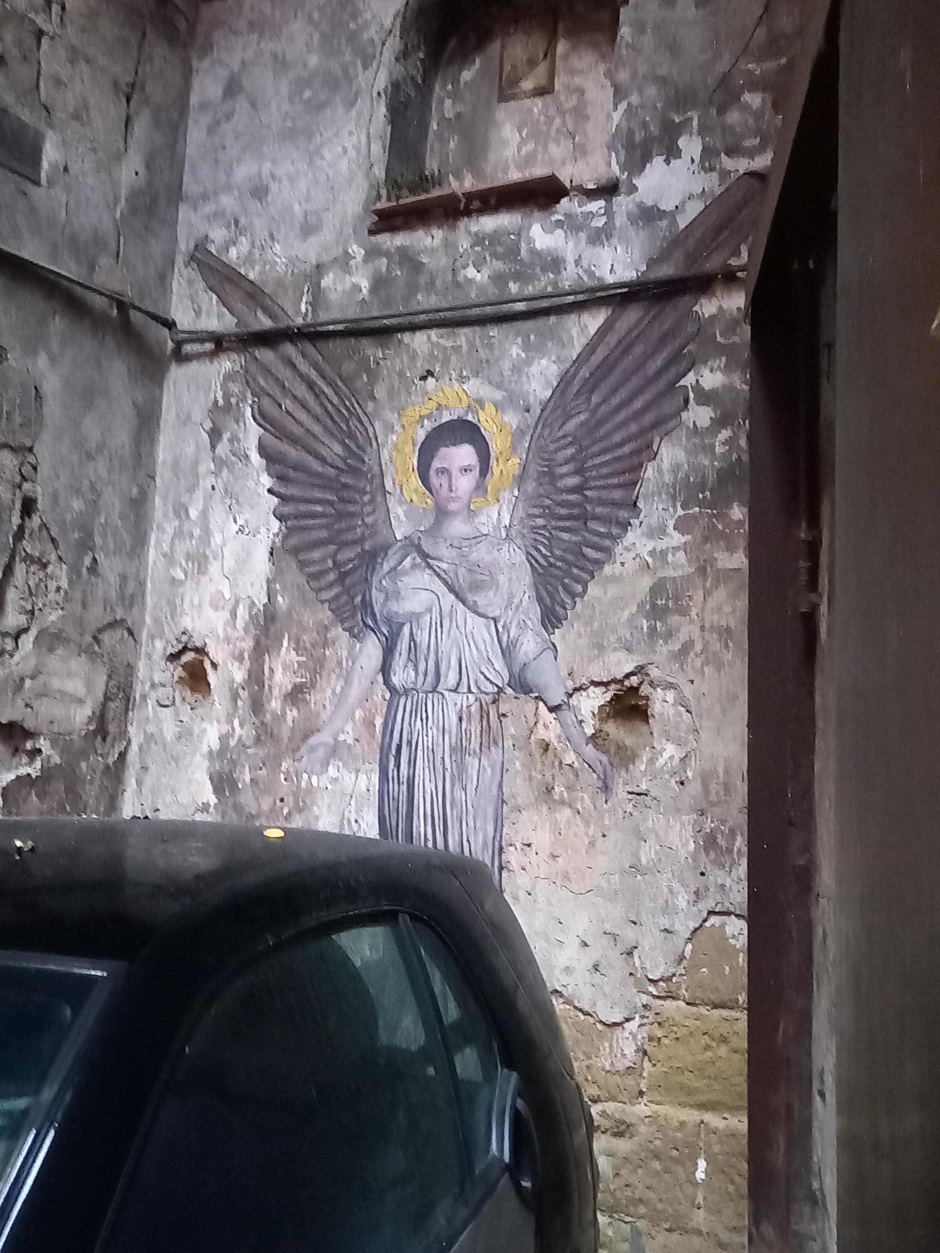 Prima di pranzo, c’è giusto il tempo di buttare un occhio al murale dell’Angelo realizzato dallo street artist francese Zilda a Vico San Giovanni in Porta. Il contrasto tra l’immagine e quello che c’è attorno, che è probabilmente il senso principale di quest’opera, è reso anche più forte dalla macchina parcheggiata che – dice chi conosce la zona – vi si trova regolarmente davanti.