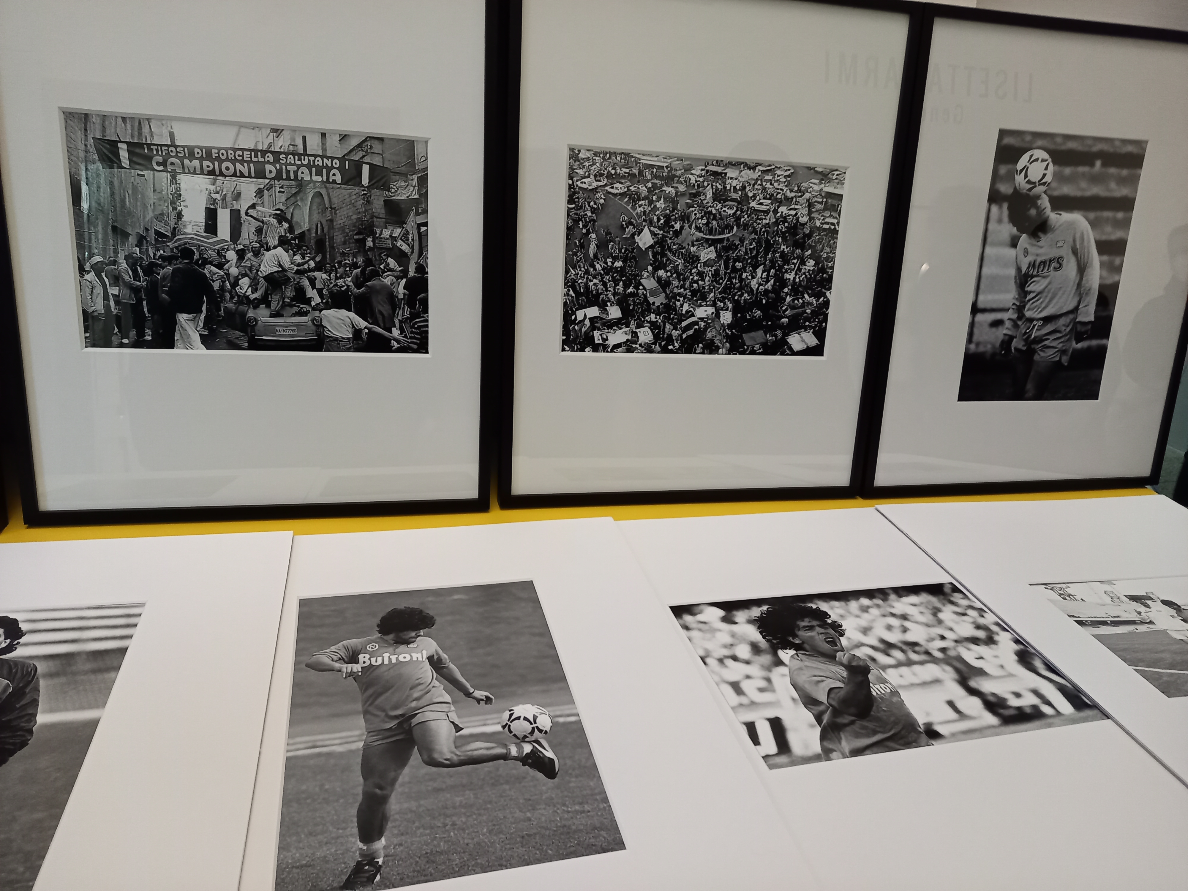 Poi ci aspettano ai Magazzini Fotografici per vedere la mostra che narra la singolare storia di Diego Armando Maradona attraverso gli emblematici e metaforici scatti di Sergio Siano, giovane fotoreporter a bordo campo per il Mattino negli anni d’oro della carriera del Pibe. 134 fotografie, molte delle quali inedite, che raccontano Diego nell’intimità dei suoi allenamenti, ma anche alle prese con le sue azioni più eroiche, nelle sue partite più importanti, celebrato da tifosi in visibilio, in rappresentanza di un popolo perennemente in festa, in perpetua celebrazione delle sue gesta. Una narrazione di quello che è stato l’iconico Maradona per i suoi tifosi, che lo hanno sposato e glorificato come simbolo di vittoria e riscatto. Le foto ci consegnano una narrazione quasi filmica del calcio negli anni di Maradona. Il fuoriclasse argentino appare in queste immagini per quello che è stato: un grande atleta, un riferimento per i compagni di squadra, ma anche un simpatico giullare sull’erba del Centro Paradiso di Soccavo.