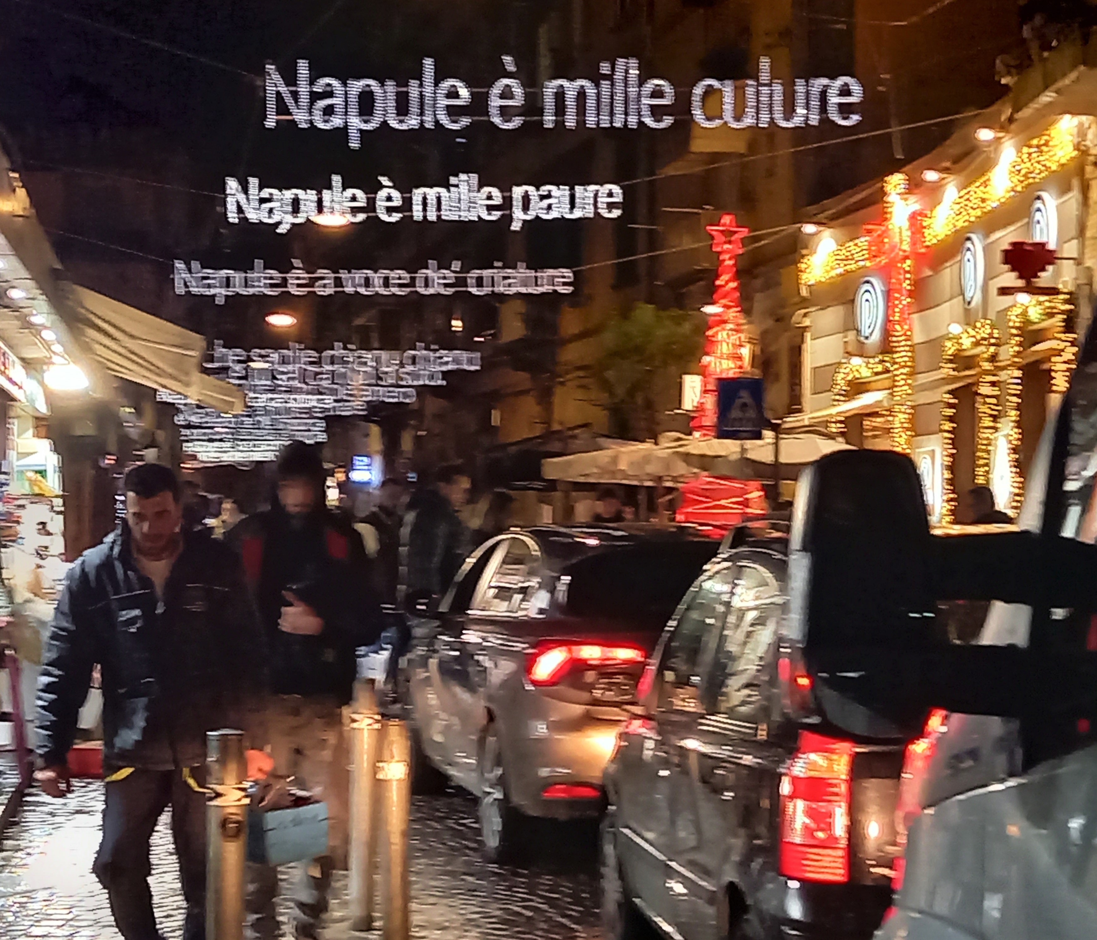 In via Arena della Sanità c’è ancora anche un’installazione luminosa, ideata dal direttore artistico Tiziano Corbelli e realizzata dall’artigiano Antonio Spiezia, con le parole di Napule è, di Pino Daniele. Doveva durare solo sei mesi, ma il successo è stato tale che è qui da due anni ormai ed è già diventata parte del paesaggio, oltre a dare l’opportunità per una foto molto instagrammabile. La mia è venuta così così ma facciamo finta che è una sfocatura voluta, ok?