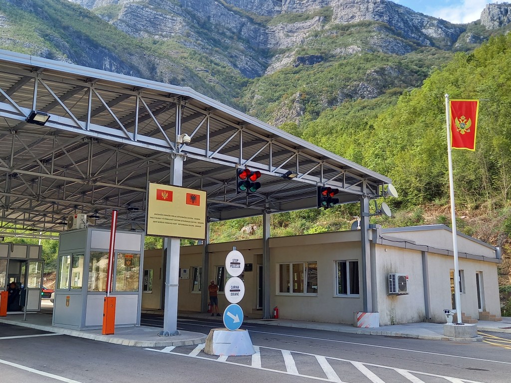 La strada è talmente nuova che pochi la conoscono, e così il posto di frontiera è praticamente deserto. Ci fermiamo e dietro di noi non c’è nessuno. I poliziotti albanesi, per quanto compassati, svolgono il controllo dei documenti in modo abbastanza sbrigativo. Ma i montenegrini, appena sentono Eugenio parlare in serbo con uno strano accento, e alla guida di un pullmino con targa albanese, si incuriosiscono. Lui spiega che vive a Belgrado da anni, che organizza viaggi per conto di un’agenzia italiana, di Padova, elenca le mete già toccate e le tappe che faremo in Montenegro… e loro fanno domande, forse anche un po’ per passare il tempo. Non deve essere facile – pensiamo noi – far passare la giornata nell’ufficio di una dogana così sonnacchiosa come questa. E infatti leggono e rileggono il nome di “Eughenio” (per loro si pronuncia così, è ovvio) sui vari documenti del noleggio, poi chiedono un’assicurazione speciale che serve per entrare in Montenegro su un’auto straniera, fotocopiano minuziosamente tutto, controllano uno per uno tutti i nostri documenti… e intanto passa una mezz’ora. Subito dopo la frontiera scendiamo a sgranchirci un po’ le gambe e a leggere un ultimo brano di Edith Durham; qui sventola un’altra bandiera con un’aquila bicipite. In quella del Montenegro nell’aquila è inscritto un leone passante, altro simbolo monarchico (della dinastia Petrović). L’aquila ha anche tra le due teste la corona della dinastia Petrović e tiene tra gli artigli uno scettro e un globo. È abbastanza curioso che la bandiera di una repubblica sia così piena di simboli monarchici, ma tant’è; scopriremo che i montenegrini tengono molto al loro glorioso passato di regno indipendente, per quanto sia durato abbastanza poco: dal 1860 (ma l’indipendenza fu riconosciuta a livello internazionale solo nel 1878) fino al 1918.
