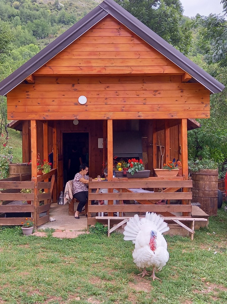 Così abbiamo perso un bel po’ di tempo, dobbiamo dirigerci velocemente verso il posto che abbiamo prenotato per il pranzo, che è un agriturismo molto bello ma altrettanto difficile da trovare: la fattoria di Milijanka e Miško Puletić. Ne vale davvero la pena, però, perché quello che ci offrono è tanto e tutto di qualità, soprattutto il formaggio e il prosciutto crudo affumicato, che è una specialità montenegrina. Ad accoglierci c’è anche un tacchino di dimensioni davvero eccezionali e con un portamento… da pavone!