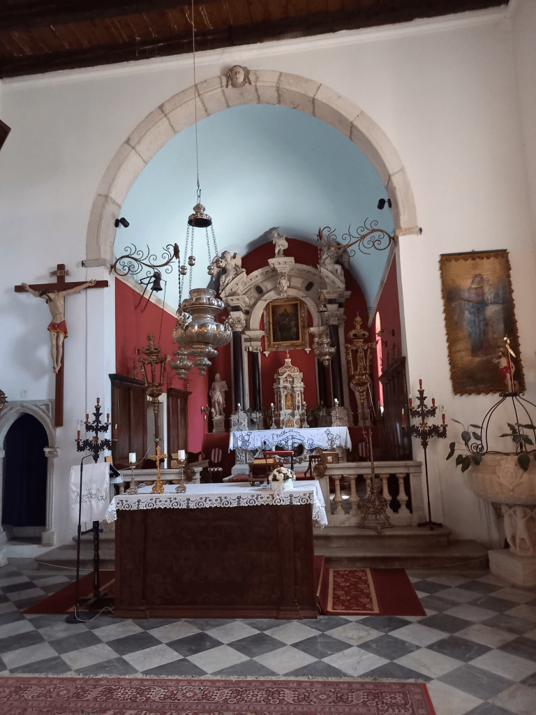 Facciamo tappa all’isola della Madonna dello Scalpello, per visitare il santuario. La prima chiesa conosciuta fu costruita sull’isolotto nel 1452. Nel 1632 fu edificata l’odierna chiesa della Madonna dello Scalpello, ampliata nel 1722 con la costruzione della grande cupola. La chiesa, restaurata dopo il terremoto del 15 aprile 1979, contiene 68 dipinti del pittore veneziano Tripo Cocoglia (Tripo Kokolja), famoso artista barocco del XVII secolo originario di Perasto. Ci sono anche dipinti di altri artisti veneziani e un’icona (circa del 1452) della Nostra Signora delle Rocce. La chiesa ospita anche una ricca collezione di 2.500 ex voto d’argento e un famoso arazzo votivo ricamato da Jacinta Kunić-Mijović di Perasto, che lo realizzò nei 25 anni di attesa del proprio amato di ritorno da un lungo viaggio, fino a quando diventò cieca; per il ricamo utilizzò fibre di argento e oro, ma anche i propri capelli.
