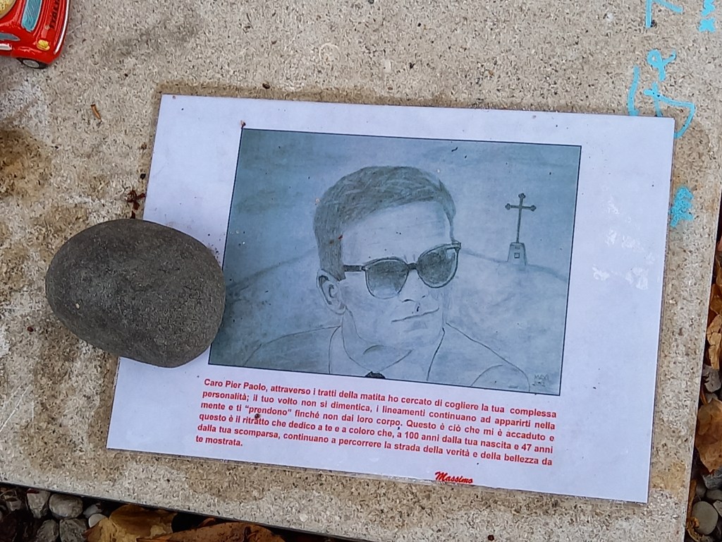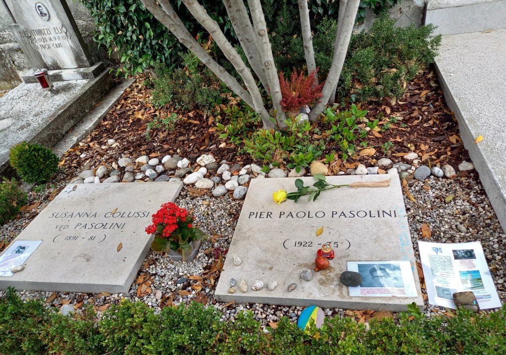 A pochi passi da loro, Pier Paolo riposa al fianco della madre Susanna alla quale è stato profondamente legato per tutta la vita, in una semplicissima tomba ombreggiata da un alloro, antico simbolo dei poeti. La tomba è meta di un pellegrinaggio continuo, ogni giorno ci puoi trovare cose diverse. Noi ci abbiamo trovato una macchinina, un disegno a matita con dedica e un melograno, simbolo di immortalità e di resurrezione.