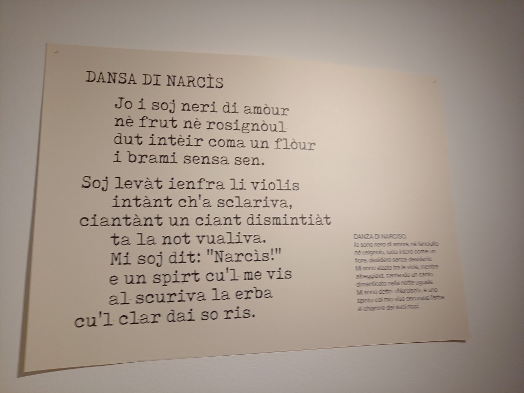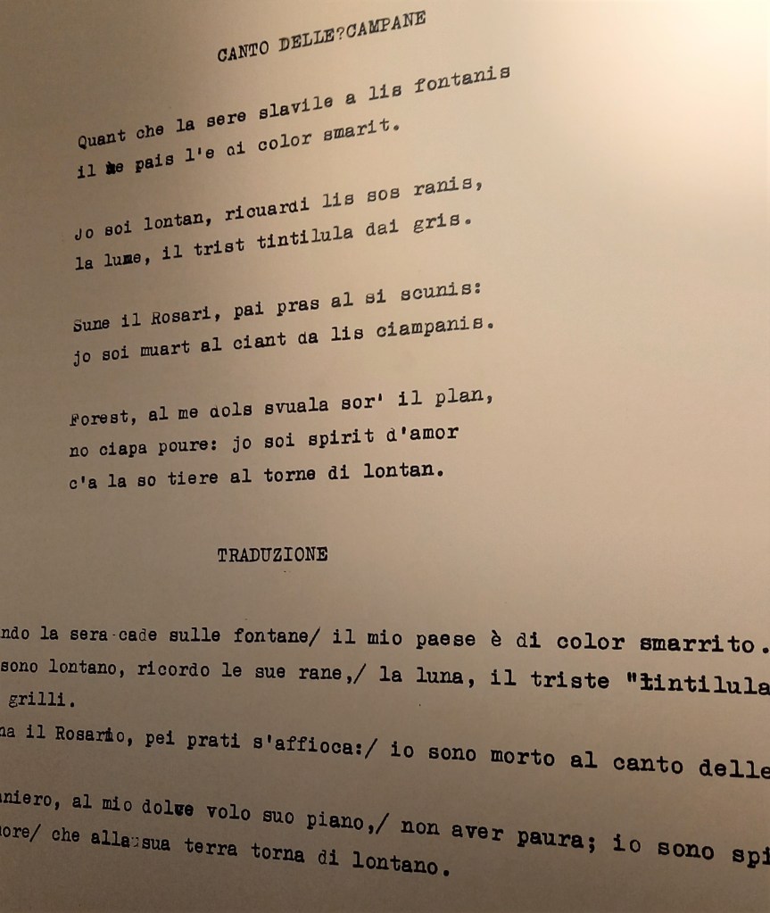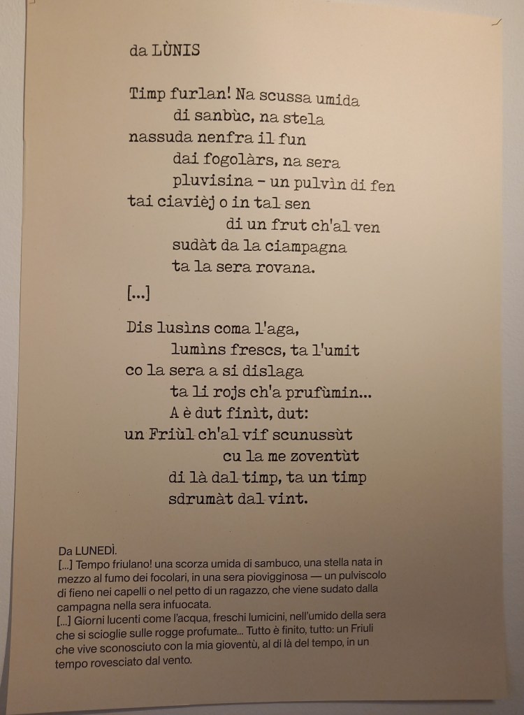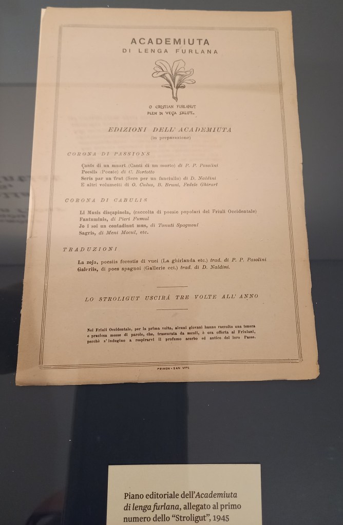Si può vedere anche la stanza, recentemente restaurata, che ospitò l’Academiuta di Lenga Furlana che Pasolini nel 1945 fondò con alcuni giovani appassionati di poesia e che si proponeva di rivendicare l’uso letterario del friulano, e in particolare di quello casarsese, quello della destra orografica del Tagliamento, contro l’egemonia di quello udinese. Da queste parti il veneto è sempre stato la lingua “alta” (era ovviamente la lingua della piccola nobiltà e della borghesia della Repubblica di Venezia), mentre il friulano era la lingua del popolo, ed è per questo che anche il giovane Pasolini la considerava la lingua più pura e più adatta alla poesia. E questo in un periodo in cui il friulano non aveva ancora come oggi la dignità di una lingua minoritaria europea, ma era considerato soltanto un dialetto. Per Pasolini invece i contadini friulani erano quasi delle divinità, li idealizzava mettendoli nel suo personale Olimpo. Quel mondo fatto di sudore, sacrifici, privazioni, spesso alcolismo, famiglie in cui le donne avevano un ruolo ben preciso e a volte subivano angherie, era comunque per lui il “suo” mondo e questo lo portava perfino a edulcorarne certi aspetti.
