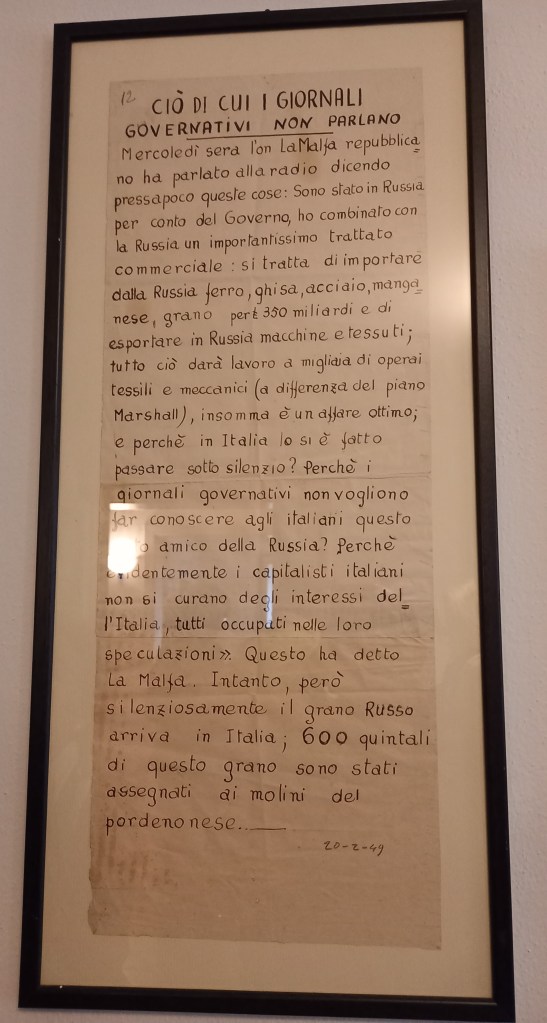Poi c’è l’importante fase “politica” del dopoguerra: Nel 1947 Pasolini si iscrisse al PCI di San Giovanni di Casarsa, di cui divenne segretario nel 1949. Qui si vedono i manifesti politici affissi sotto la vecchia loggia comunale di San Giovanni nelle domeniche del ’48.