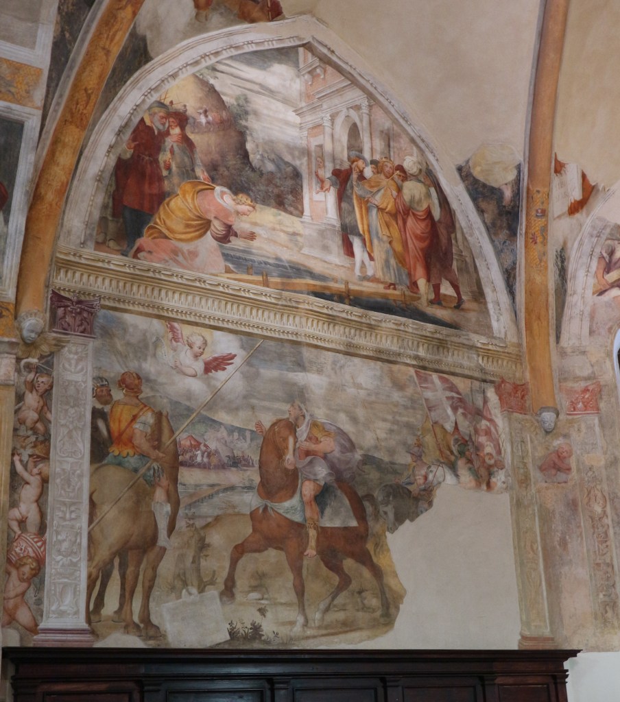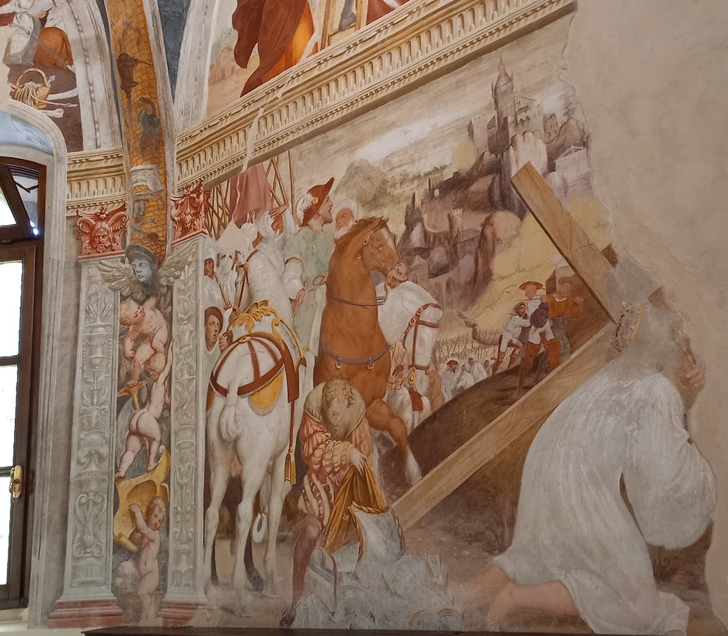 Gli affreschi che decorano il presbiterio della chiesa sono di Pomponio Amalteo e rappresentano scene legate alla storia della Santa Croce. Sono attribuibili all’Amalteo anche la Vergine col bambino, i santi sulla navata sinistra e la pala con la Deposizione. Un altro affresco rappresenta la battaglia di Ponte Milvio del 312 tra Costantino e l’usurpatore Massenzio, un soggetto frequente nell’arte sacra perché secondo alcuni cronisti dell’epoca l’evento segnò l’inizio della conversione di Costantino al Cristianesimo: Lattanzio narra che la notte prima della battaglia Costantino ebbe un sogno in cui gli fu detto di porre un simbolo cristiano sugli scudi dei suoi soldati; Eusebio racconta invece che Costantino e i suoi soldati ebbero una visione celeste inviata dal Dio cristiano.