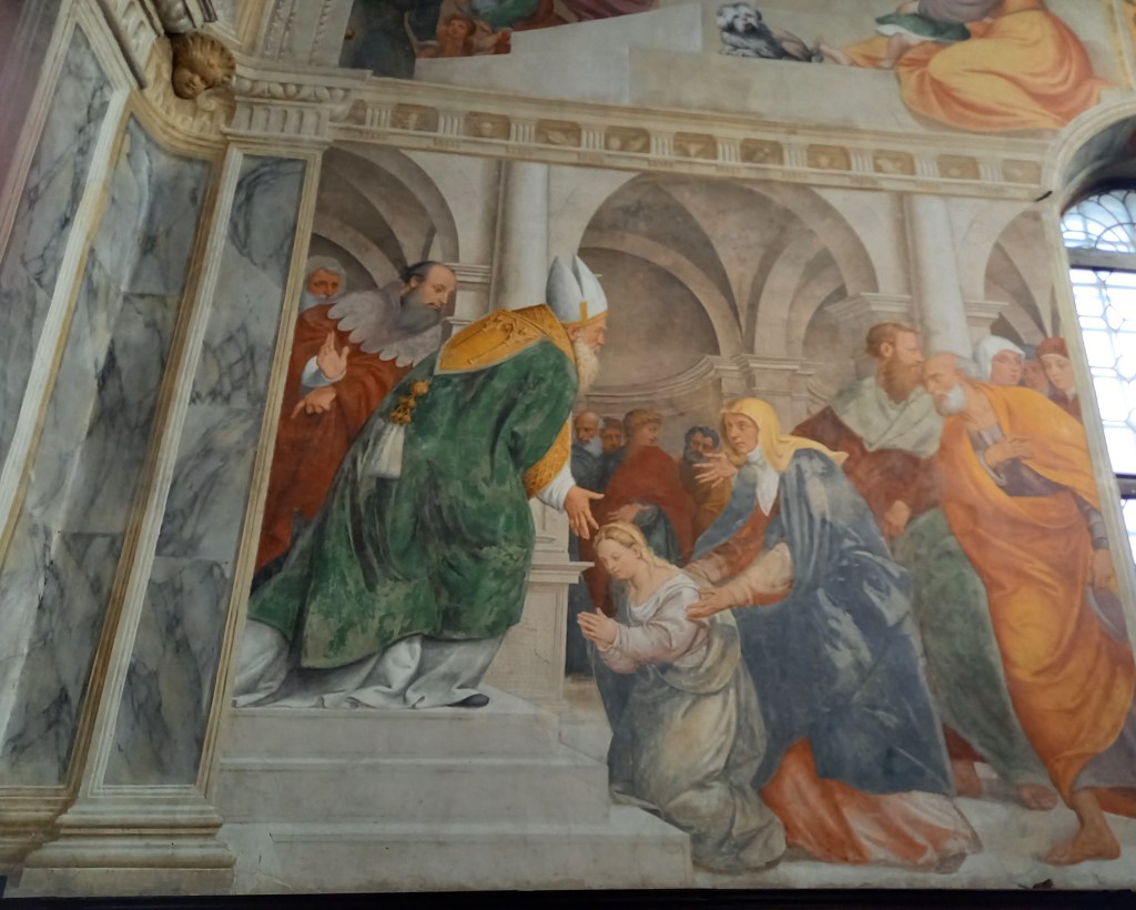 Le portelle presentano temi dell’Antico Testamento: nella parte esterna è raffigurata la Caduta della manna dal cielo, mentre nella parte interna, quando le portelle vengono aperte, è visibile il Sacrificio di Isacco (sull’anta sinistra) e il Sacrificio di Melchisedech (sulla destra). Numerosi interventi su canne e registri, eseguiti fra il XVII e il XIX secolo, finirono per stravolgere l’impostazione fonica rinascimentale originaria. All’inizio del XX secolo la manutenzione dell’organo, ormai divenuto insuonabile, venne interrotta e lo strumento fu, di fatto, abbandonato. L’organo subì un primo importante restauro fra il 1972 e il 1974, al quale ne seguì un altro nel 1999. Quest’ultimo restauro, condotto seguendo precisi criteri filologici, riportò lo strumento alle sue condizioni originarie. Tant’è vero che oggi possiamo sentirlo suonare.
