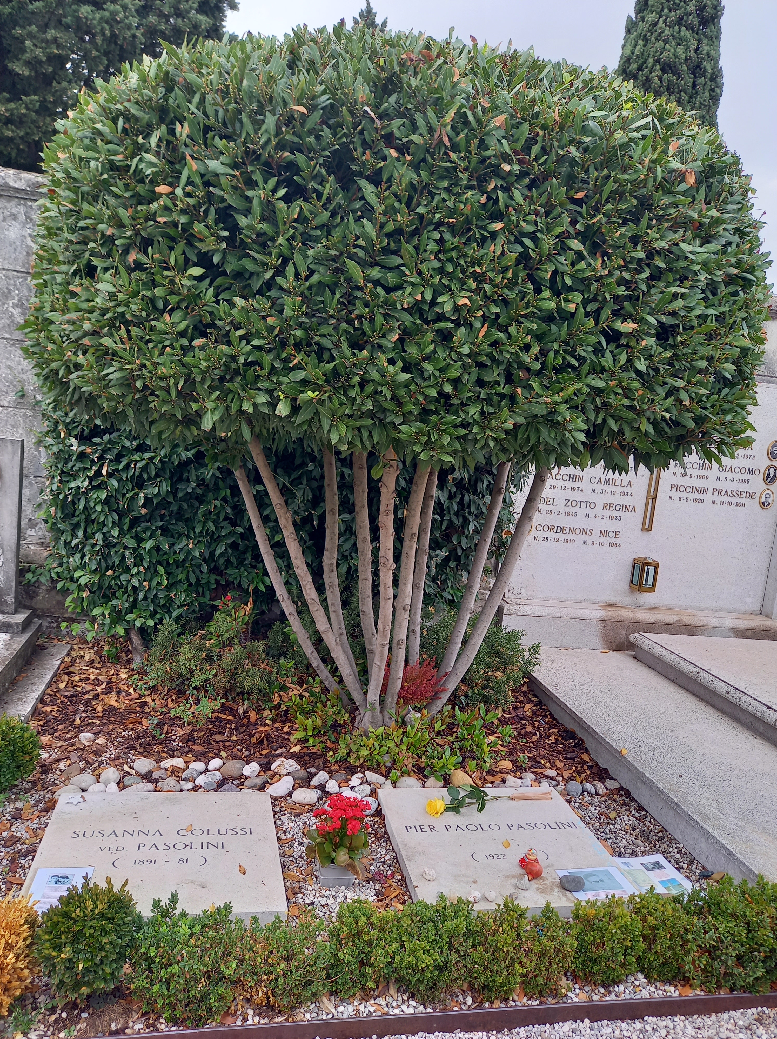 A pochi passi da loro, Pier Paolo riposa al fianco della madre Susanna alla quale è stato profondamente legato per tutta la vita, in una semplicissima tomba ombreggiata da un alloro, antico simbolo dei poeti. La tomba è meta di un pellegrinaggio continuo, ogni giorno ci puoi trovare cose diverse. Noi ci abbiamo trovato una macchinina, un disegno a matita con dedica e un melograno, simbolo di immortalità e di resurrezione.