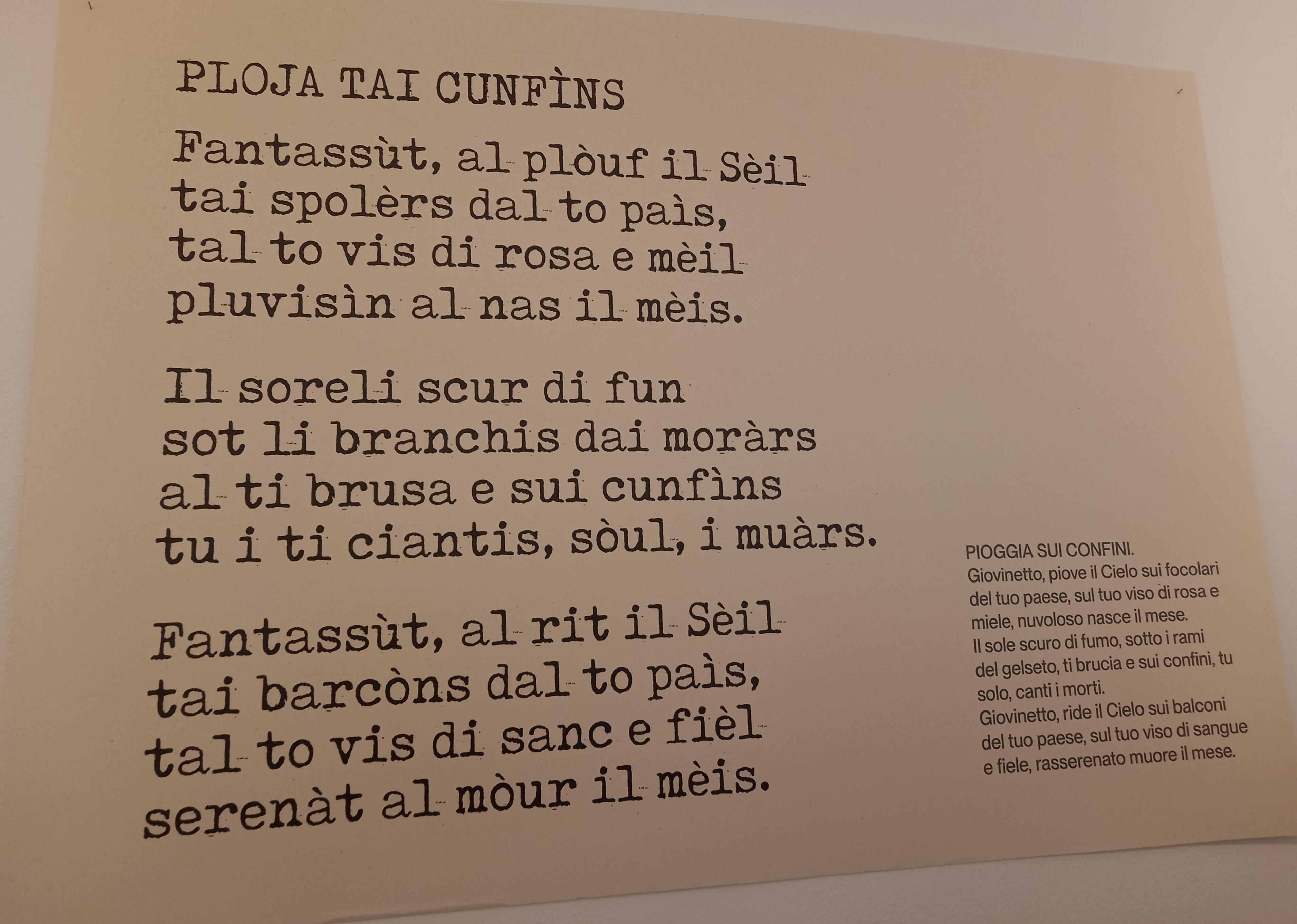 Si può vedere anche la stanza, recentemente restaurata, che ospitò l’Academiuta di Lenga Furlana che Pasolini nel 1945 fondò con alcuni giovani appassionati di poesia e che si proponeva di rivendicare l’uso letterario del friulano, e in particolare di quello casarsese, quello della destra orografica del Tagliamento, contro l’egemonia di quello udinese. Da queste parti il veneto è sempre stato la lingua “alta” (era ovviamente la lingua della piccola nobiltà e della borghesia della Repubblica di Venezia), mentre il friulano era la lingua del popolo, ed è per questo che anche il giovane Pasolini la considerava la lingua più pura e più adatta alla poesia. E questo in un periodo in cui il friulano non aveva ancora come oggi la dignità di una lingua minoritaria europea, ma era considerato soltanto un dialetto. Per Pasolini invece i contadini friulani erano quasi delle divinità, li idealizzava mettendoli nel suo personale Olimpo. Quel mondo fatto di sudore, sacrifici, privazioni, spesso alcolismo, famiglie in cui le donne avevano un ruolo ben preciso e a volte subivano angherie, era comunque per lui il “suo” mondo e questo lo portava perfino a edulcorarne certi aspetti.