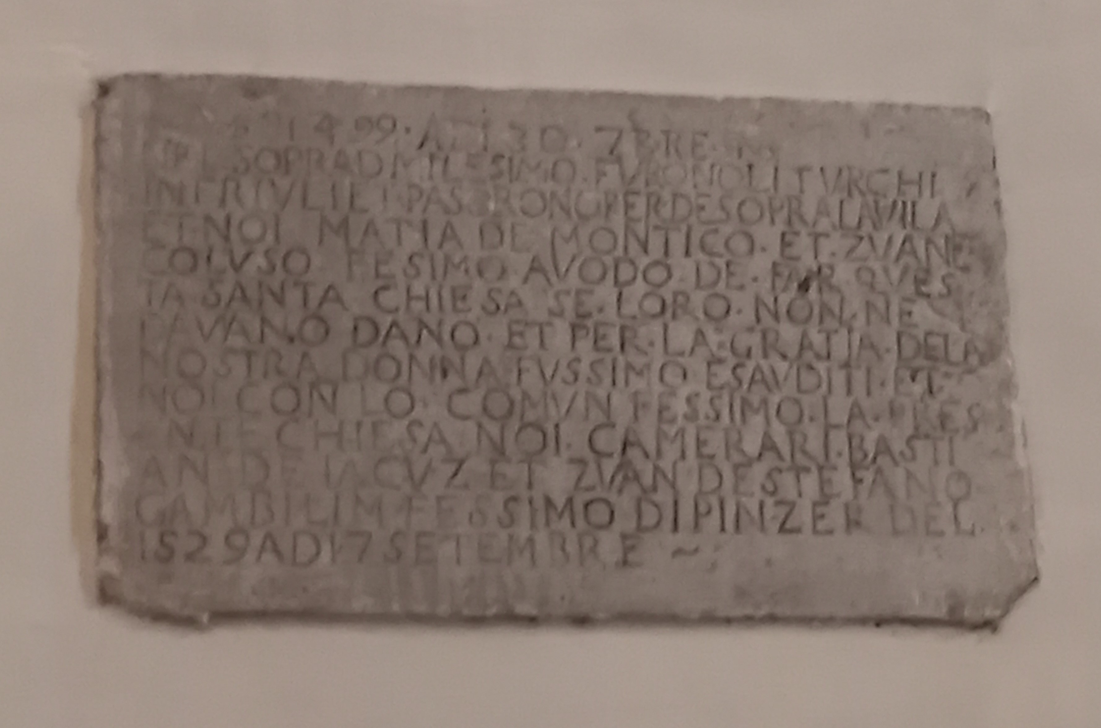 All’interno della chiesa si trova anche una lapide votiva che ricorda l’invasione dei turchi del 1499. Questa lapide proviene dalla chiesa della Beata Vergine delle Grazie, che venne portata a compimento con pitture e decorazioni nel 1529 in segno di ringraziamento della comunità per essere stata risparmiata dalle invasioni turche. A questa lapide è ispirato il dramma teatrale di Pasolini I Turcs tal Friul, un atto unico in friulano scritto nel 1944 e pubblicato postumo nel 1976, che è anche la sua unica opera teatrale.
