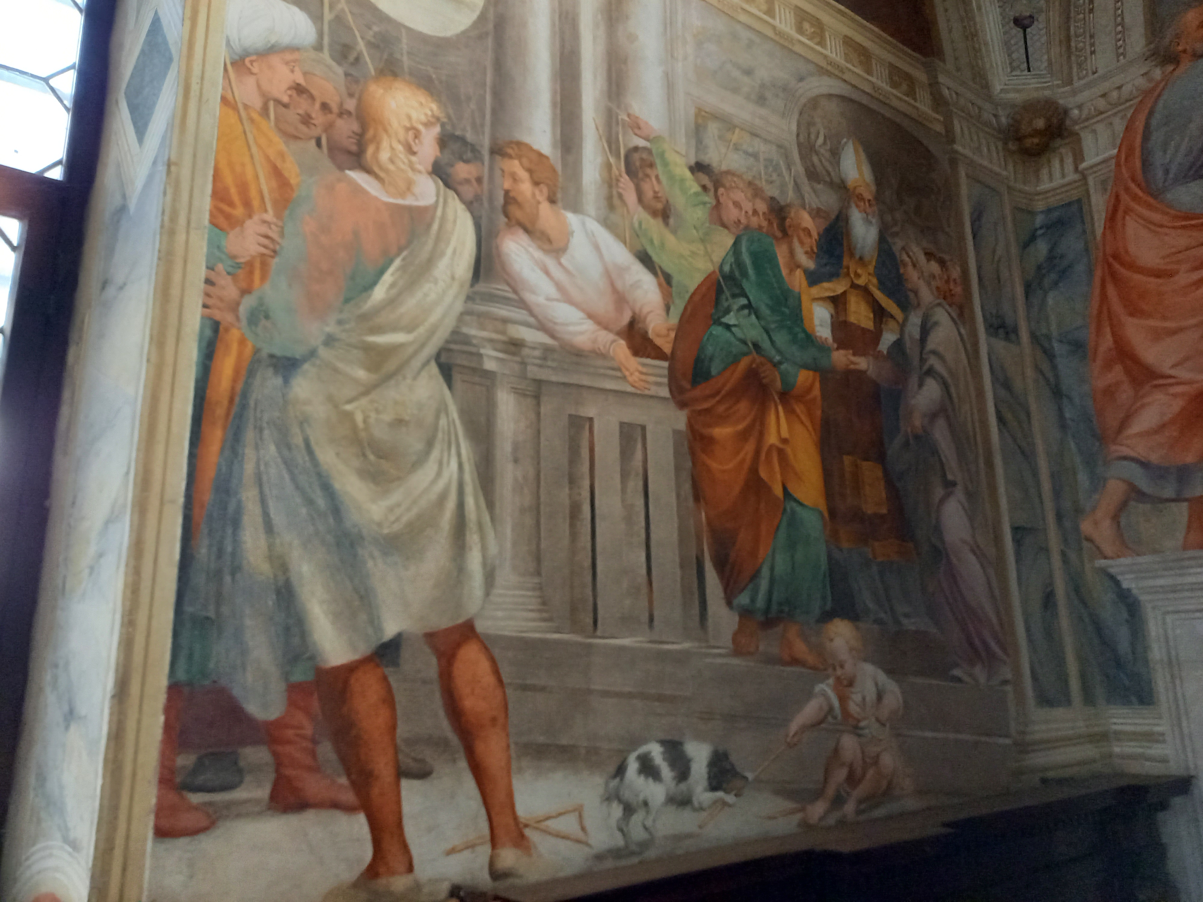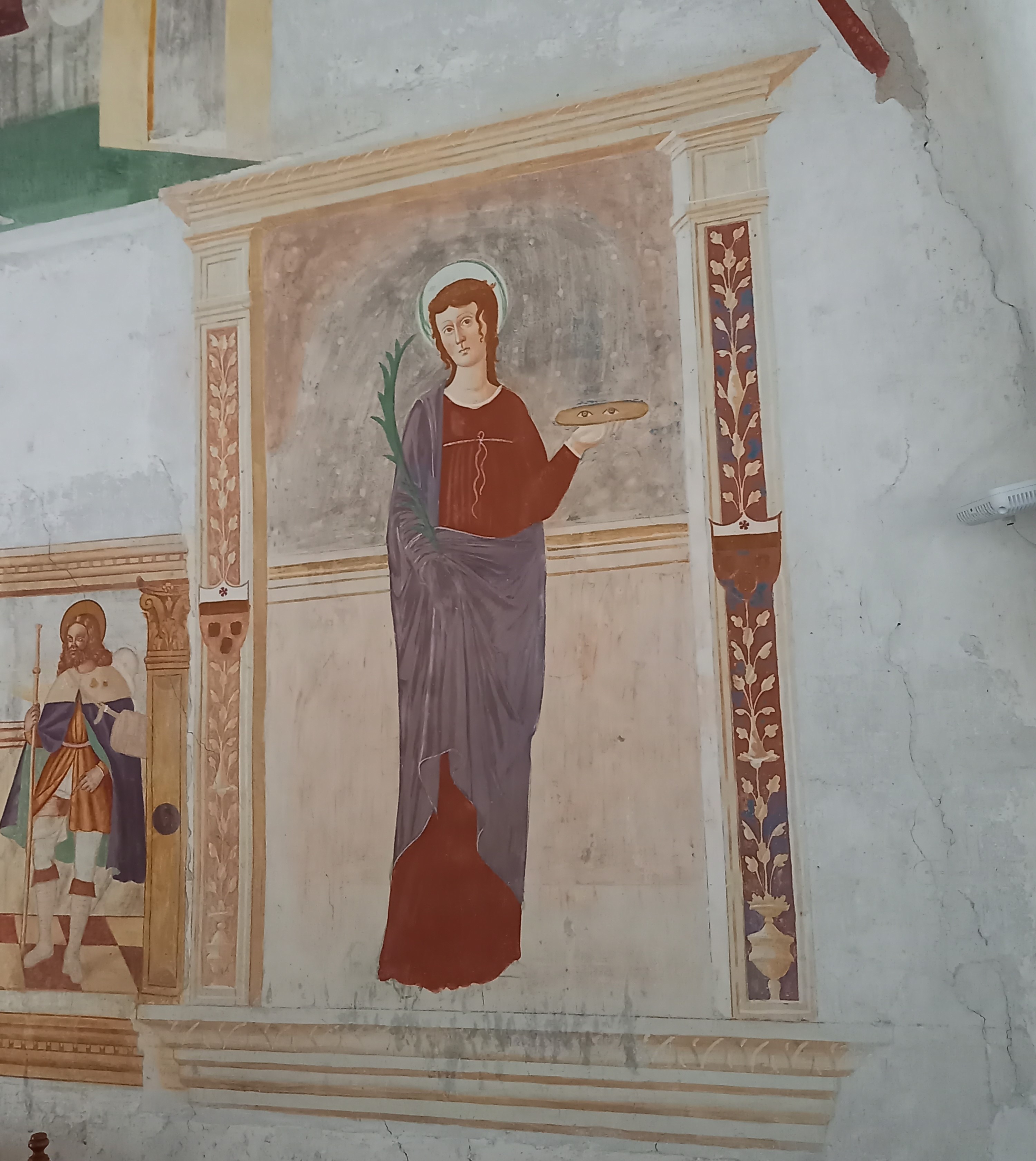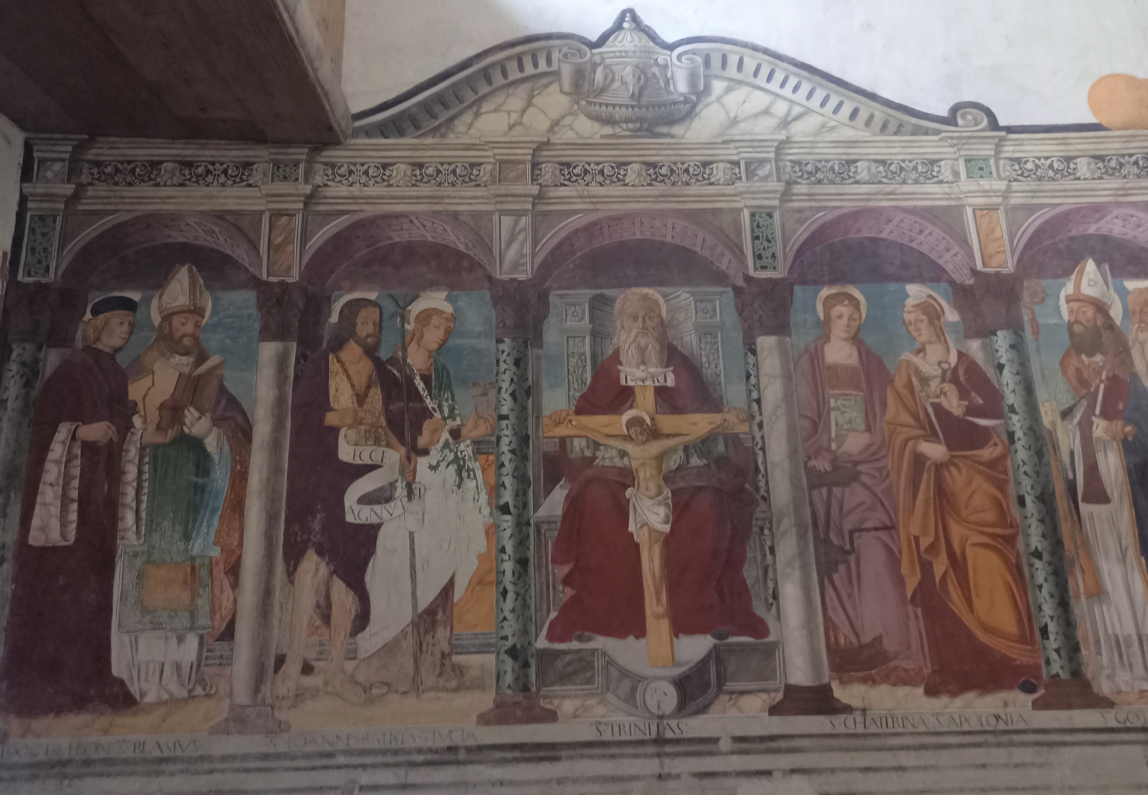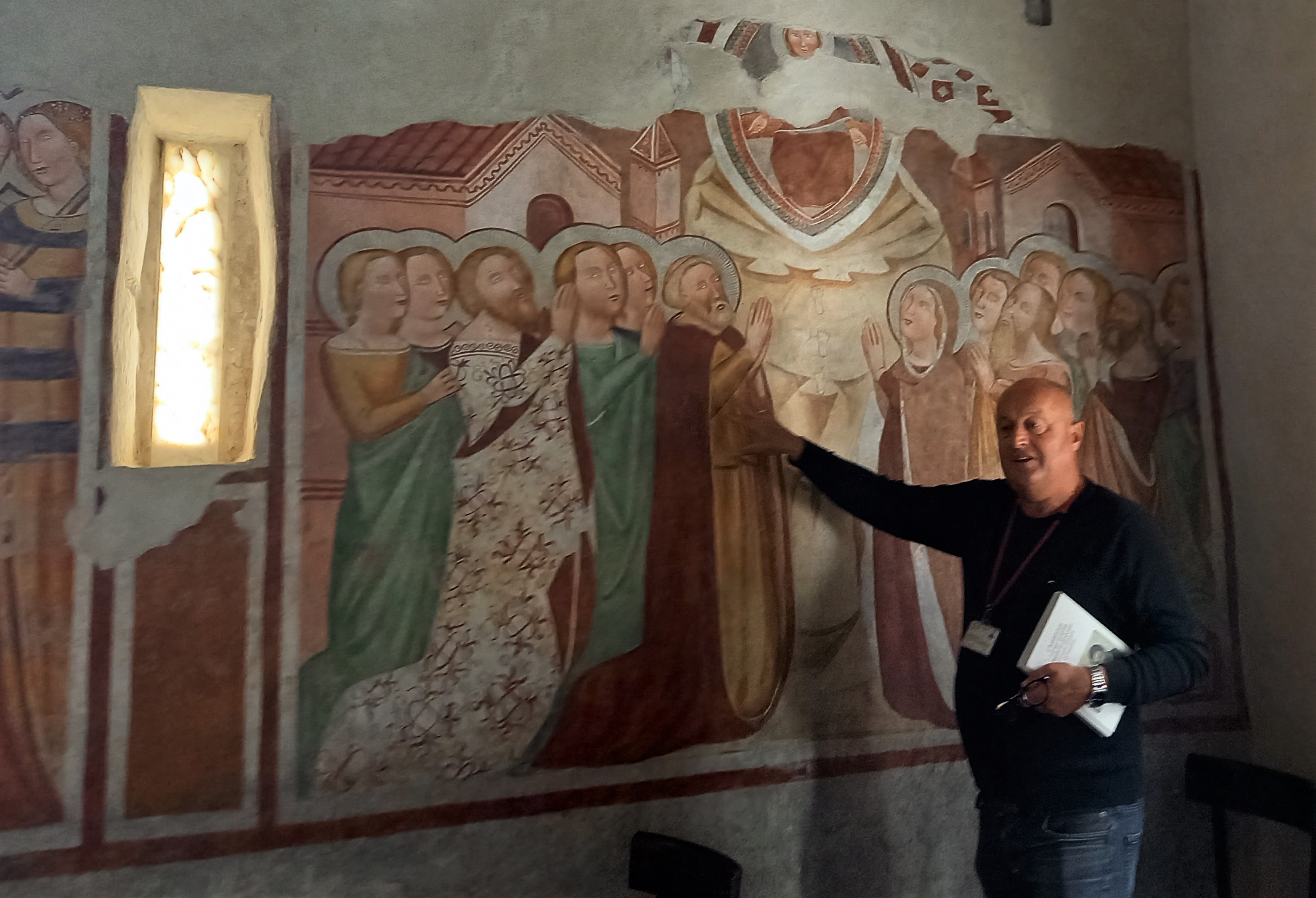 All’interno il ciclo affrescato della parete destra, raffigurante scene di Sant’Orsola, Santa Caterina e il Salvatore in gloria, attribuito a un artista facente parte della scuola di Vitale da Bologna e Tommaso da Modena, che operò tra il 1370 e il 1380. L’abside, dedicato all’incoronazione della Vergine, è di un artista che assume i modi di Masolino da Panicale. All’epoca della permanenza di Pasolini a Versuta, molti di questi affreschi erano nascosti da una spessa ricopertura. Così Pier Paolo e i suoi ragazzi si incaricarono di riportarli alla luce sfregando cipolle sull’intonaco, come consigliato proprio dall’amico pittore Federico De Rocco. E noi, in omaggio a quei ragazzi, abbiamo provato a “replicare” la loro foto davanti alla chiesa.