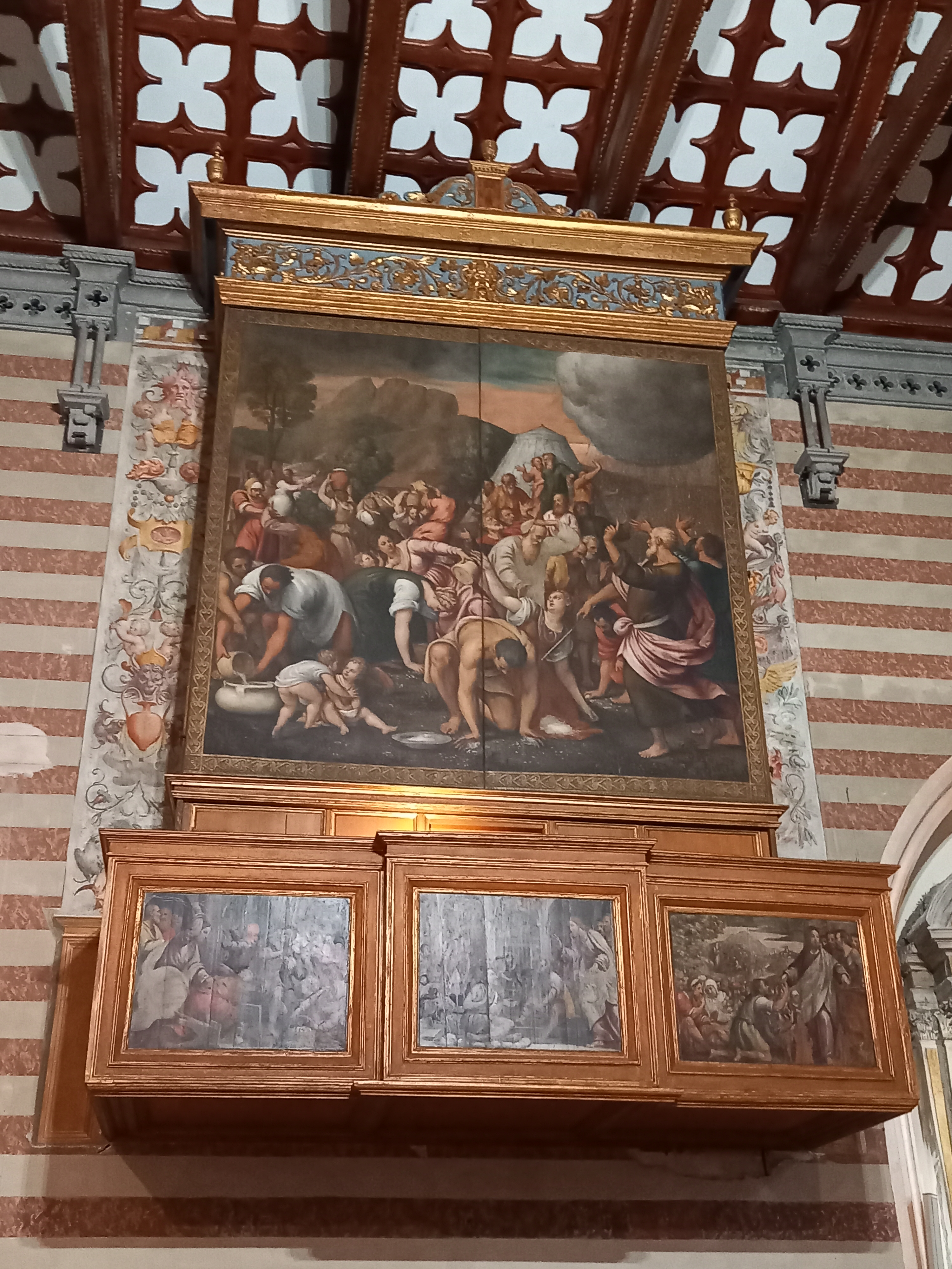 Le portelle presentano temi dell’Antico Testamento: nella parte esterna è raffigurata la Caduta della manna dal cielo, mentre nella parte interna, quando le portelle vengono aperte, è visibile il Sacrificio di Isacco (sull’anta sinistra) e il Sacrificio di Melchisedech (sulla destra). Numerosi interventi su canne e registri, eseguiti fra il XVII e il XIX secolo, finirono per stravolgere l’impostazione fonica rinascimentale originaria. All’inizio del XX secolo la manutenzione dell’organo, ormai divenuto insuonabile, venne interrotta e lo strumento fu, di fatto, abbandonato. L’organo subì un primo importante restauro fra il 1972 e il 1974, al quale ne seguì un altro nel 1999. Quest’ultimo restauro, condotto seguendo precisi criteri filologici, riportò lo strumento alle sue condizioni originarie. Tant’è vero che oggi possiamo sentirlo suonare.