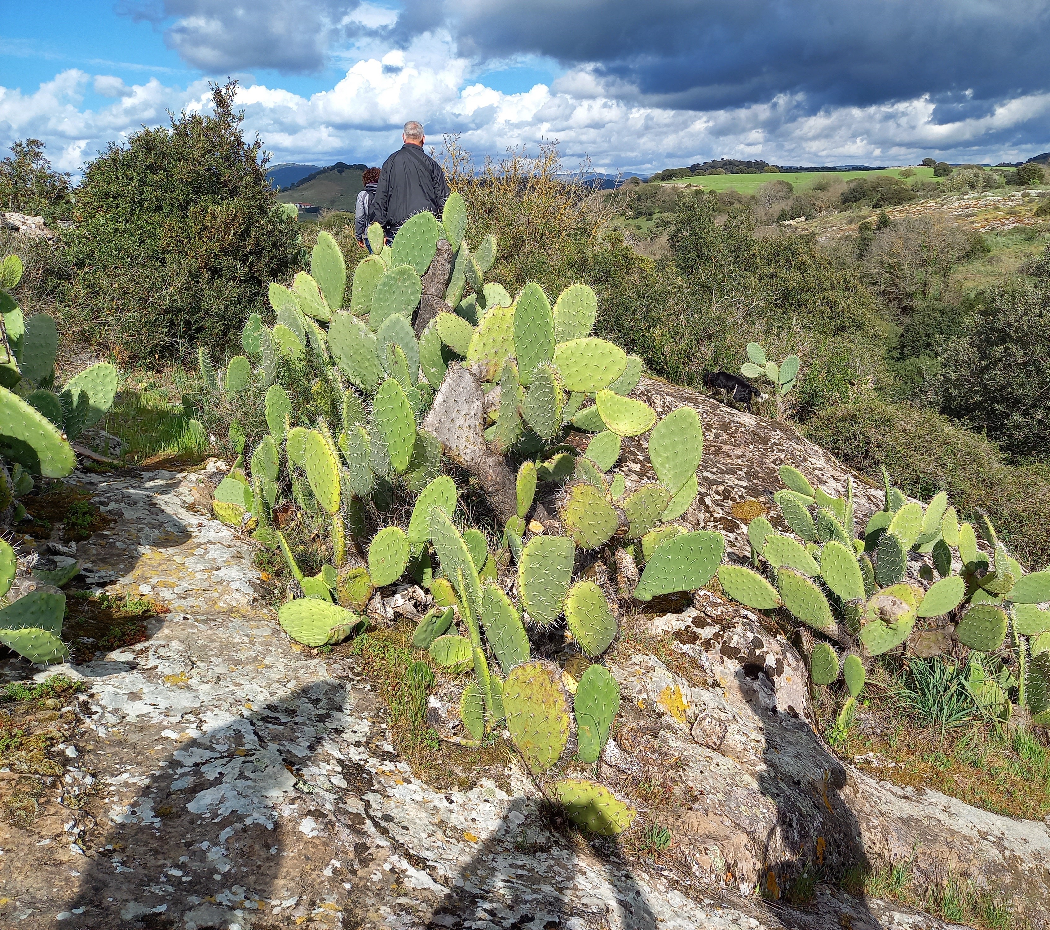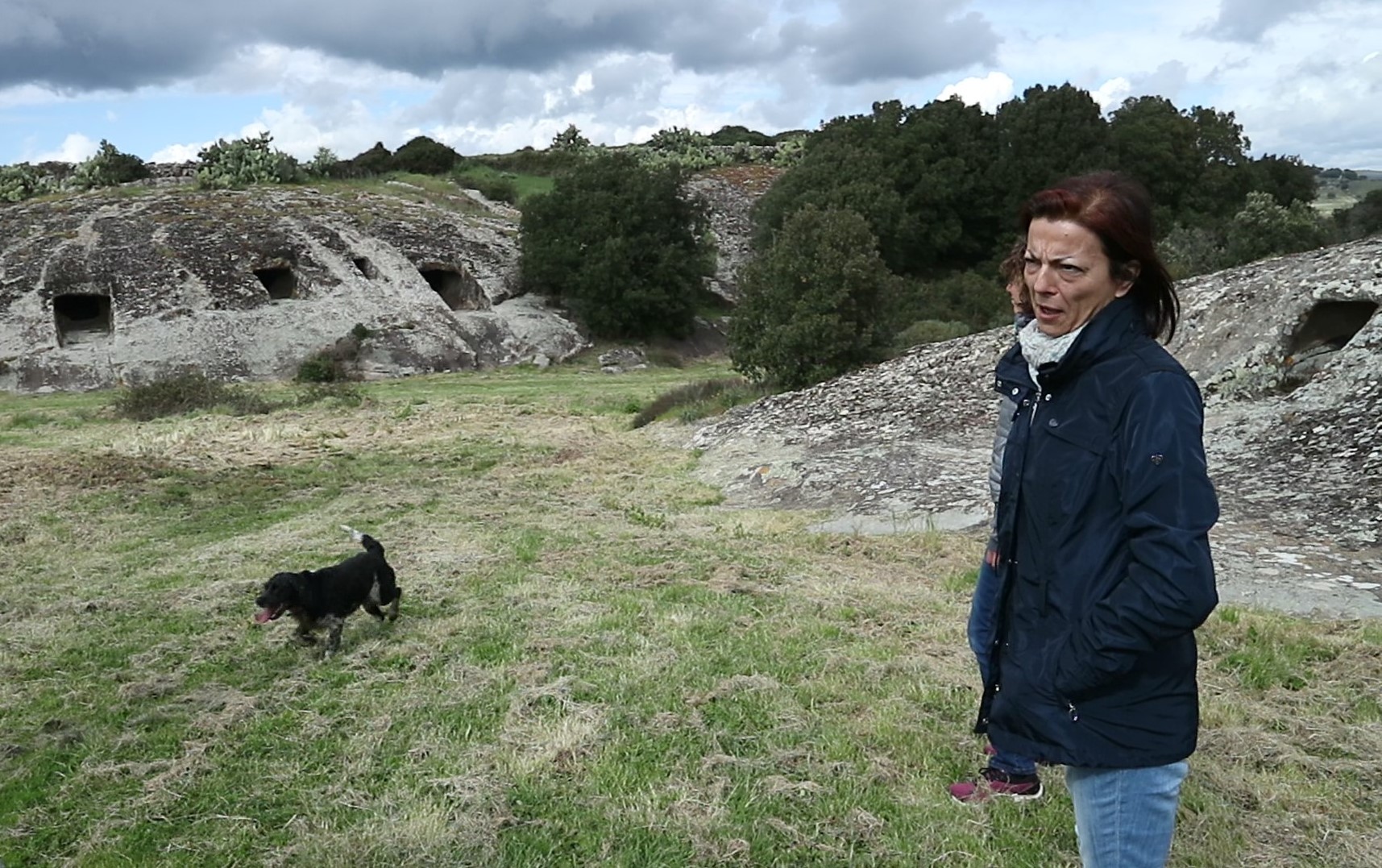 Fatte sempre al volo (e come se no?) le presentazioni, ci dirigiamo verso Villa Sant’Antonio, nell’alta Marmilla. Il clima è fresco, c’è un pallido sole (pallido per essere in Sardegna) ma il cielo tende a rannuvolarsi. A Villa Sant’Antonio ci aspetta una coppia che fa parte dell’estesissima rete di contatti locali, in grado di raccontare il loro territorio come nessuno, che le Mariposas hanno creato negli anni. Sono Roberto Saccu e Ilaria Marongiu di Boghes, un’associazione che valorizza il territorio con performance artistiche immerse nella natura e nei siti archeologici. Roberto è il presidente dell’associazione e Ilaria, che nella vita insegna disegno e storia dell’arte, è anche lei stessa un’artista che si occupa soprattutto di iconografia al femminile. Oggi però si sono portati anche un valido e instancabile… aiutante di campo a quattro zampe, che di nome fa Ghibli ed è un cane da tartufi (ebbene sì, anche in Sardegna ci sono i tartufi!) che con loro ci accompagnerà alla scoperta delle Domus de Janas.