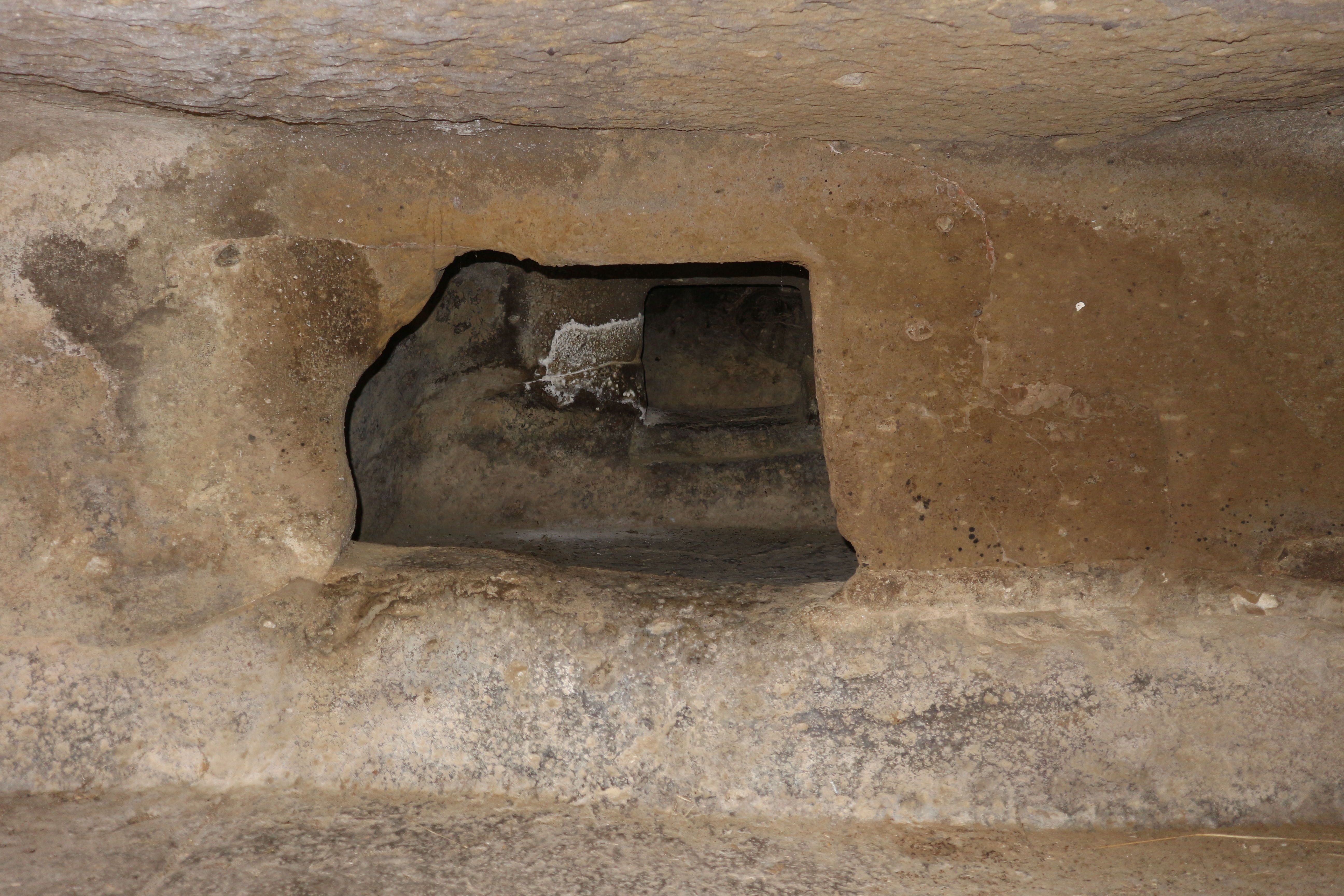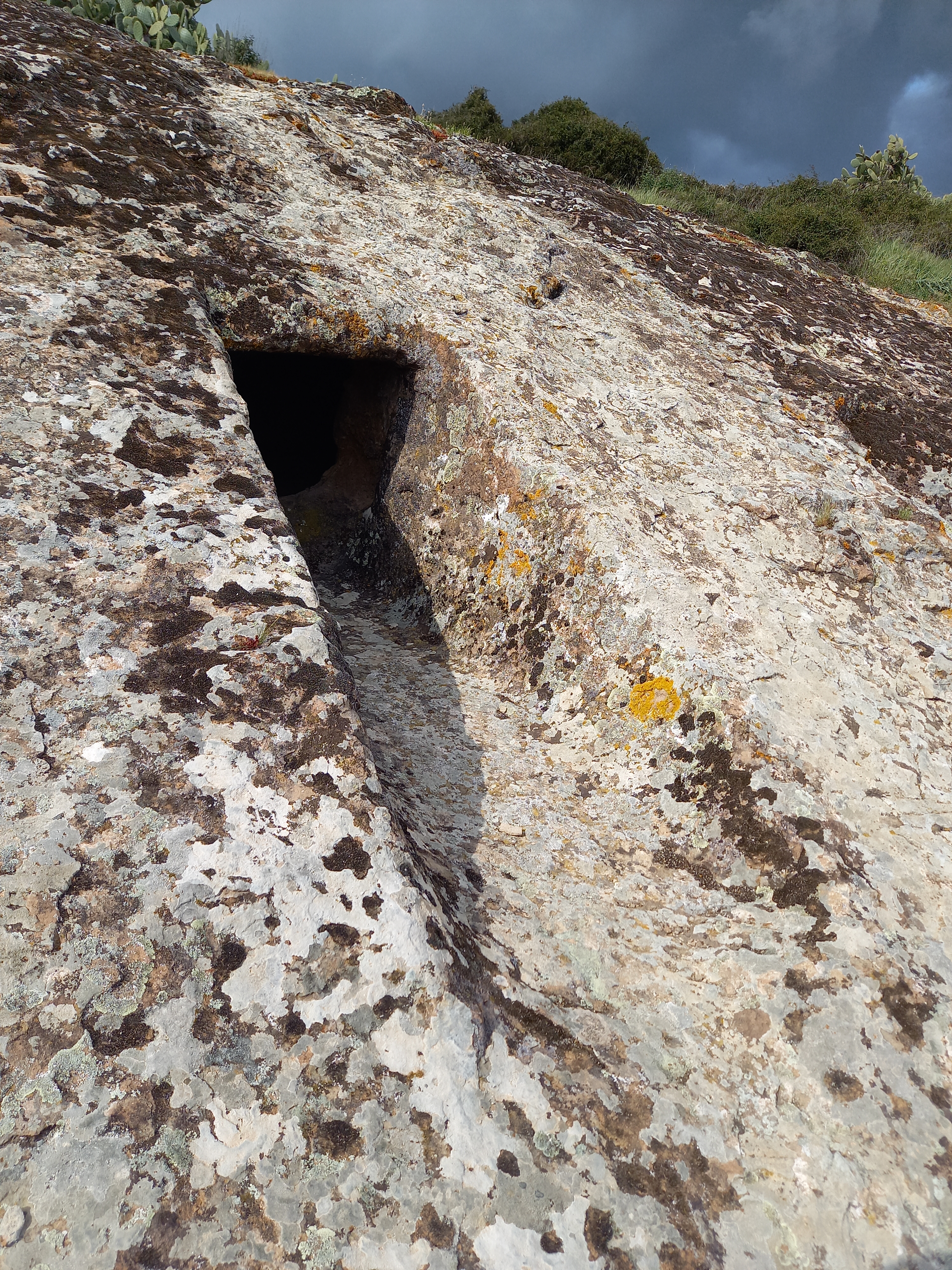 La cultura di San Michele è quella del periodo che si avvicina alla prima età del Bronzo, quindi nella fase di passaggio della fine del neolitico che è caratterizzata dalla conoscenza del rame. Insomma, siamo in una “casa” che esiste da più o meno 5000 anni. La prima domus è caratterizzata da una sorta di sedile, su cui ci sono leggende molto interessanti: pare che avesse a che fare anche con la nascita. Quindi, se fosse così avremmo davvero morte e vita insieme. È anche molto alta rispetto alle altre, e ha un dromos monumentale: Una specie di antecedente del Tesoro di Atreo, detto anche Tomba di Agamennone, che è una maestosa tomba a tholos situata nei pressi della Rocca di Micene, in Grecia. C’era un focolare, che qui non si vede bene ma si può vedere nelle altre domus. Questa pietra è facilmente lavorabile, quindi poteva essere scavata anche con una pietra più dura, o col rame. Nella parte sommitale, e anche sui lati, c’è un’interessante serie di incisioni.