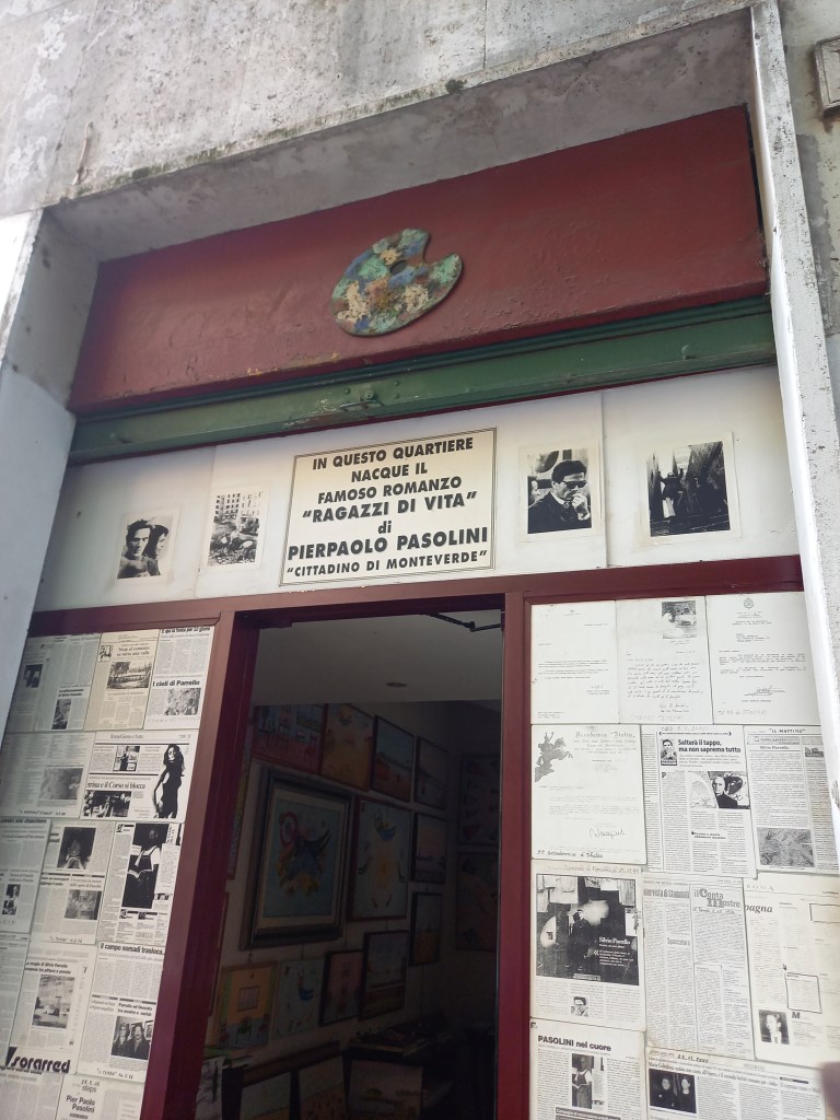 Ci troviamo a Monteverde nuovo, quella parte del quartiere che ai tempi di Pasolini era la borgata Donna Olimpia, una delle più citate in Ragazzi di vita, perché ci abitavano il Riccetto e parecchi dei suoi amici e compagni di scorribande. Donna Olimpia, come altre borgate, nasce dalla volontà fascista di allontanare il sottoproletariato dal centro della città; allora era abitata da molti sfollati, baraccati, molti che come il Riccetto dormivano nella scuola Franceschi, quella scuola di cui Pasolini raccontò fedelmente proprio in quel romanzo il crollo di un tetto. Silvio ci aspetta davanti al suo laboratorio di pittore, che è anche un piccolo museo pasoliniano informale. Claudio lo conosce già, per averlo intervistato l’anno scorso per il podcast “Le geografie di Pasolini”, prodotto da Radio Popolare in occasione del centenario pasoliniano. Colgo l’occasione per consigliarvelo vivamente, lo trovate sul sito della radio nella sezione podcast.