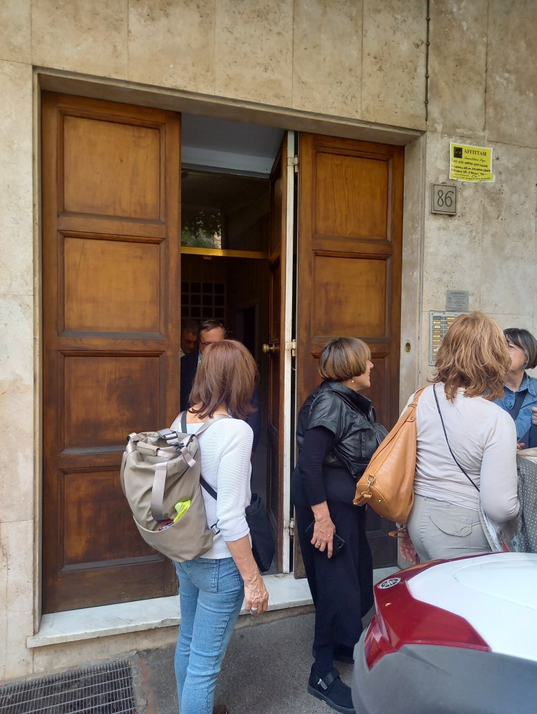 Ora ci godremo questa primavera romana, con il sole che già scalda l’aria del mezzogiorno di un giovedì di inizio maggio, e faremo un percorso che, ne siamo sicuri, ci farà scoprire una Roma insolita e ci farà conoscere e apprezzare ancora di più, se possibile, uno dei più grandi intellettuali italiani del Novecento. È un viaggio, naturalmente, targato ViaggieMiraggi e Radio Popolare, e perciò il gruppo non poteva che essere guidato da Claudio Agostoni, che già aveva guidato da par suo la nostra incursione in terra friulana. Siamo undici, contando anche Claudio e sua moglie Rossana. Il gruppo è a predominanza milanese, ma non mancano presenze da Bergamo, dalla Brianza (Carate, per l’esattezza) e dall’Emilia (Modena e Parma).