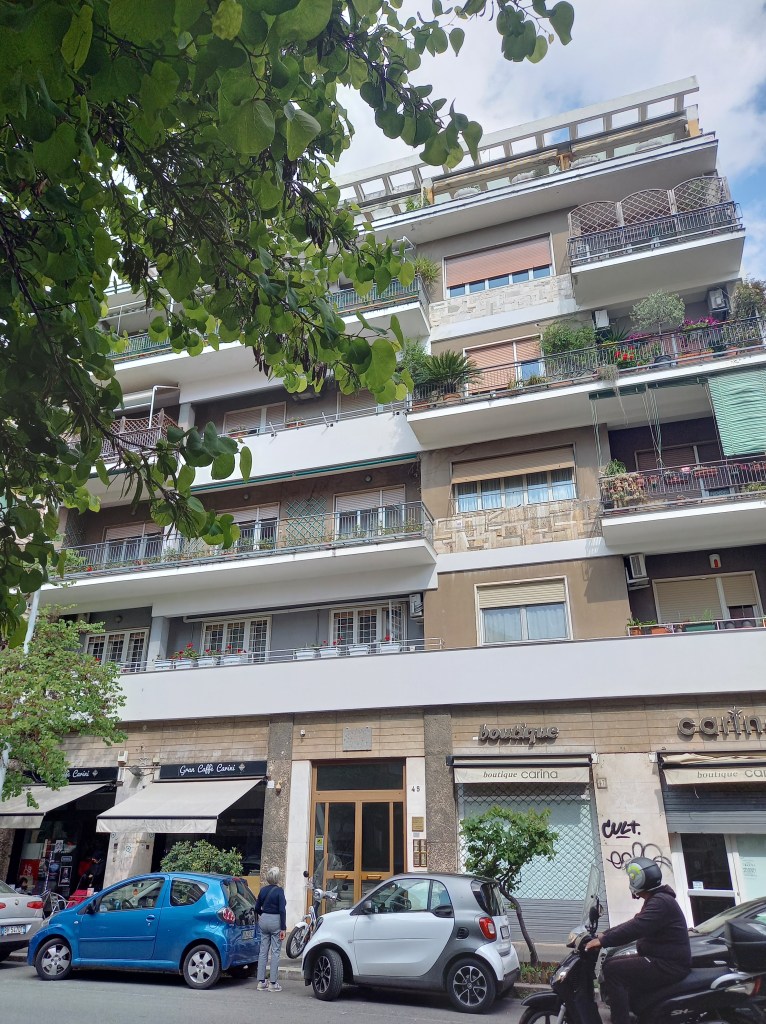 Nel 1959, dopo la morte del padre, si spostarono poco lontano, in via Carini al 45, un altro palazzo qualunque di una zona oggi abbastanza da “ceto medio”, ma stavolta con la targa di marmo all’esterno, sopra il portone. Da qui si sarebbero poi trasferiti nel 1963 all’EUR, dove rimasero fino alla morte dello scrittore.