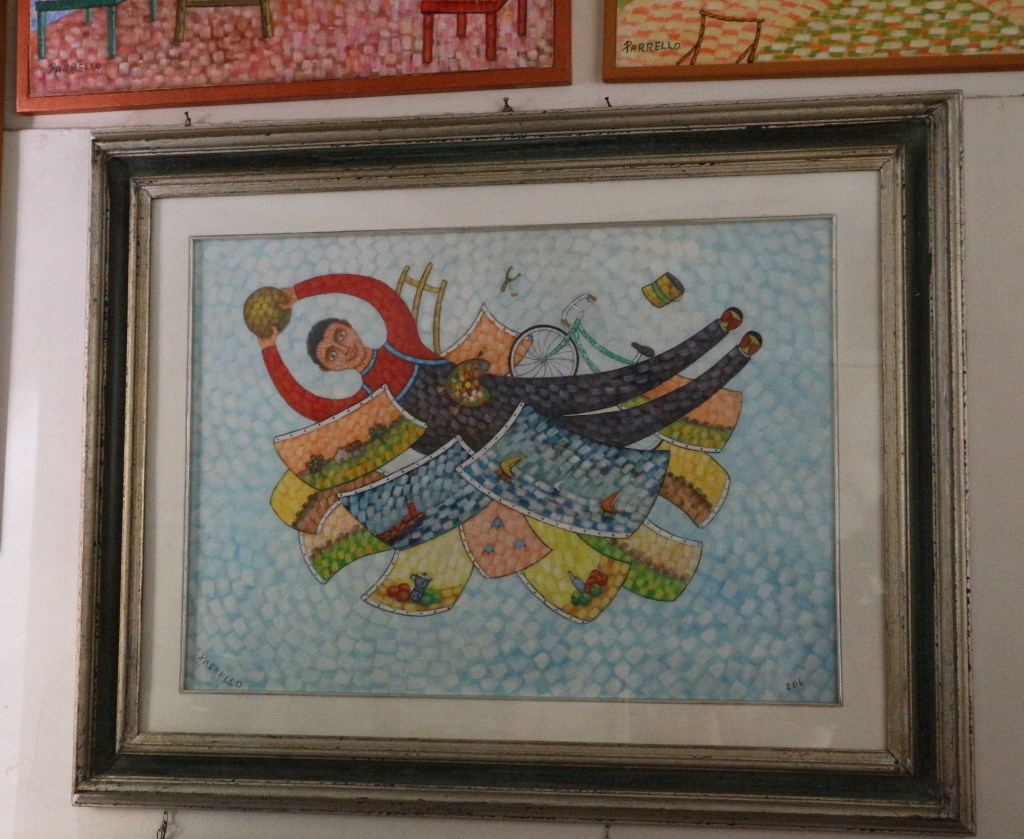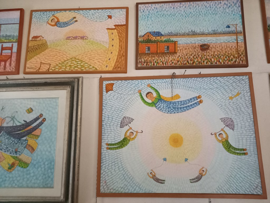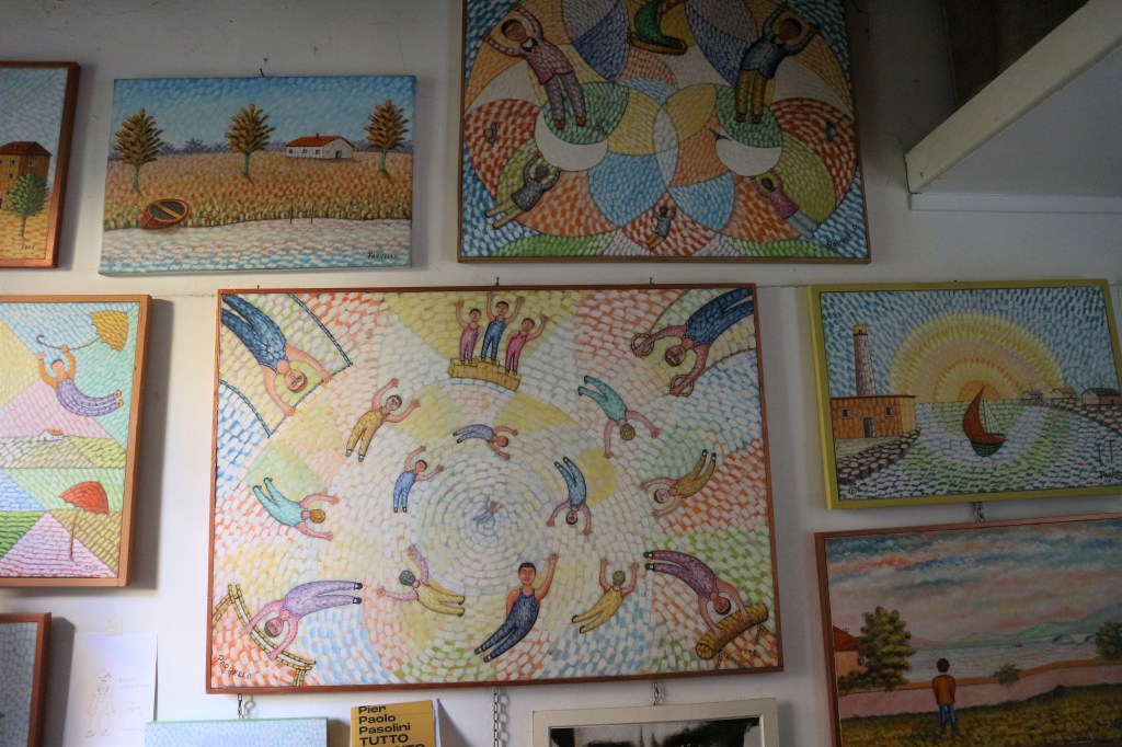 Abbiamo concluso l’incontro con lui nel suo piccolo studio di via Ozanam, dove le immagini e i memorabilia pasoliniani convivono con i suoi quadri. Come pittore ha uno stile che ricorda un po’ Chagall (e lui non nega che qualcosa di chagalliano ci sia, come ispirazione), ma con una tecnica a mosaico che è effettivamente tutta sua. E anche come poeta non è niente male. Sentitelo declamare questa sua poesia dedicata all’aquilone.